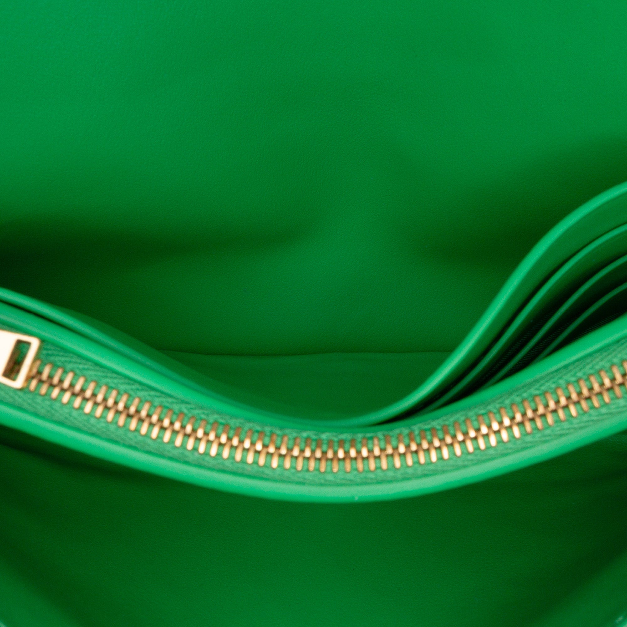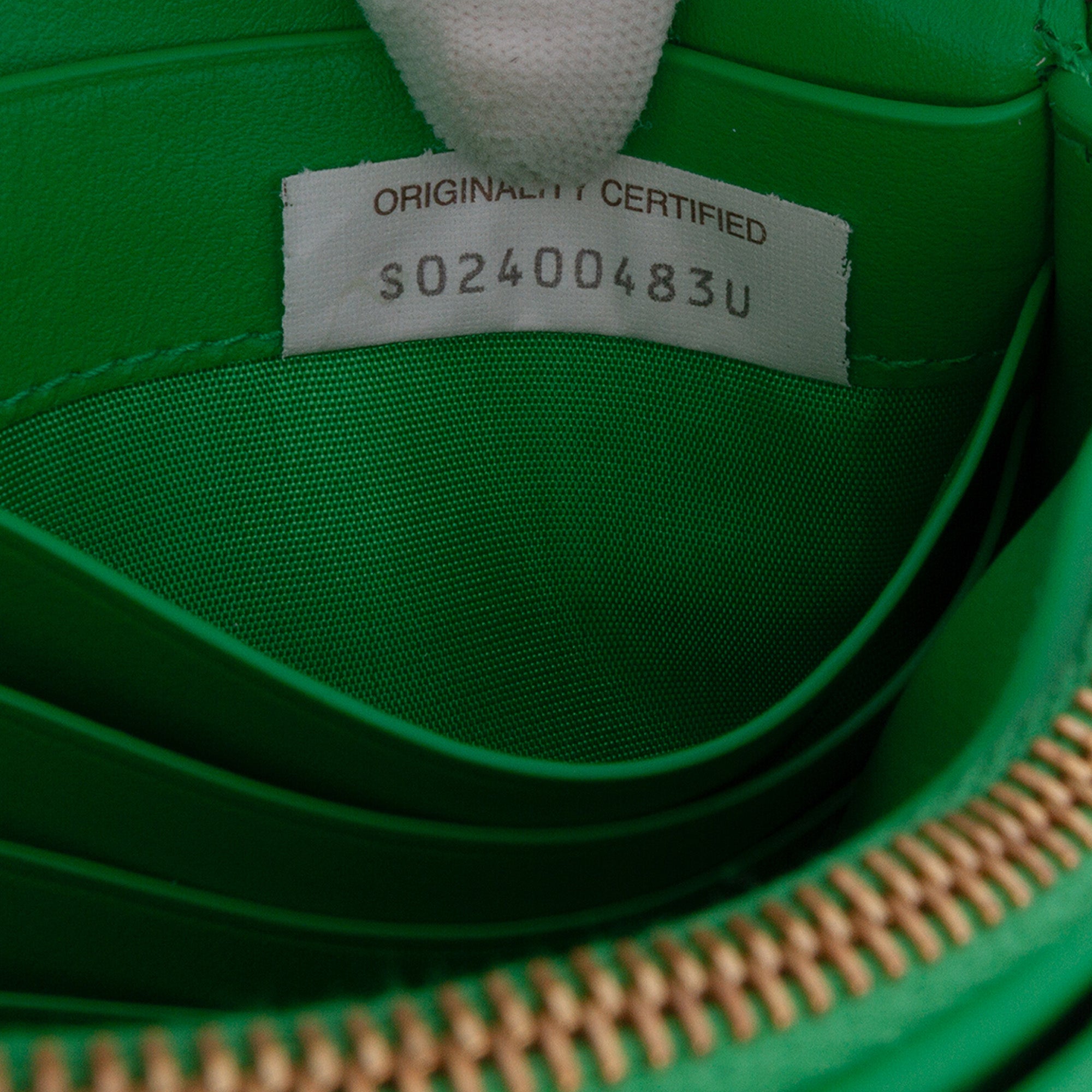 This wallet on chain features a woven leather body, a leather strap, a front flap with clasp button closure, and interior zip and slip pockets. Inclusion: Dust bag. Retail Price: 1300.00