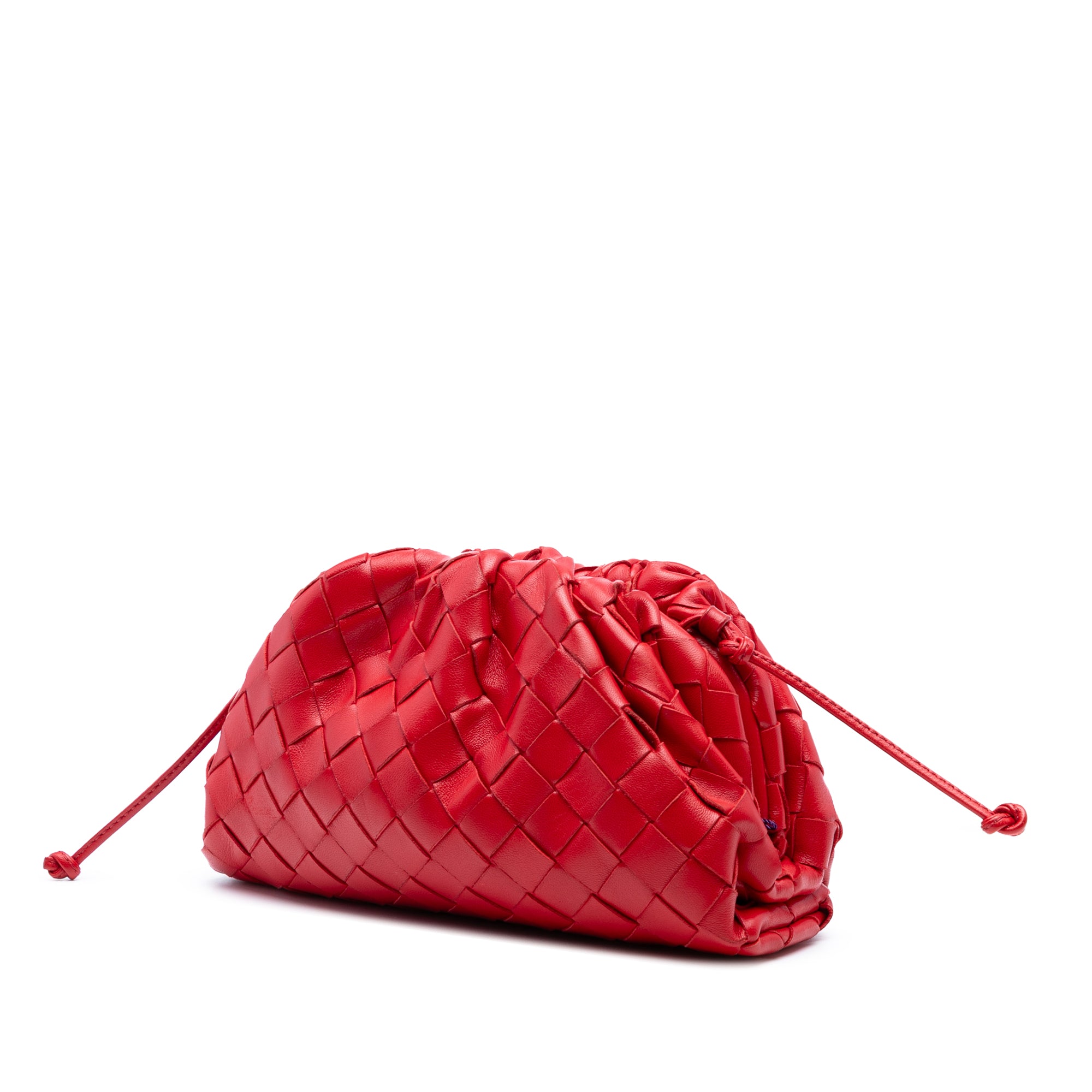 The Mini Pouch features a woven leather body, a flat leather strap, and a top magnetic snap closure. Retail Price: 2500.00