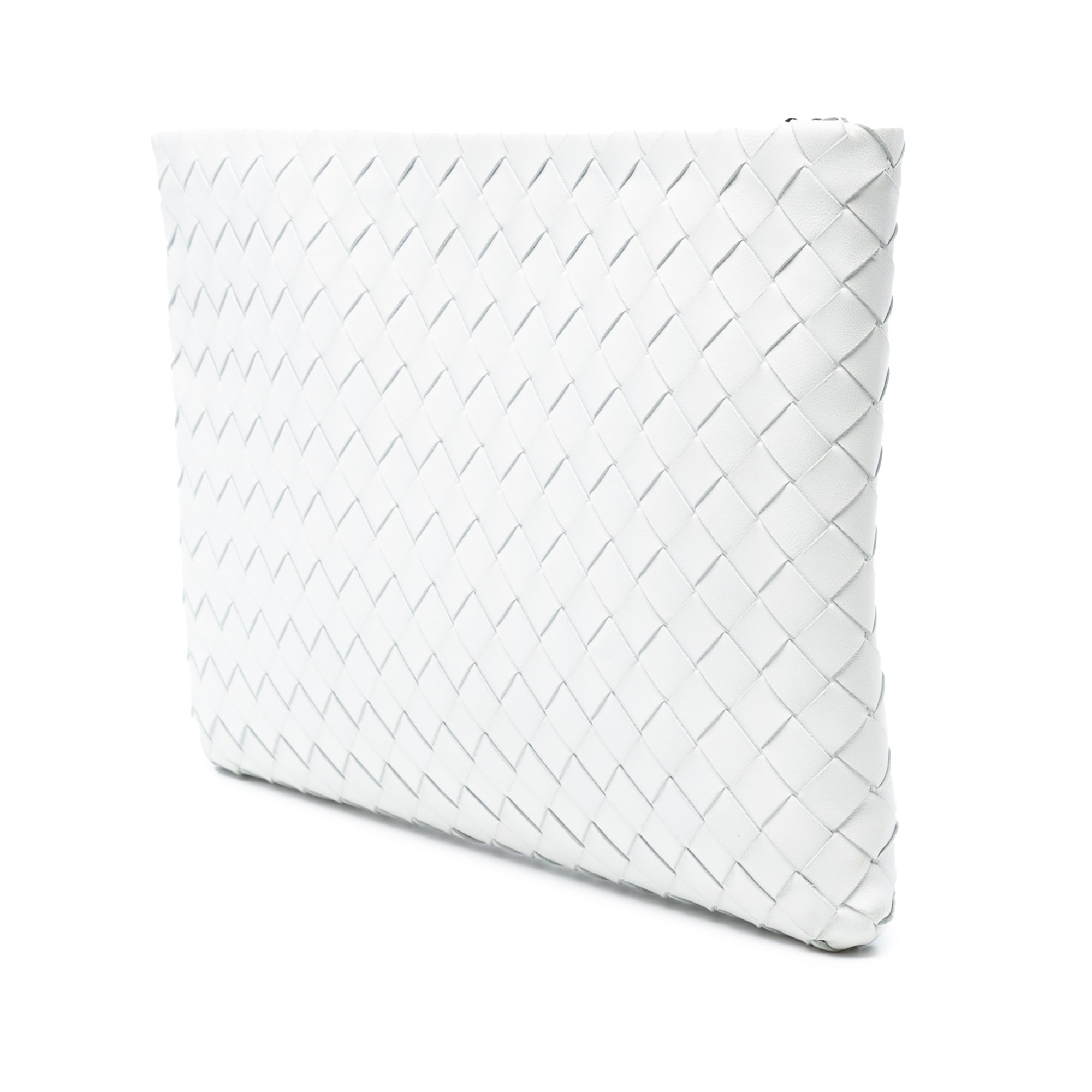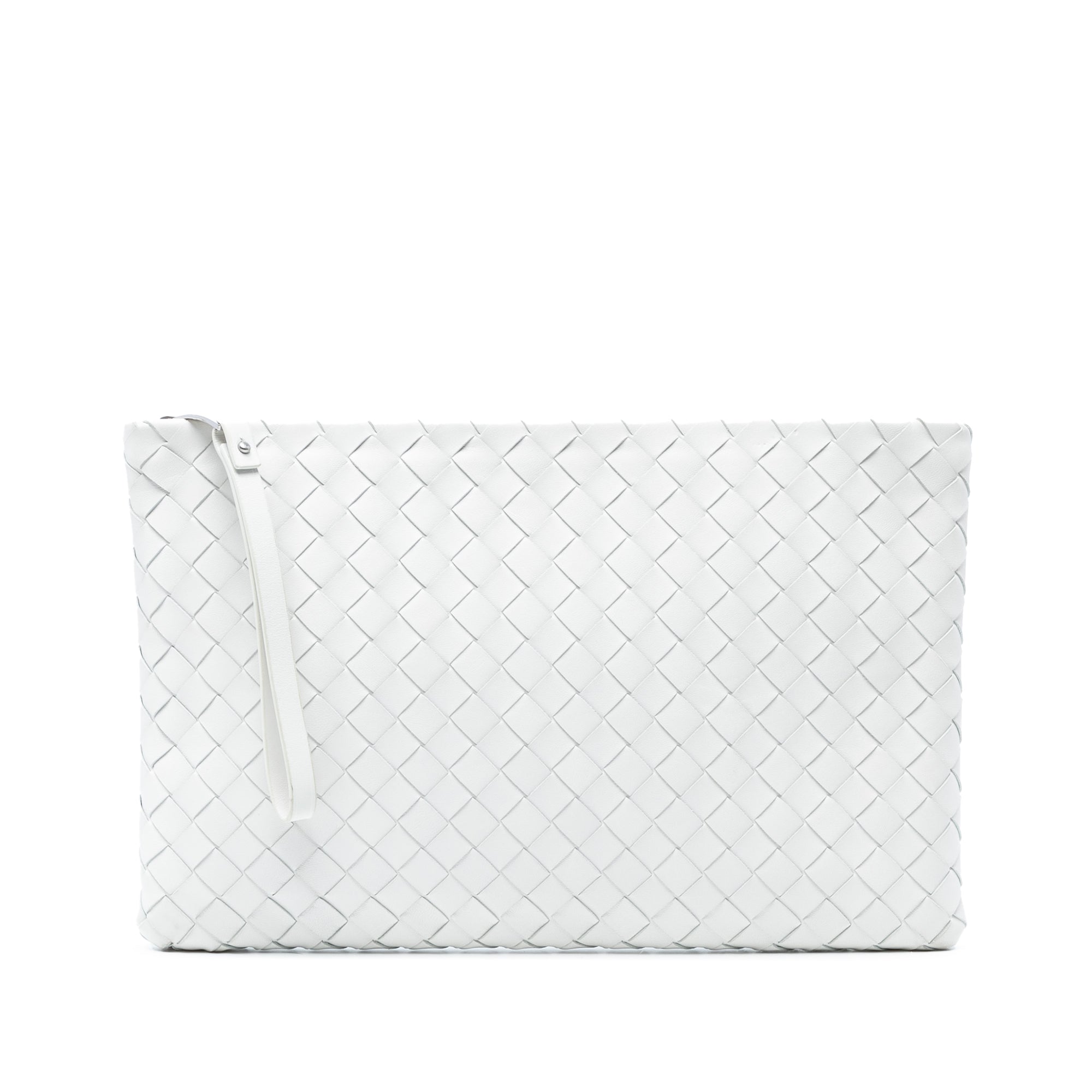 This clutch bag features a woven leather body, a flat leather wrist strap, and a top zip closure. Inclusion: Dust bag. Retail Price: 1499.00