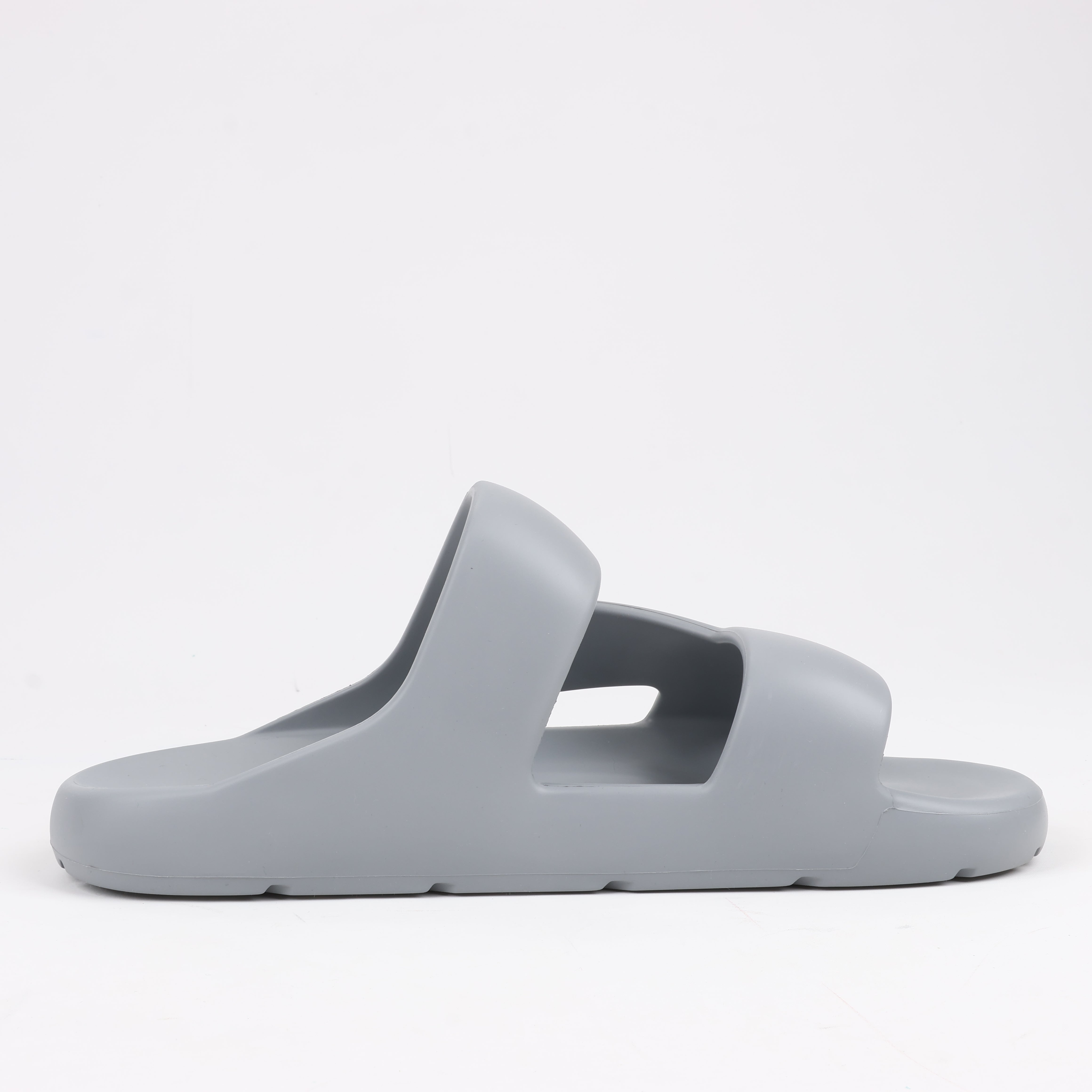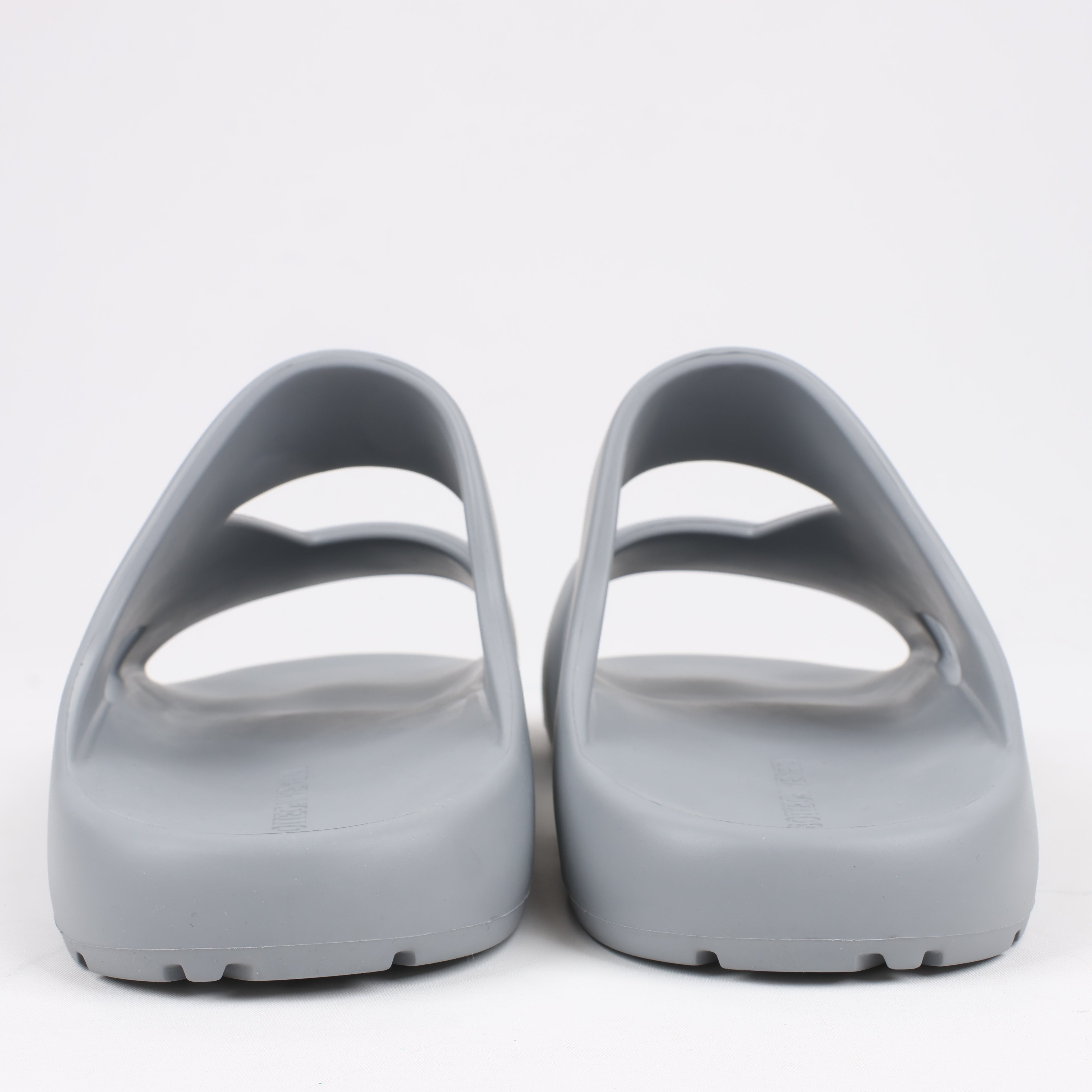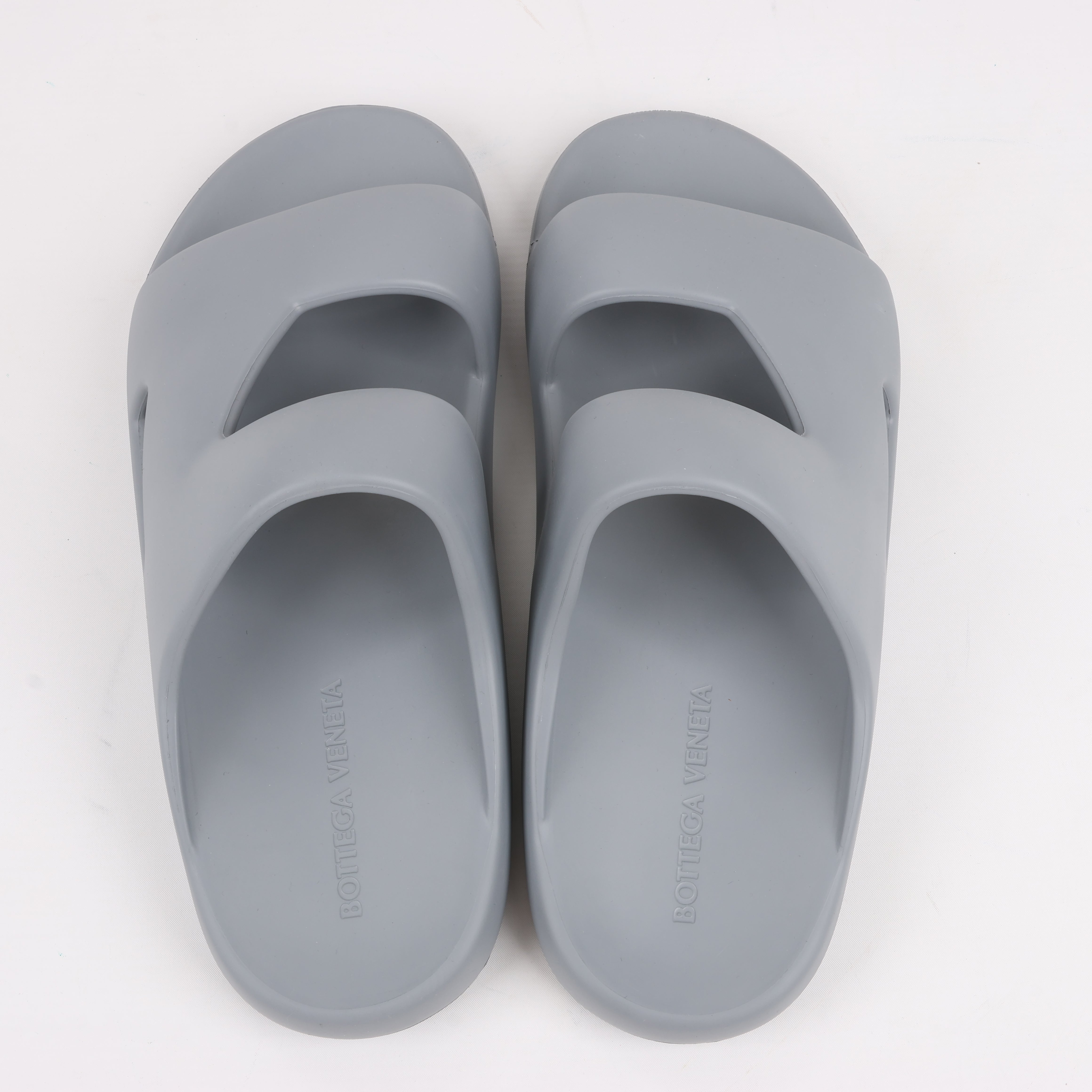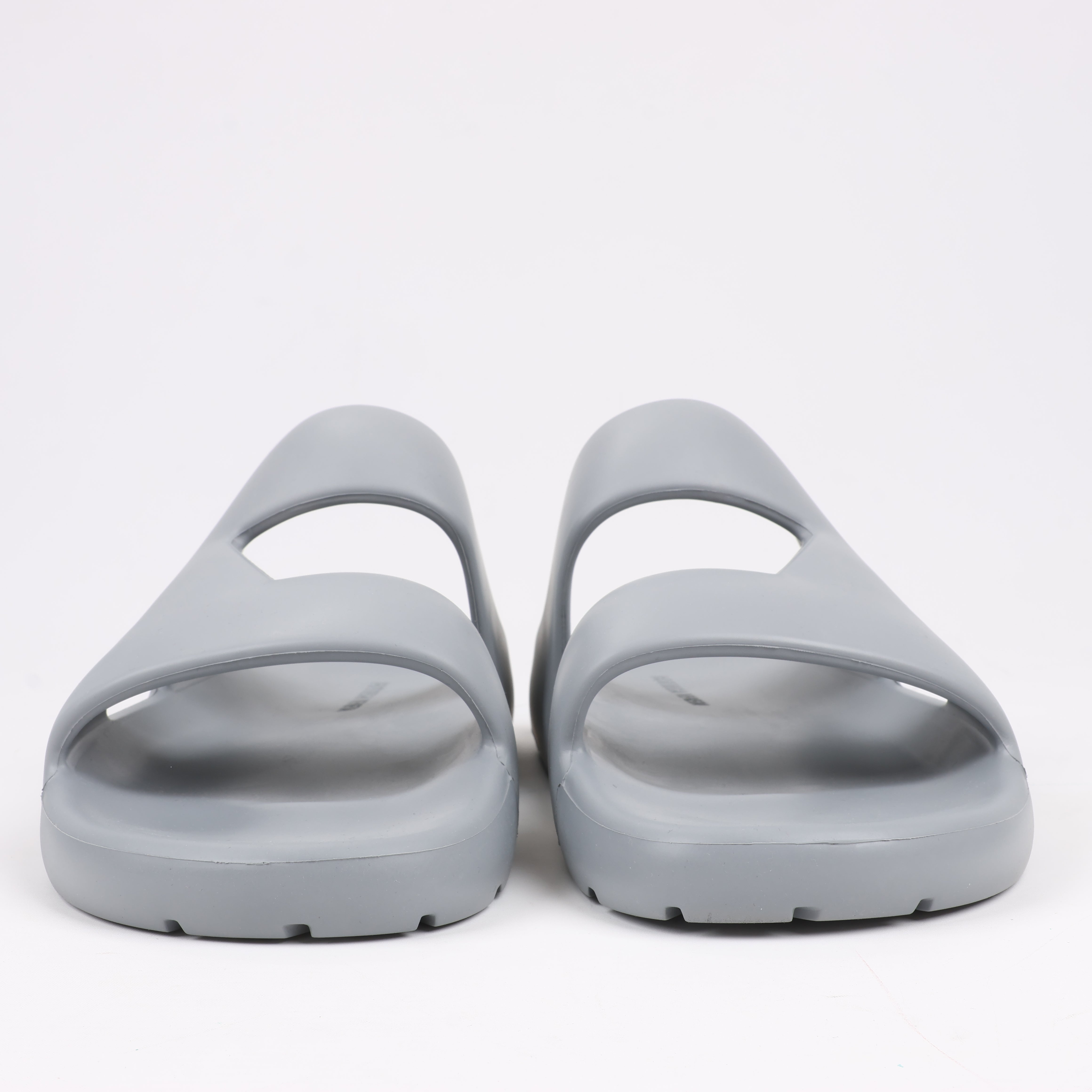 Bottega Veneta Rubber Band sandals in Grey, size 43 EU. Crafted from lightweight rubber, these slip-on sandals feature a bold, modern design with cut-out details for breathability. A stylish and comfortable choice for effortless everyday wear.