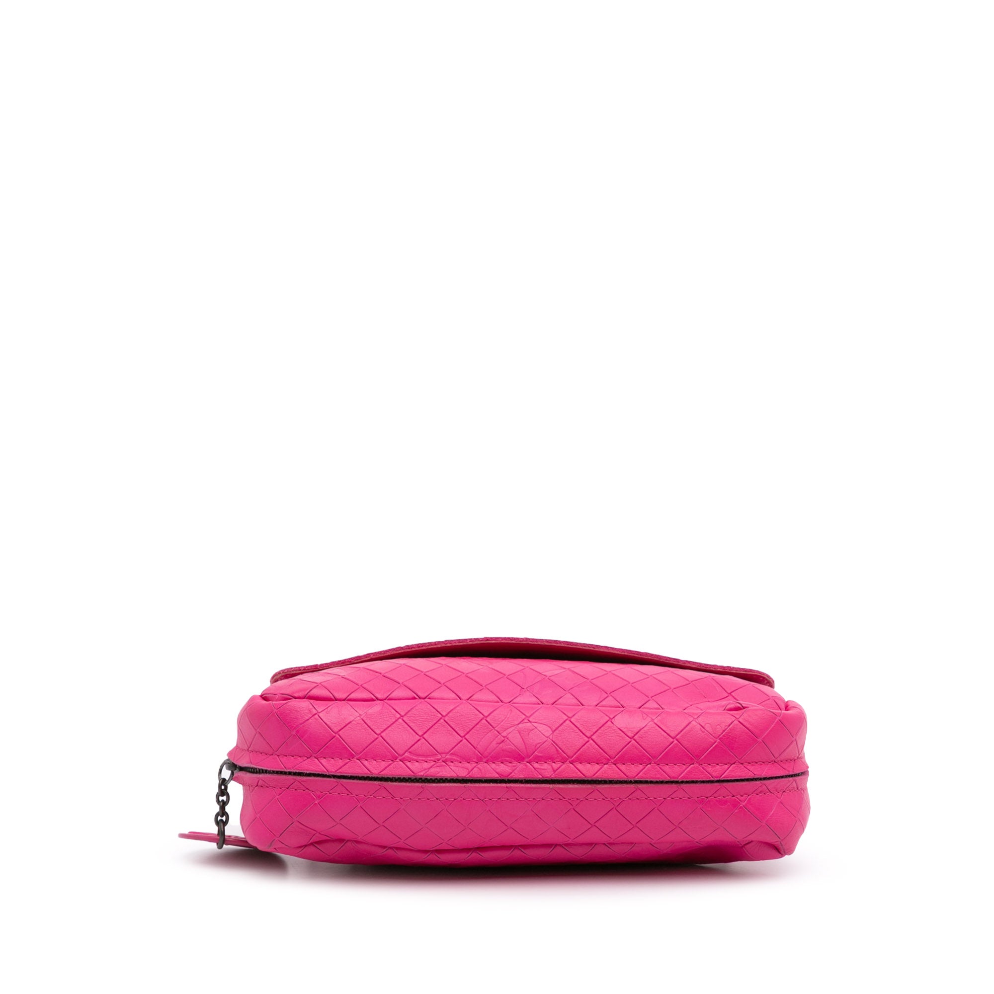 This crossbody bag features a woven leather body, a detachable chain link shoulder strap, a front flap with snap button closures, an interior zip compartment, and an exterior bottom zip compartment. Retail Price: 1650.00