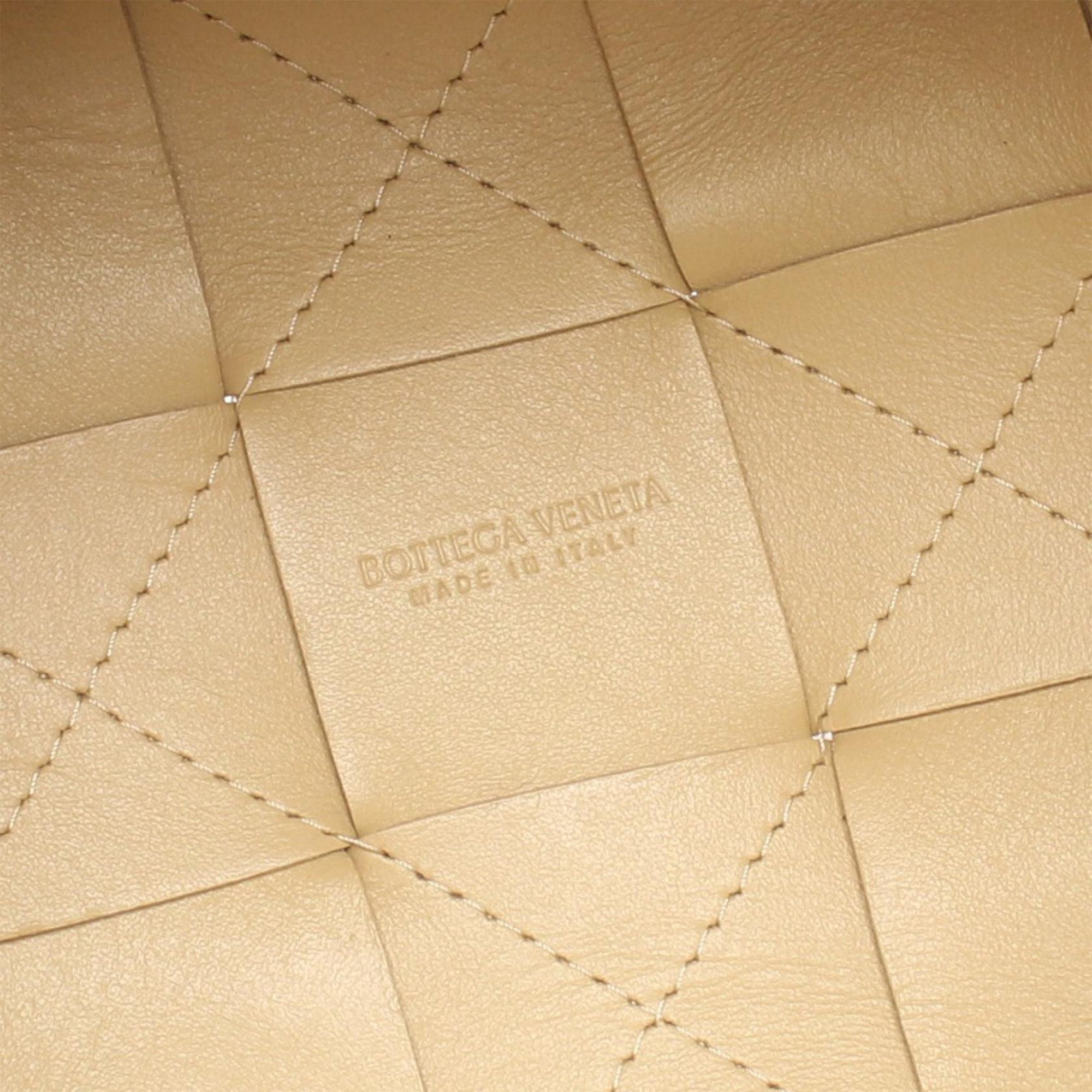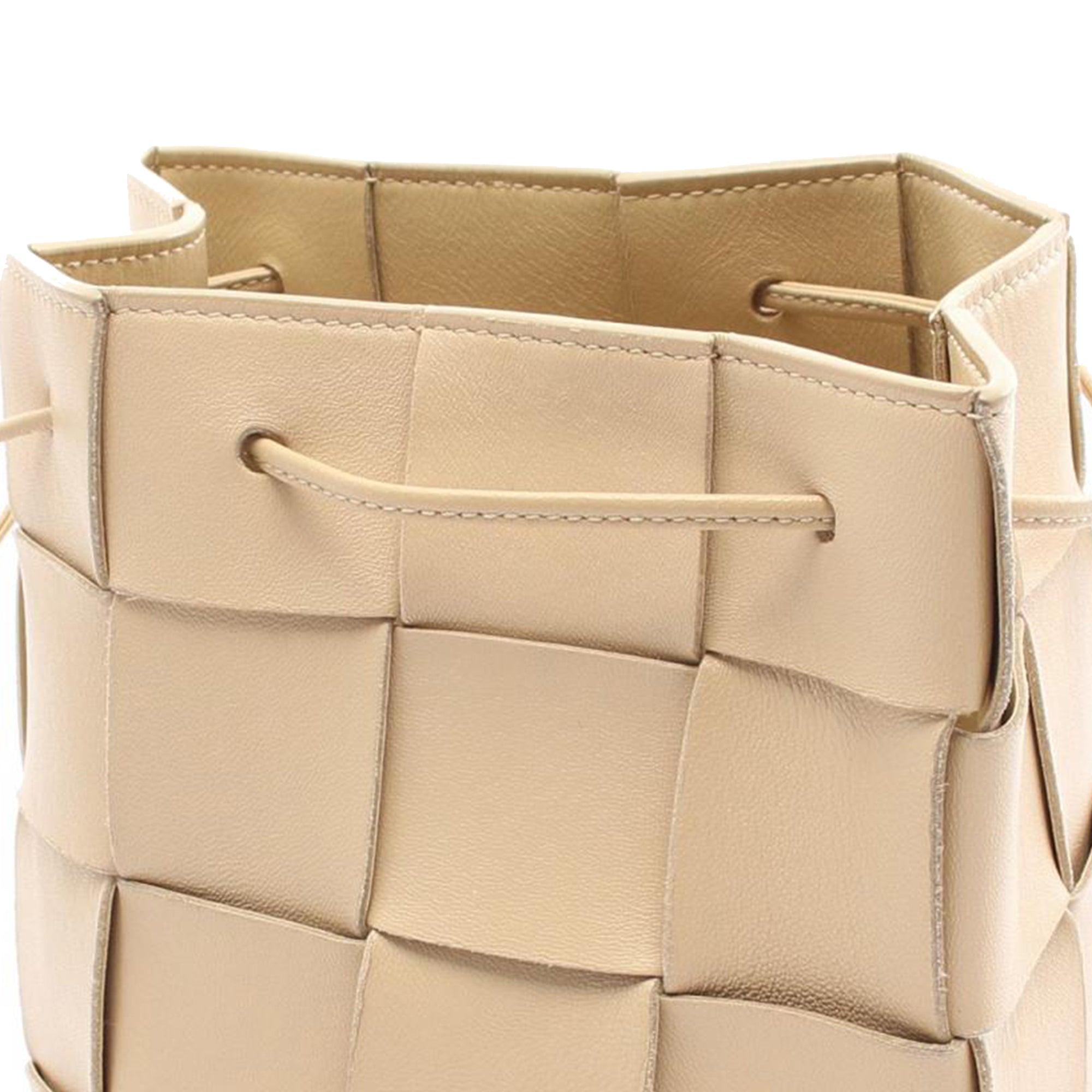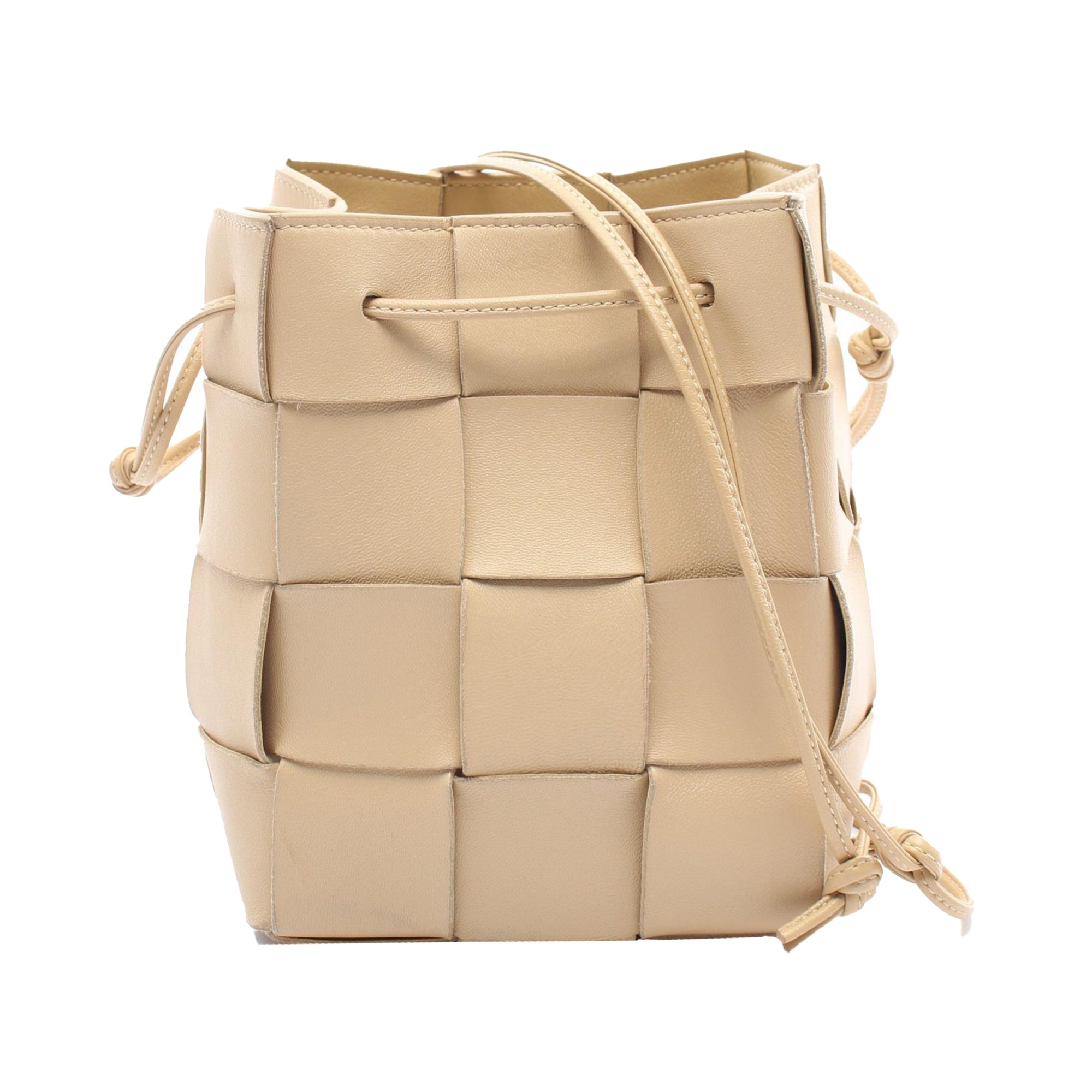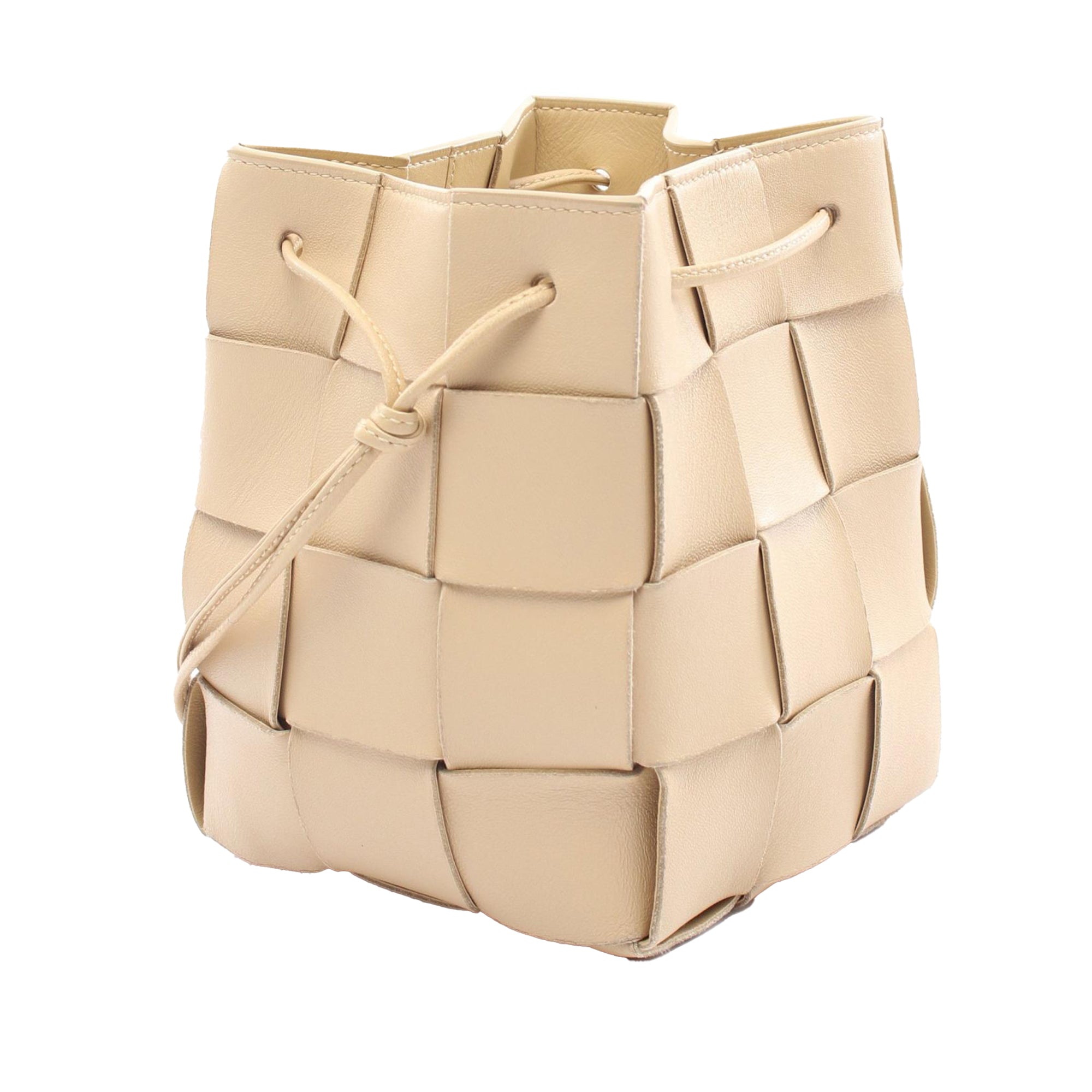 This bucket bag features a woven nappa leather body, a flat leather shoulder strap, and an open top with a drawstring closure. Inclusion: Dust bag. Retail Price: 1890.00