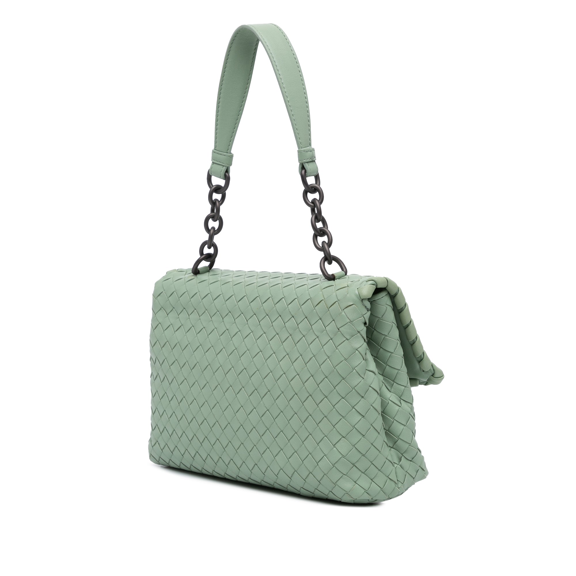 The Small Olimpia features a woven leather body, a curb chain shoulder strap with leather guard, a flap with magnetic snap closure, and interior zip and slip pockets. Retail Price: 2500.00