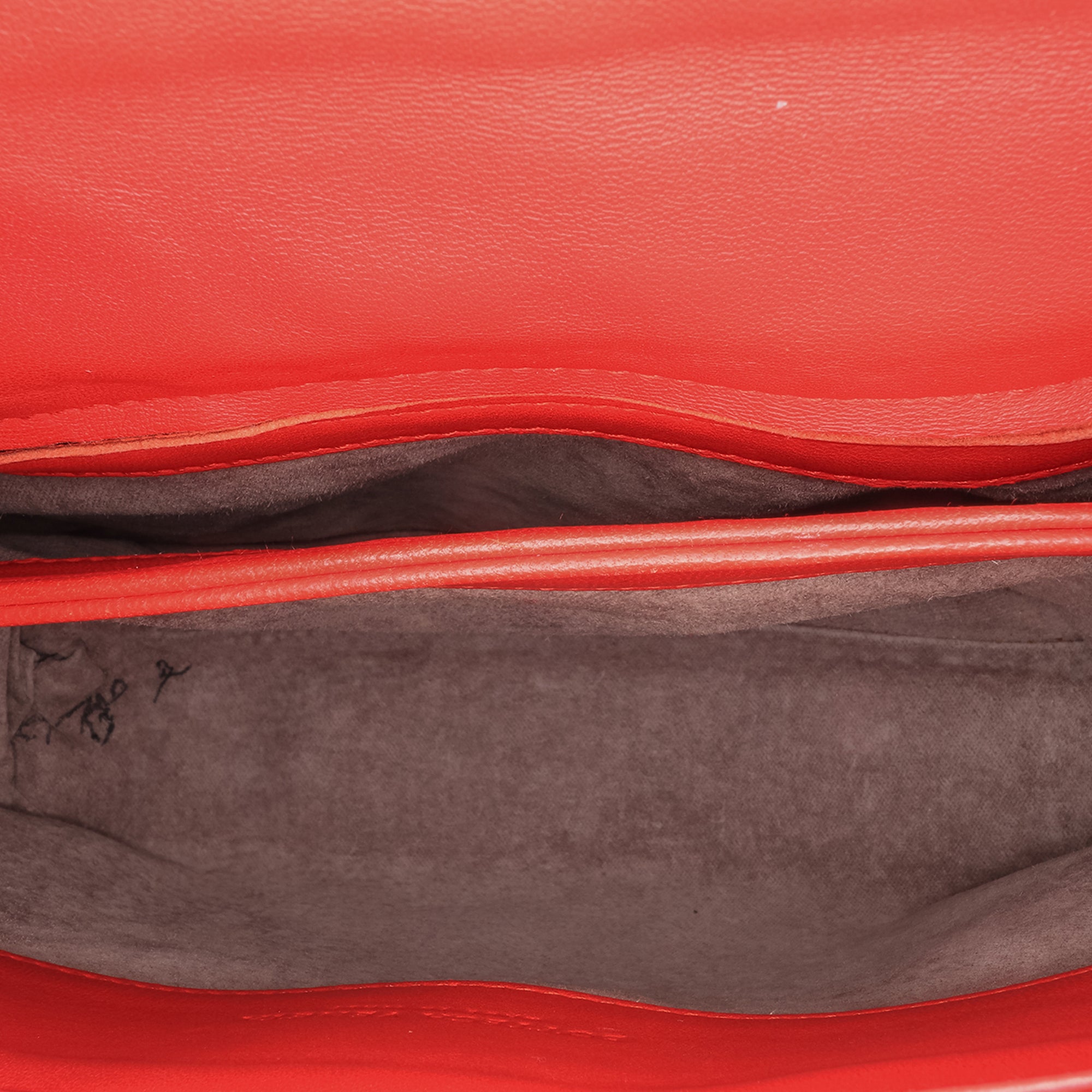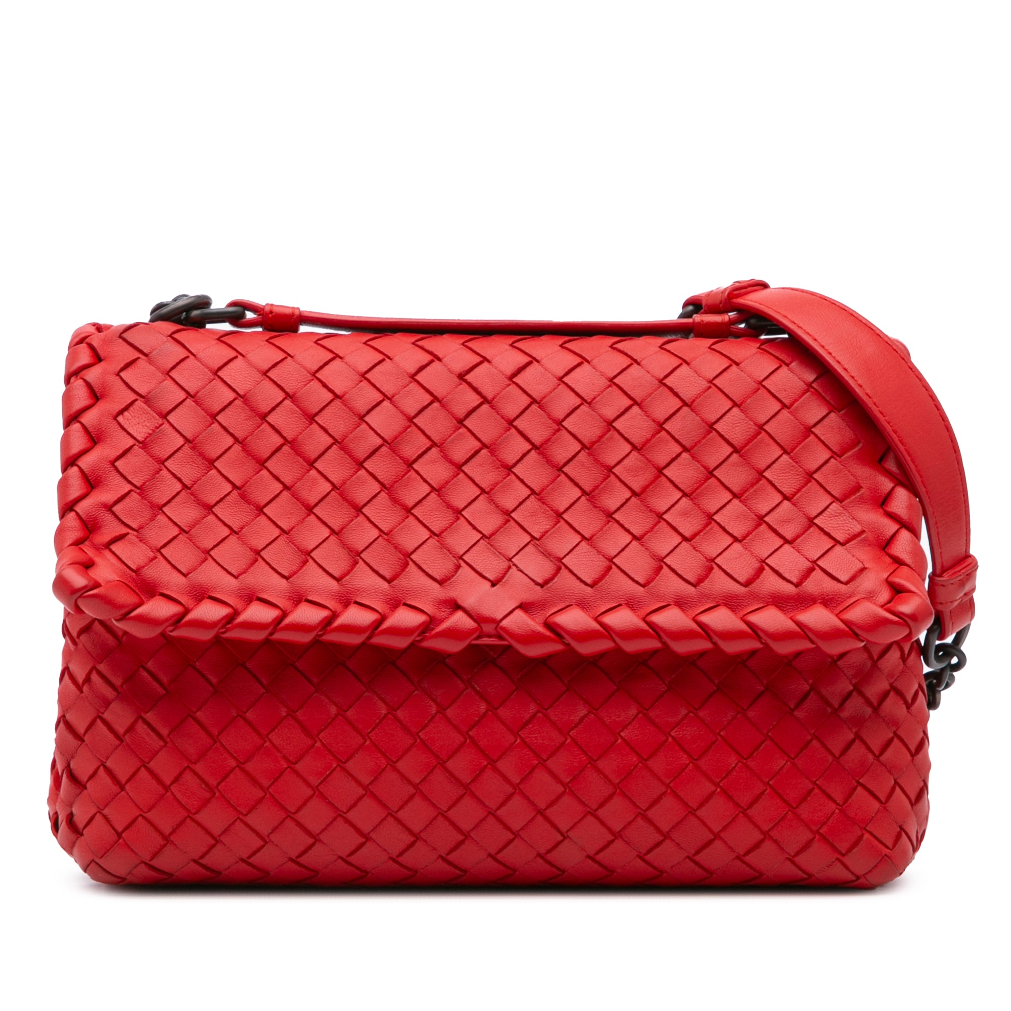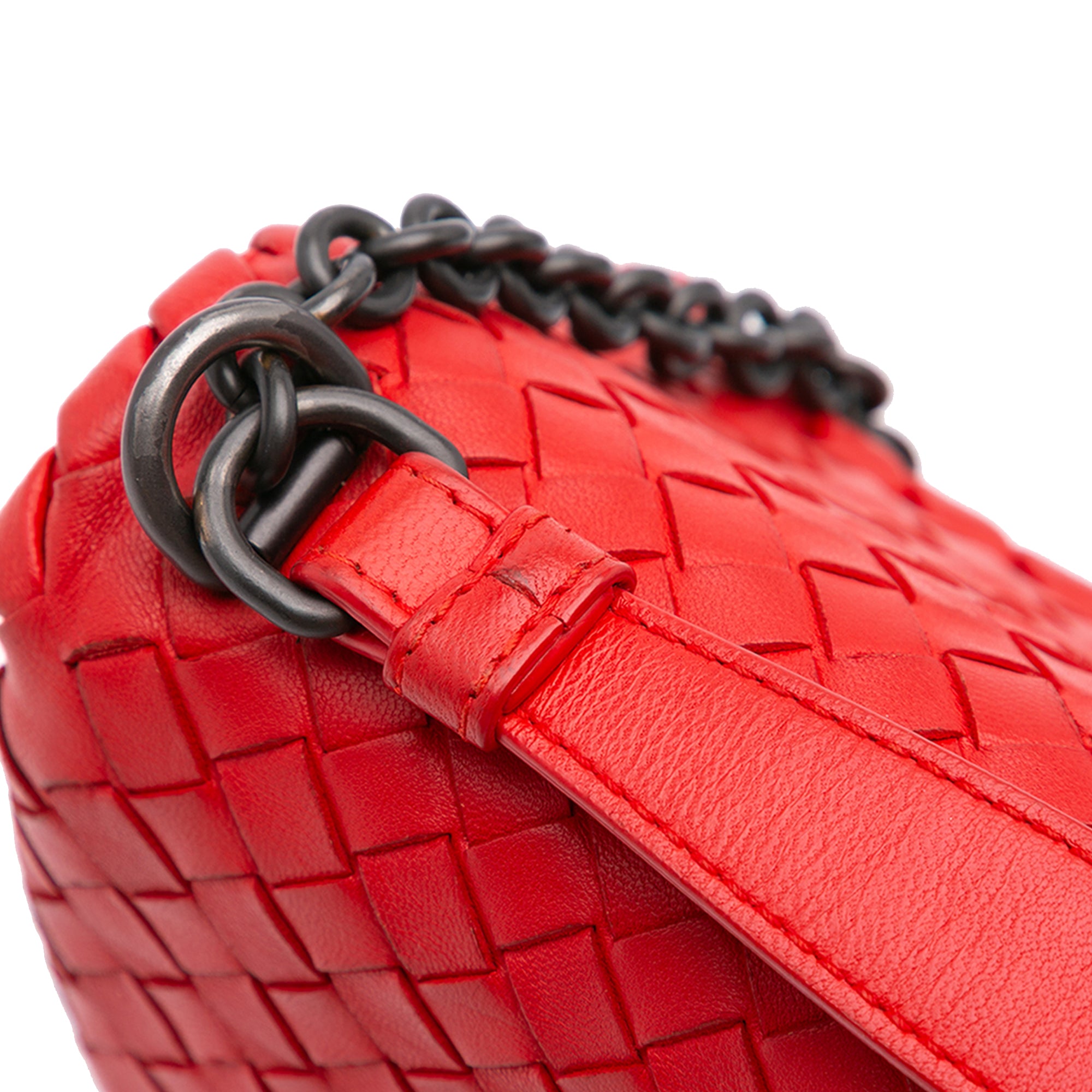 The Olimpia features a woven leather body, chain shoulder straps with leather guard, a flap with magnetic snap closure, and an interior zip pocket. Retail Price: 4500.00