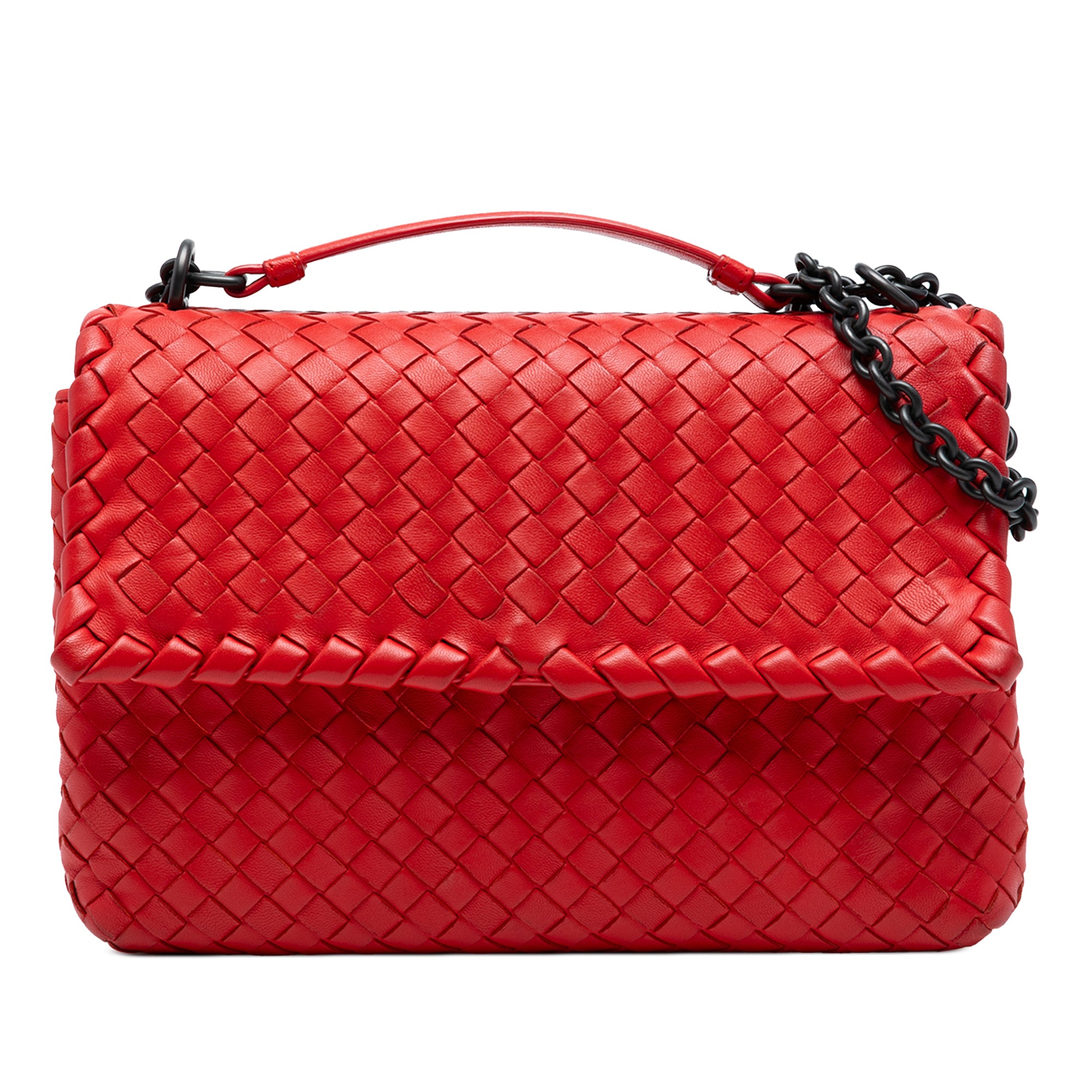 The Olimpia features a woven leather body, chain shoulder straps with leather guard, a flap with magnetic snap closure, and an interior zip pocket. Retail Price: 1670.00