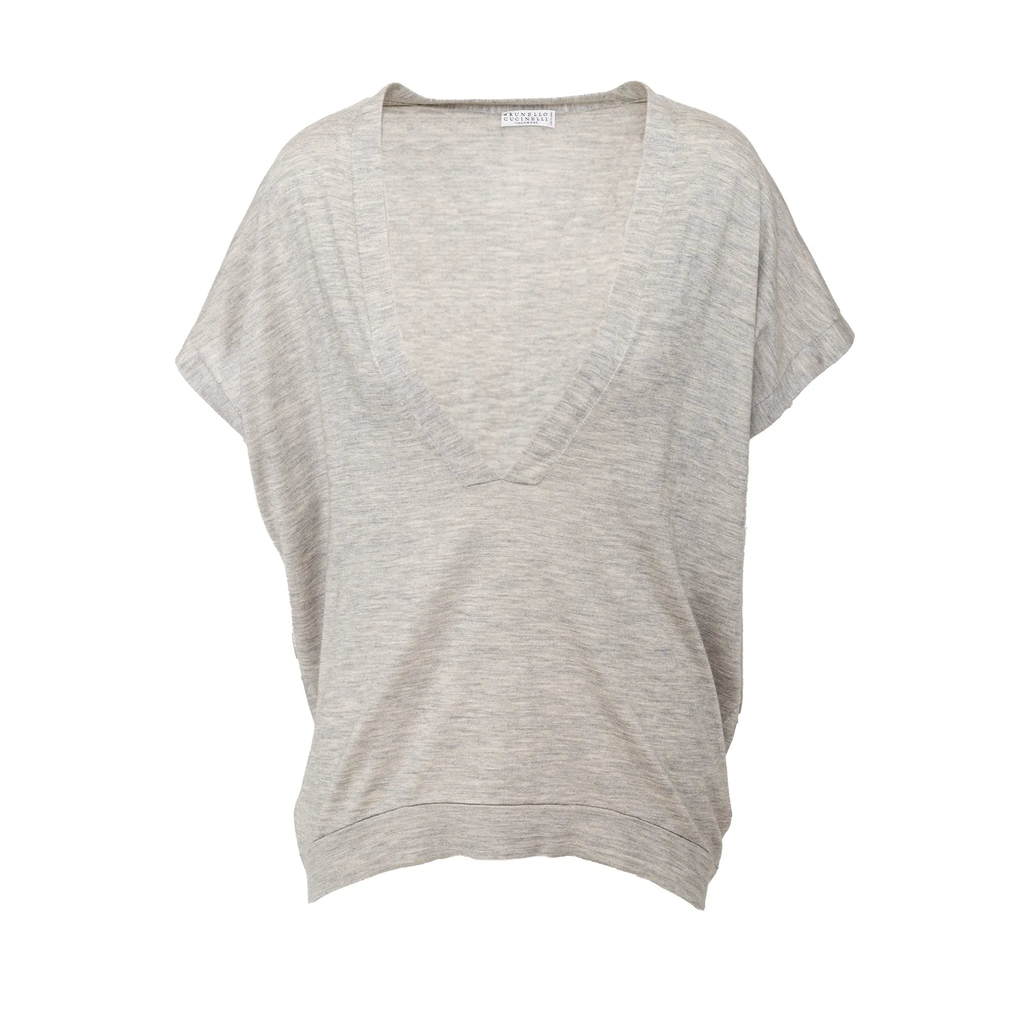 Brunello Cucinelli light grey top in a luxe cashmere-silk blend. Features a deep V-neck, relaxed fit, and subtly shorter front for a casual silhouette.