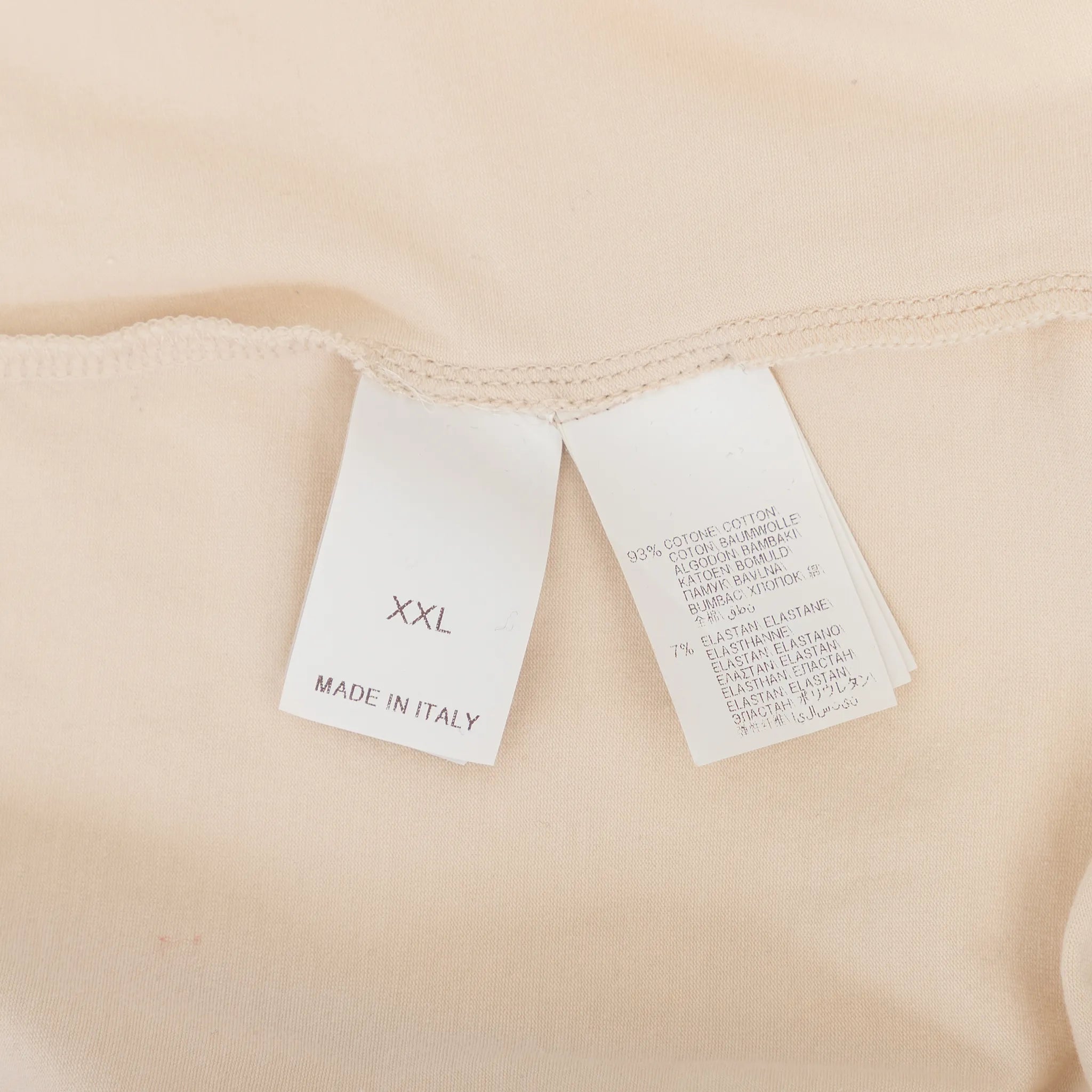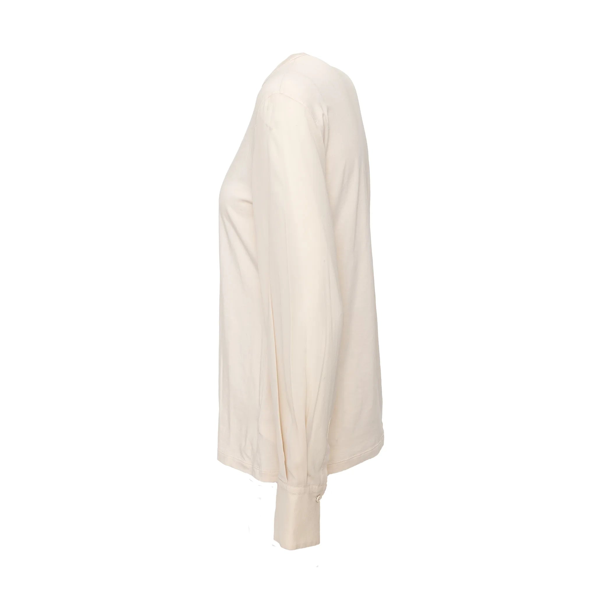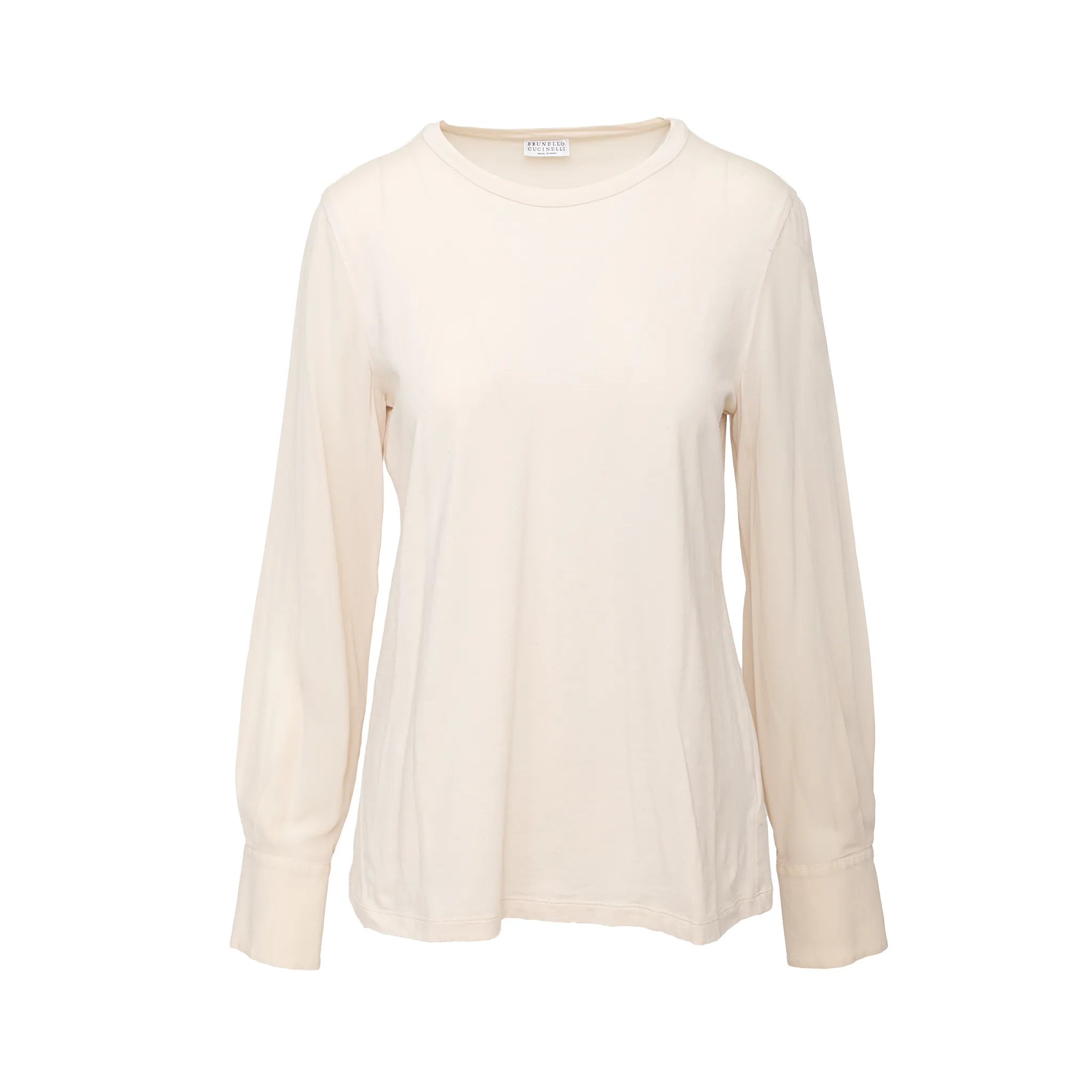 Brunello Cucinelli top in a creamy off-white cotton blend. Features a rounded V-neck and silk-blend cuffed sleeves for a casual yet elevated look.