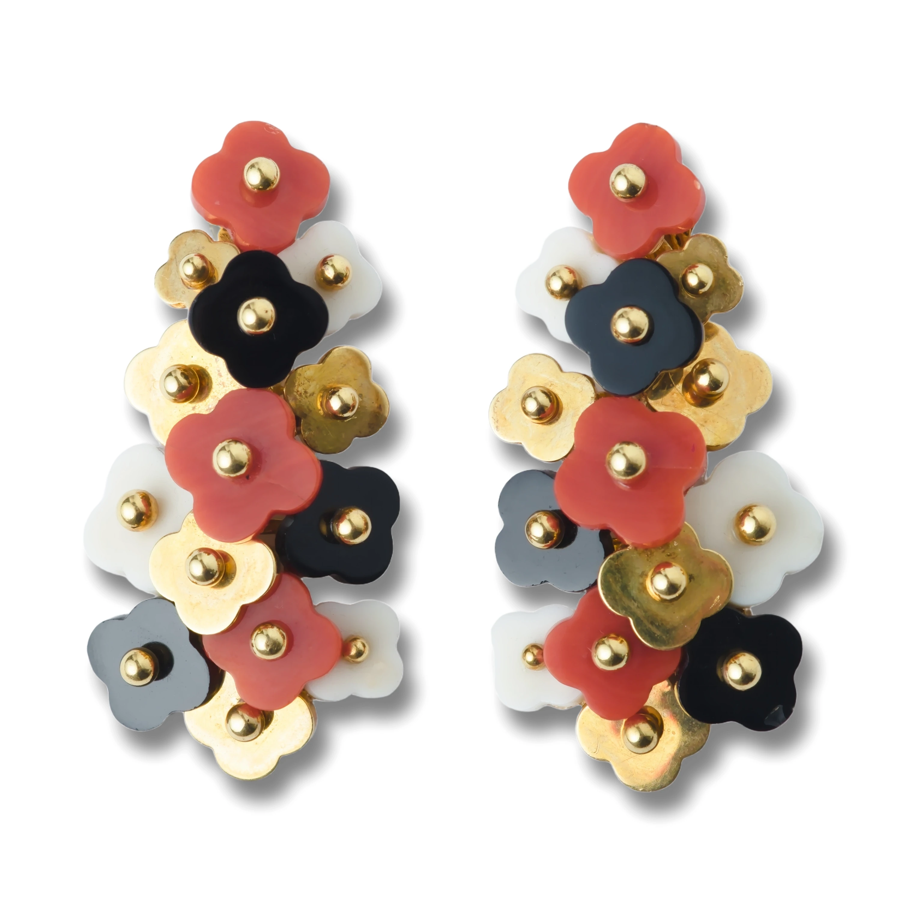 Sculpted flowers in natural hardstones alternate in a bold yet harmonious composition, each finished with a polished gold spherical pistil that enhances luminosity and depth. The maximum diameter of 3.3 cm gives the earrings strong presence while preserving balance and elegance.