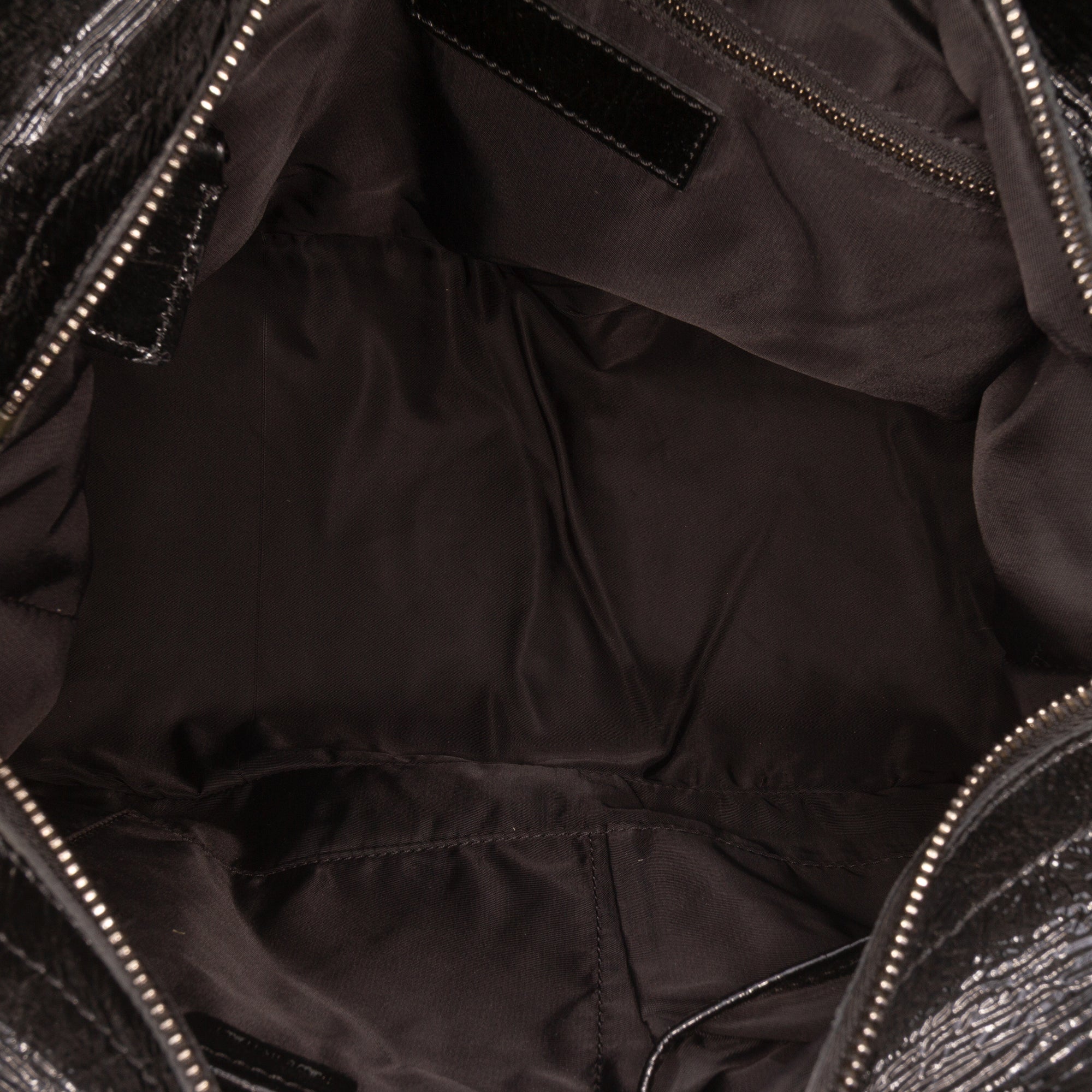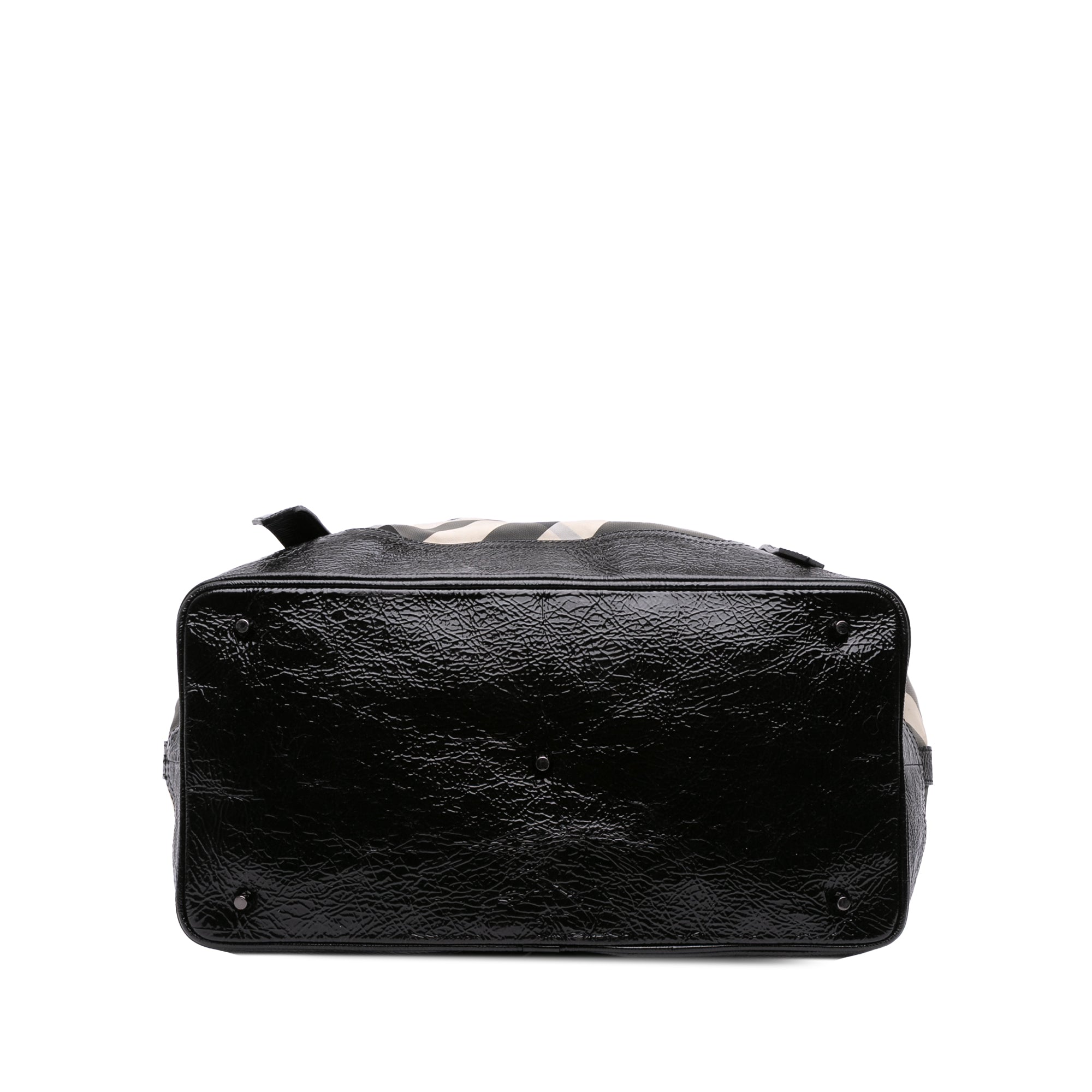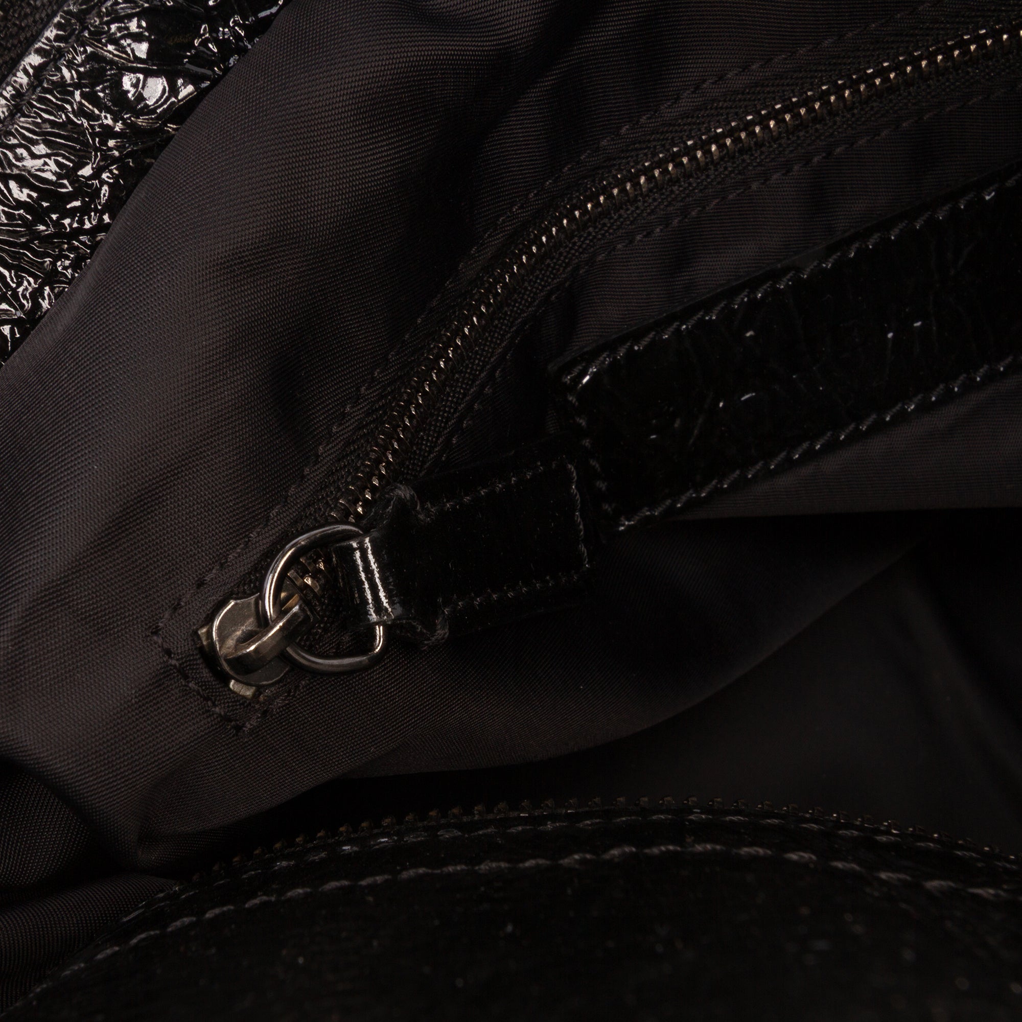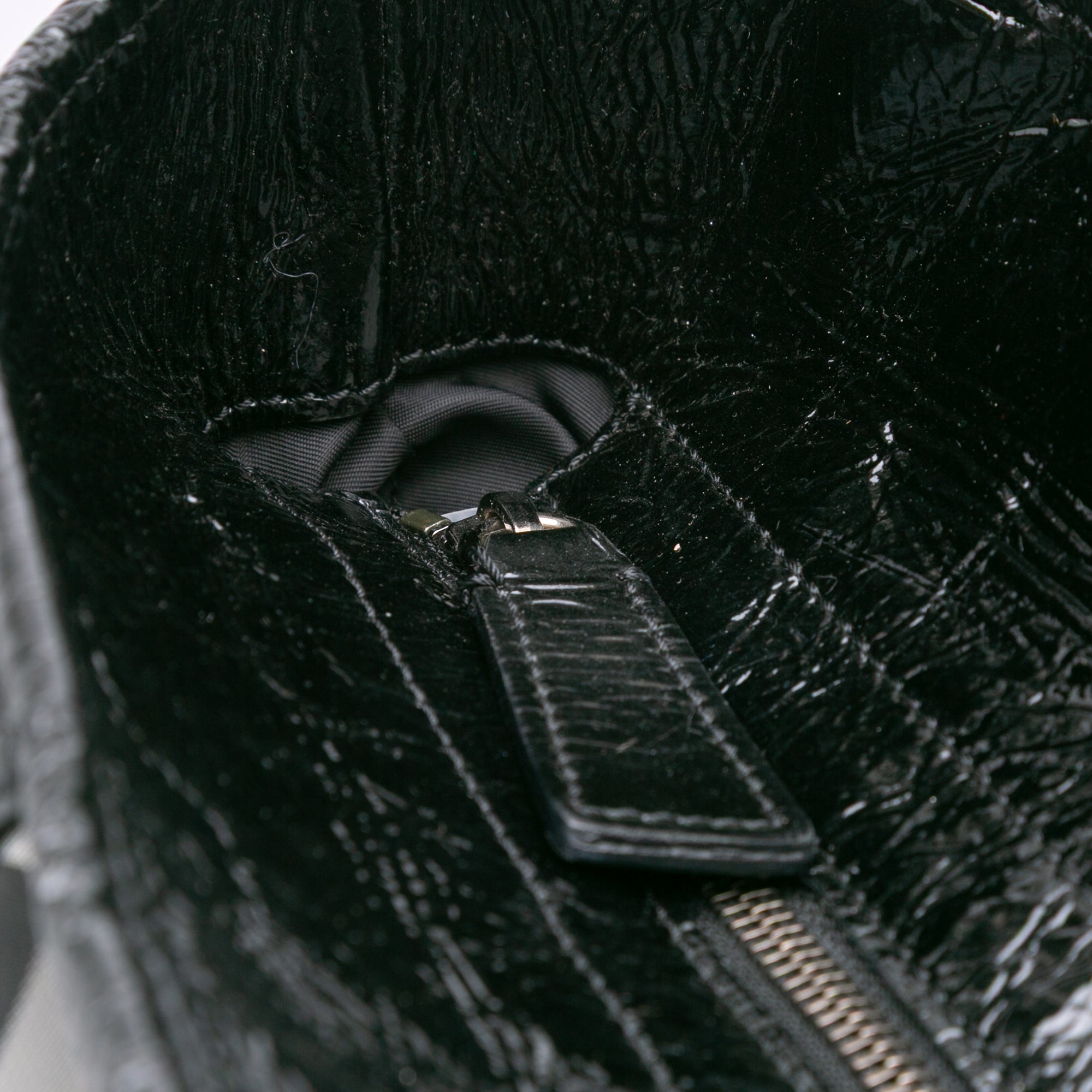 This satchel features a nylon body with patent leather trim, flat patent leather handles, a detachable and adjustable patent leather shoulder strap with leather guard, a top zip closure, and interior zip, slip and open pockets. Retail Price: 1495.00