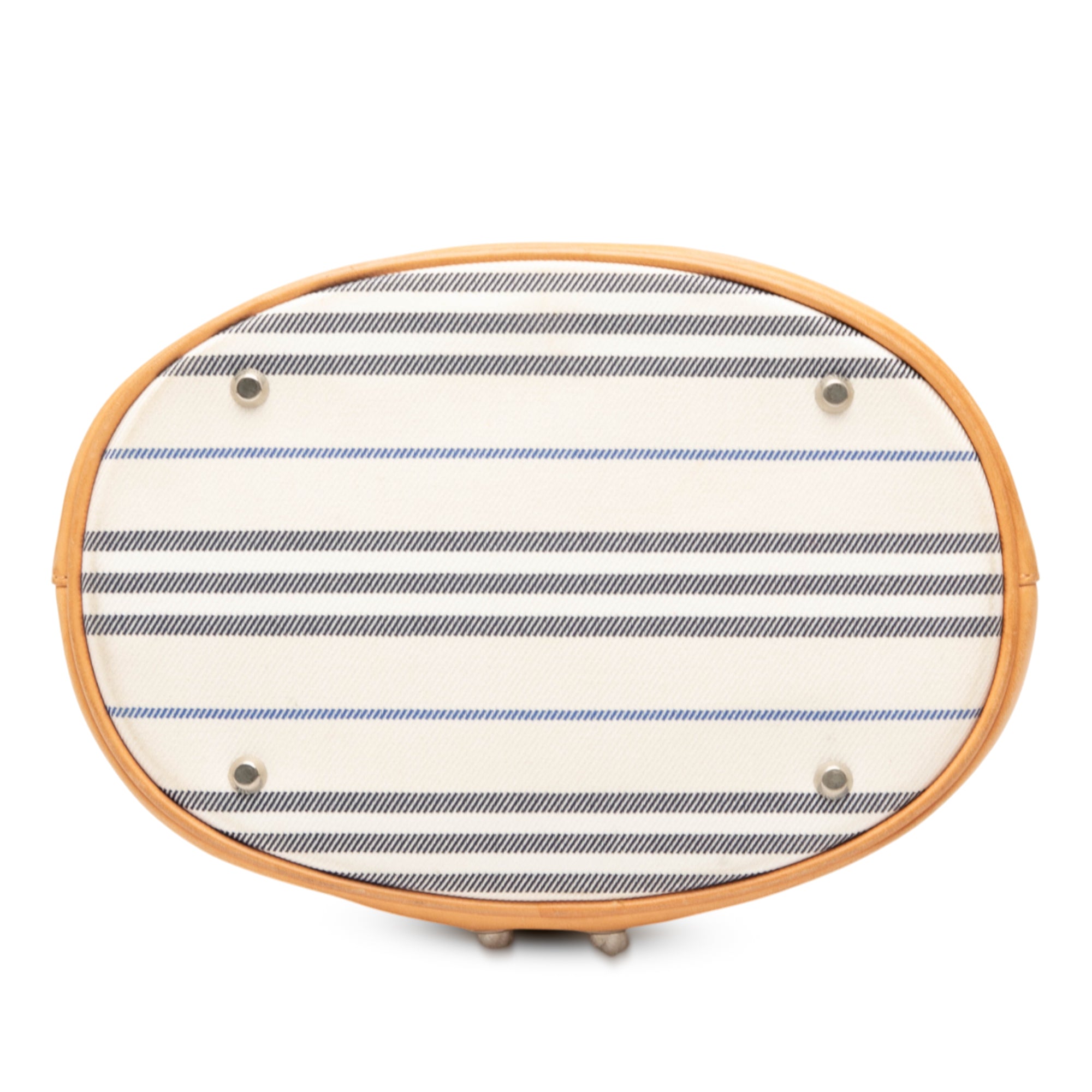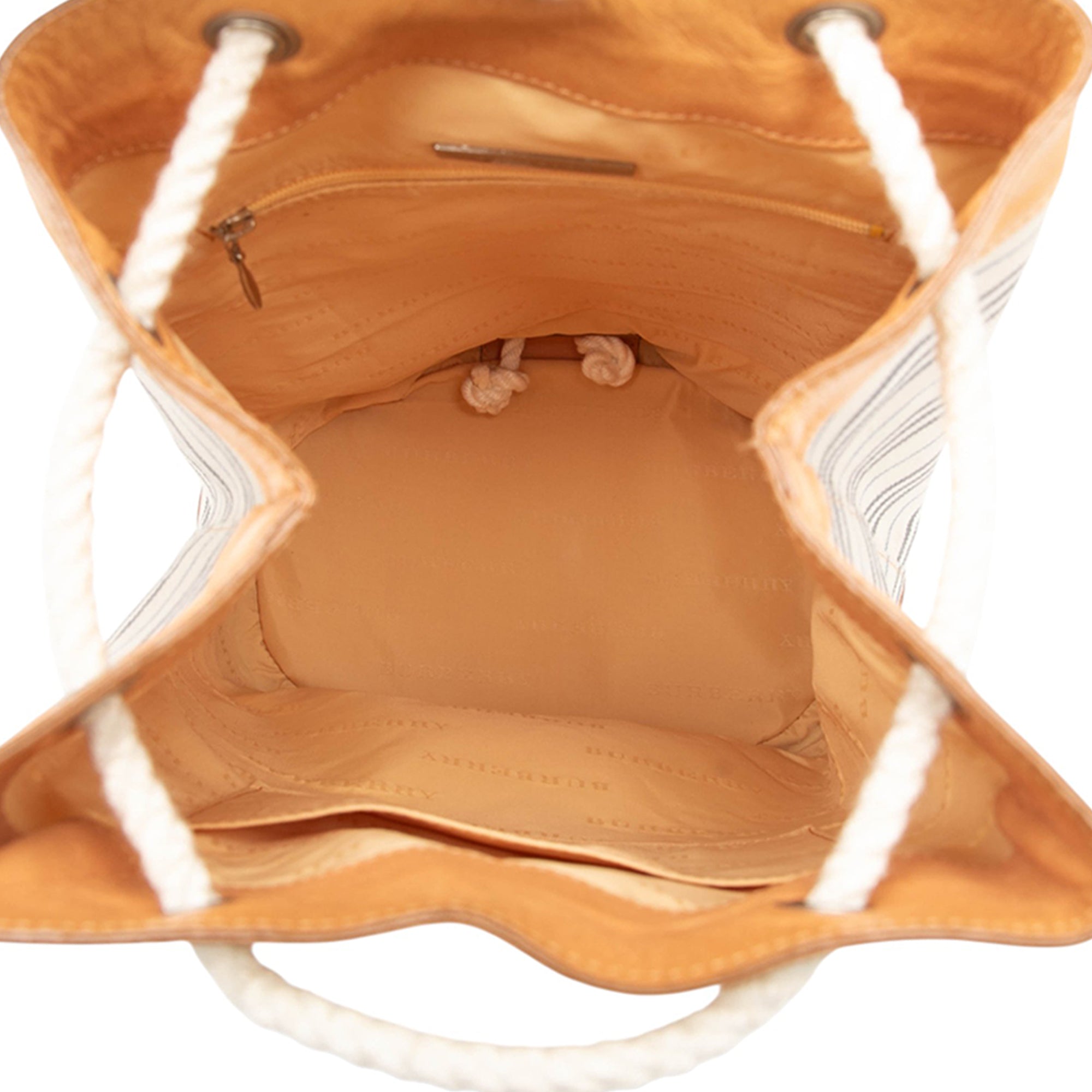 This backpack features a canvas body with leather trim, rope straps, a top drawstring closure, an exterior back zip pocket, and interior zip and slip pockets. Retail Price: 539.00