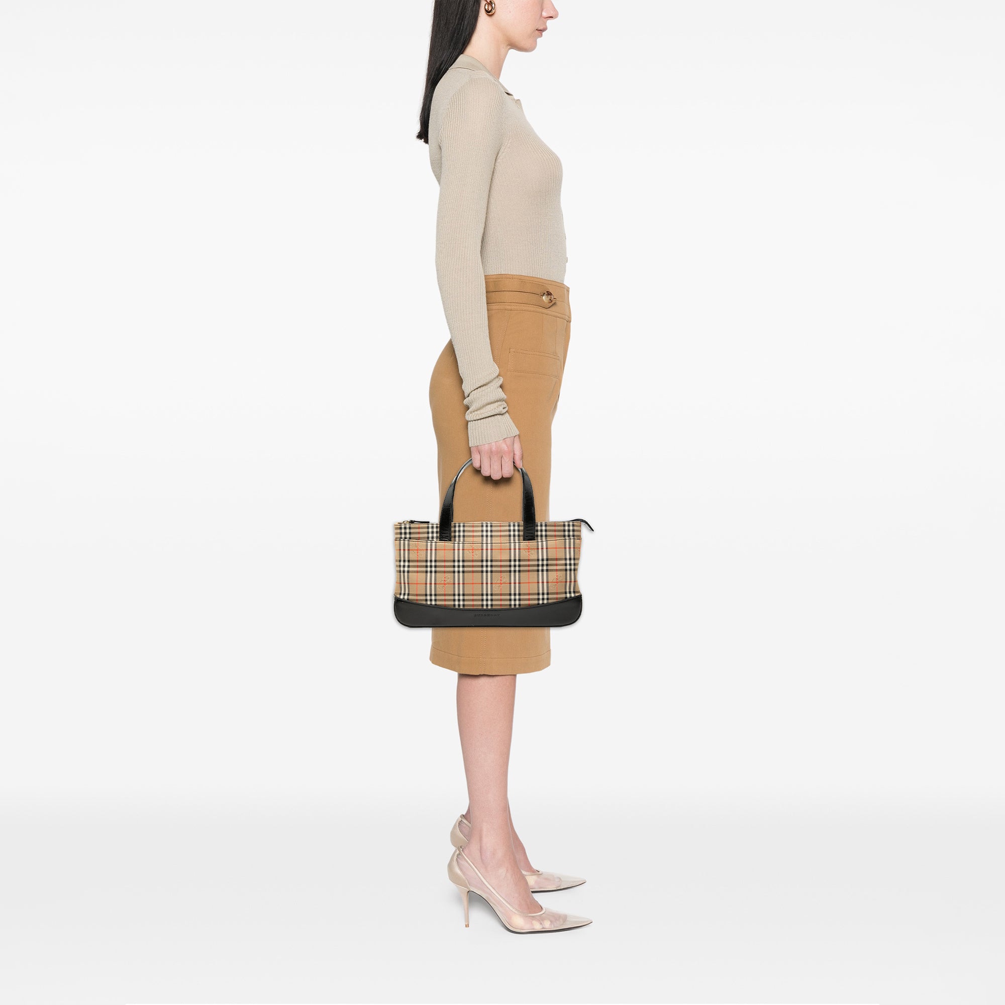 This handbag features a house check canvas body with leather trim, flat leather handles, a top zip closure, an exterior zip pocket, and interior zip and slip pockets. Retail Price: 950.00