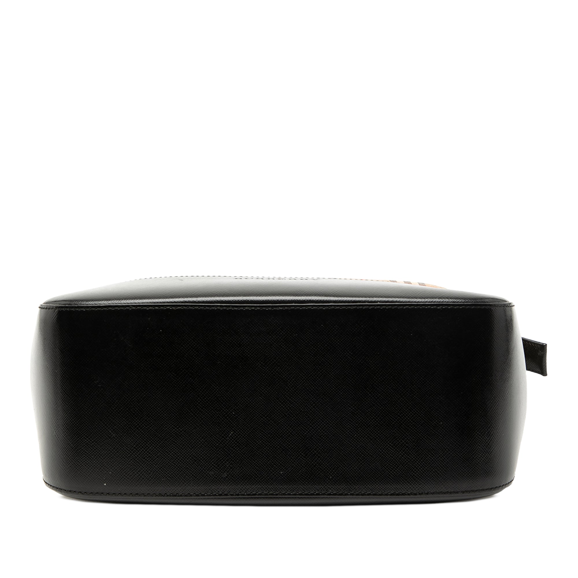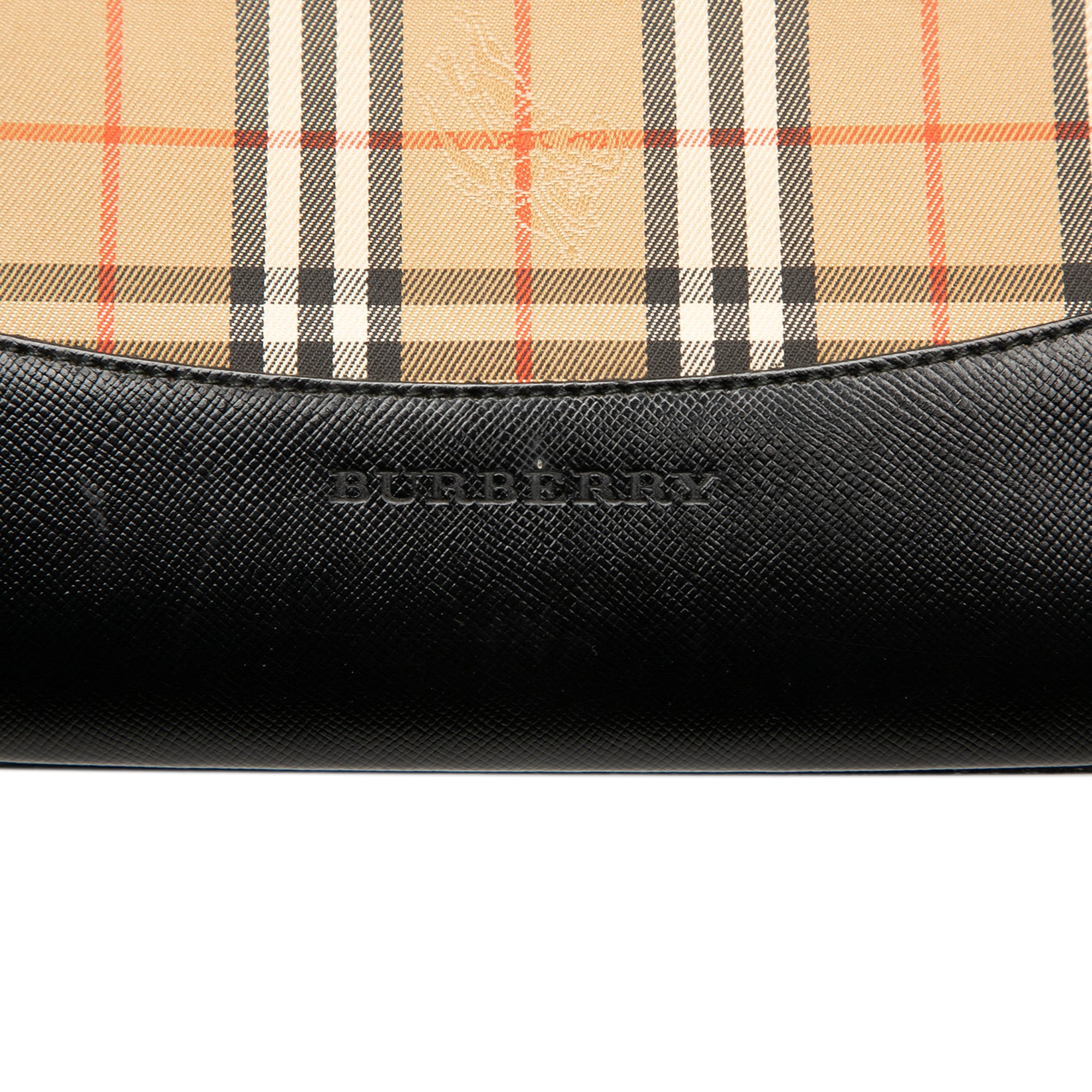 This handbag features a plaid canvas body with a leather bottom, flat leather straps, a top zip closure, an exterior slip pocket, and interior zip and slip pockets. Retail Price: 775.00
