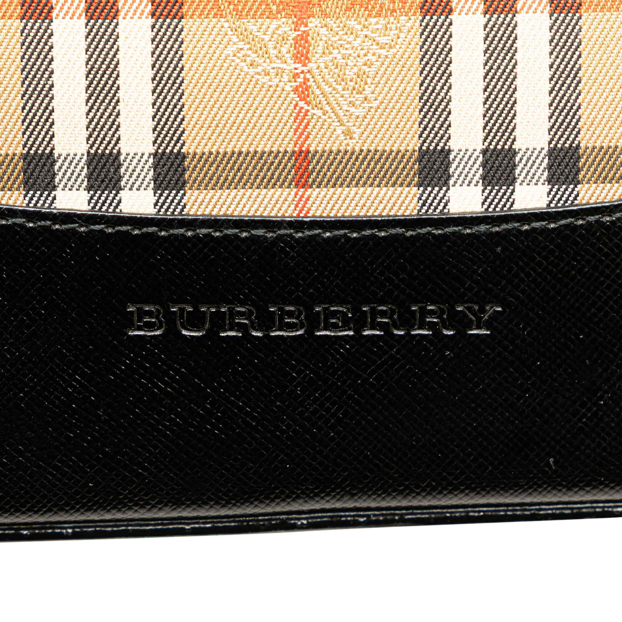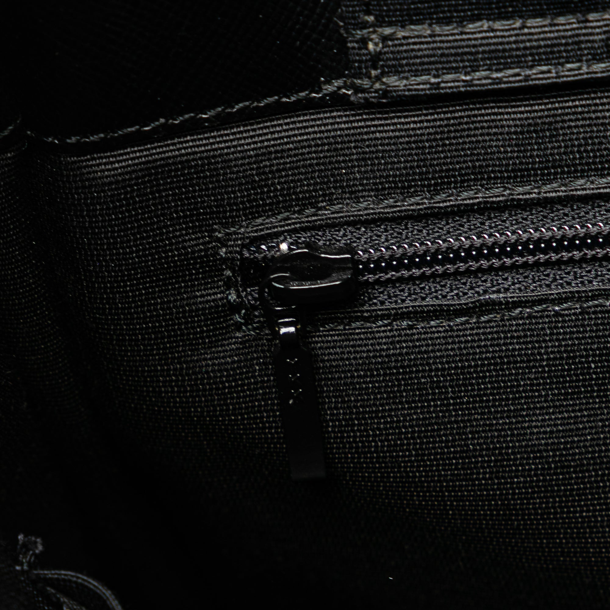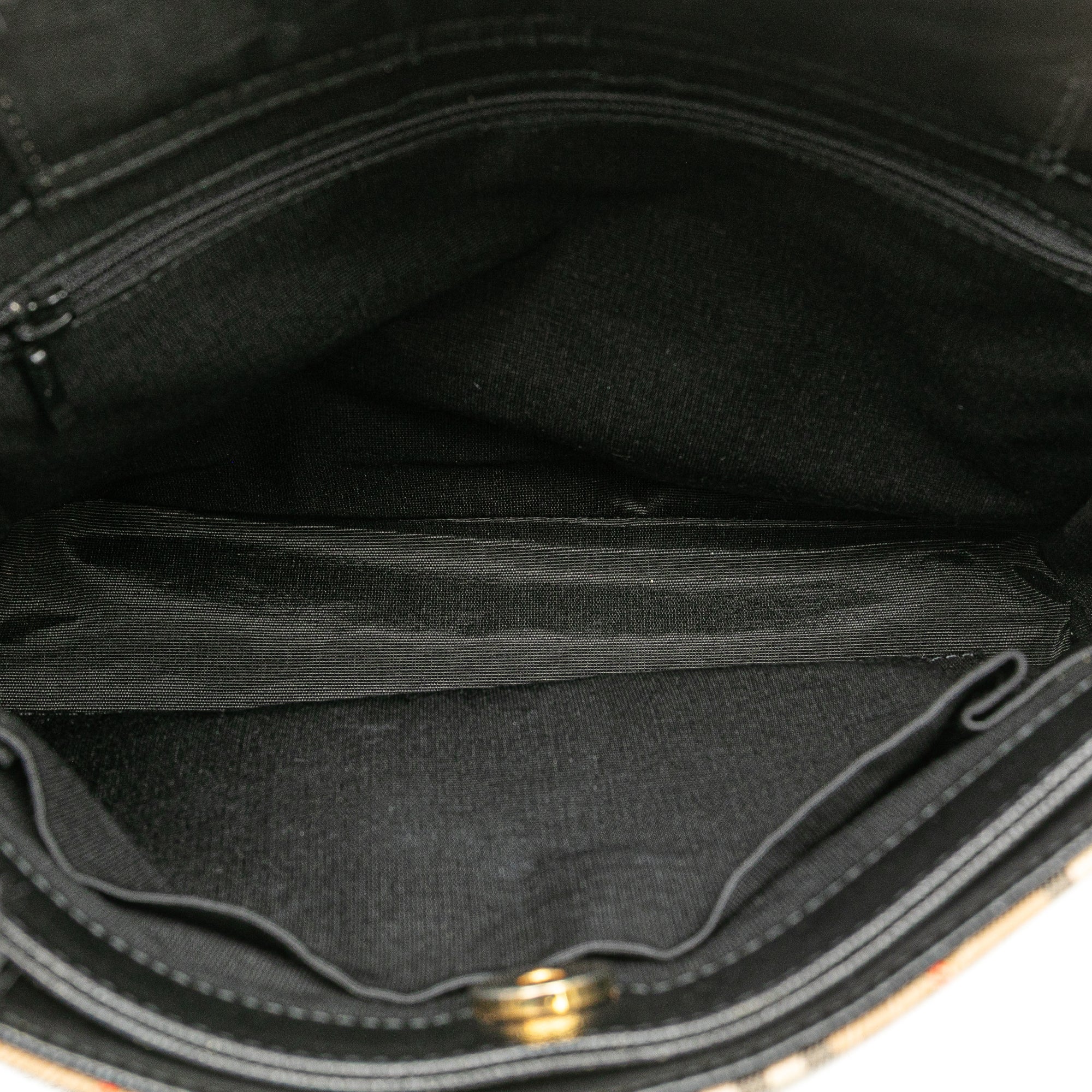 This shoulder bag features a haymarket check canvas body with leather trim, a flat leather strap, an open top with magnetic snap closure, an exterior zip pocket, and interior zip and slip pockets. Retail Price: 600.00