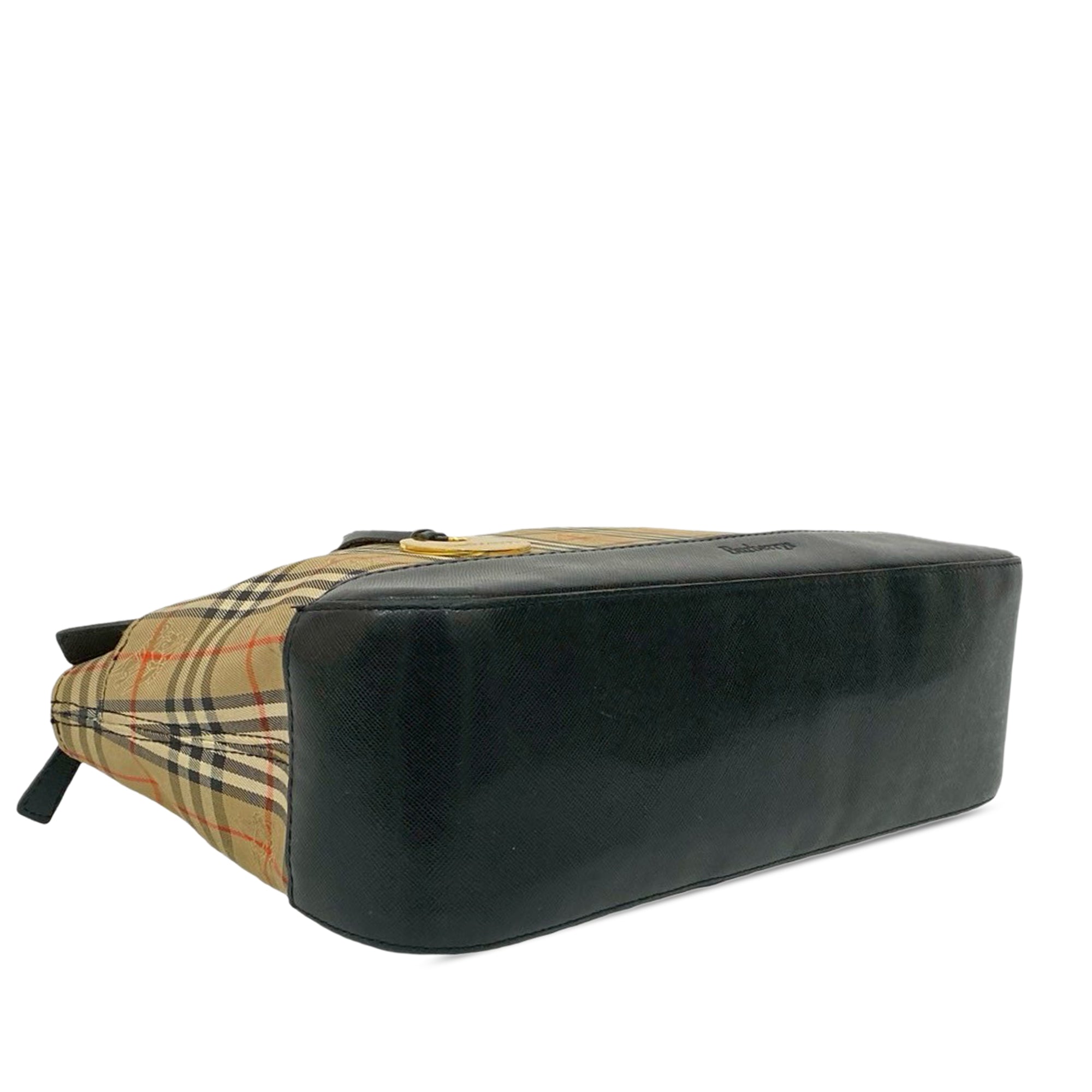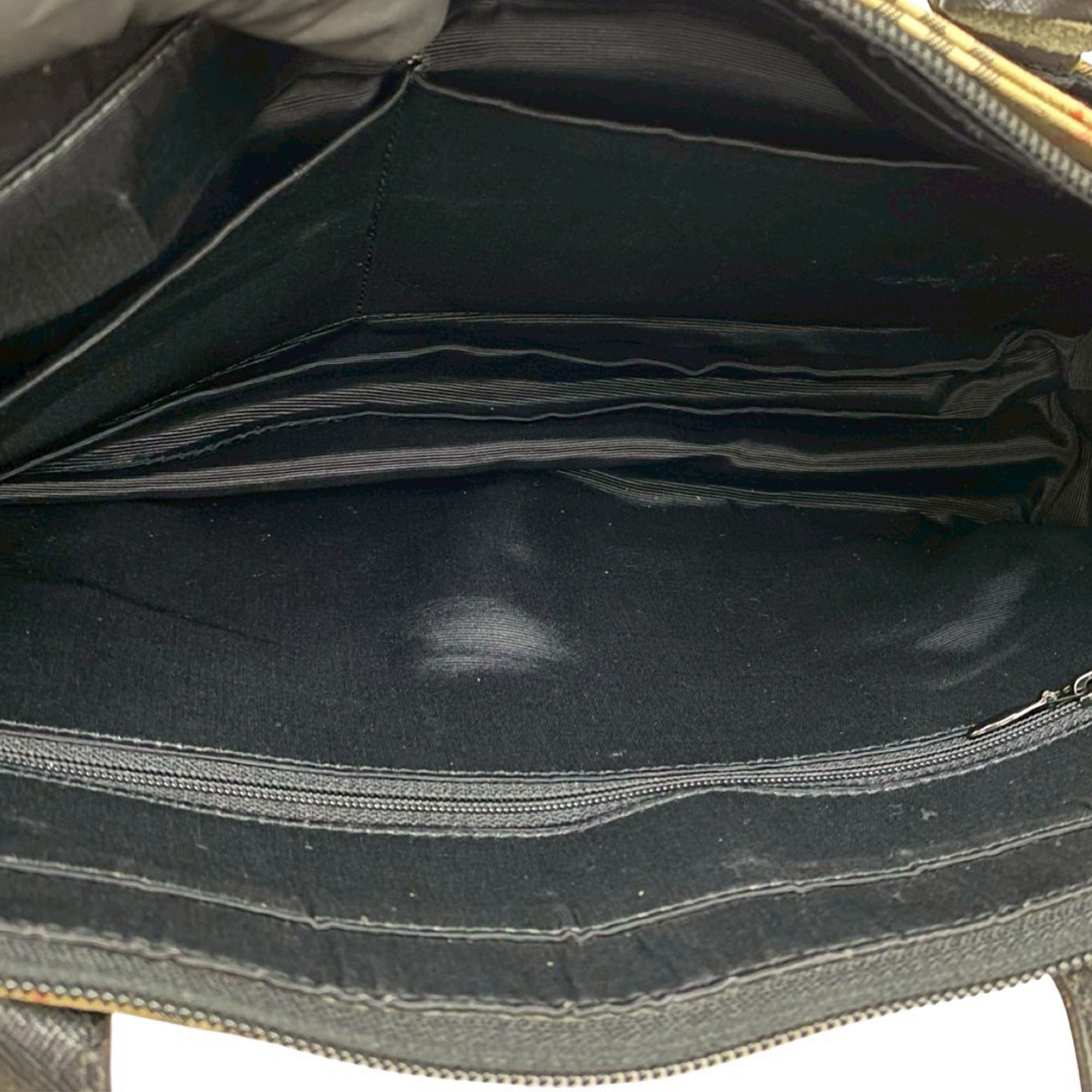 This tote bag features a plaid canvas body with a bottom leather panel, flat leather straps, a top zip closure, an exterior zip pocket, and interior zip and slip pockets. Retail Price: 950.00