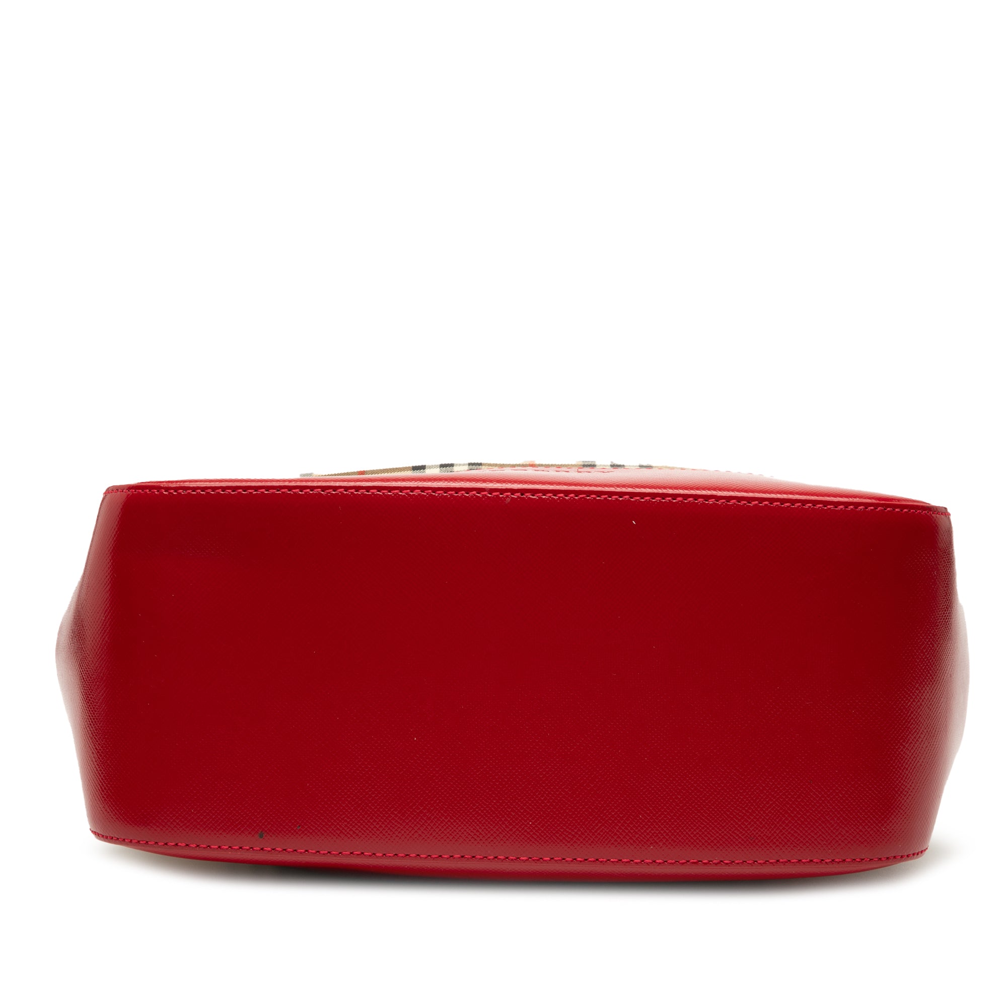 This tote bag features a haymarket check canvas body with leather bottom panel, flat leather straps, an open top, an exterior slip compartment, and interior zip and slip pockets. Retail Price: 800.00