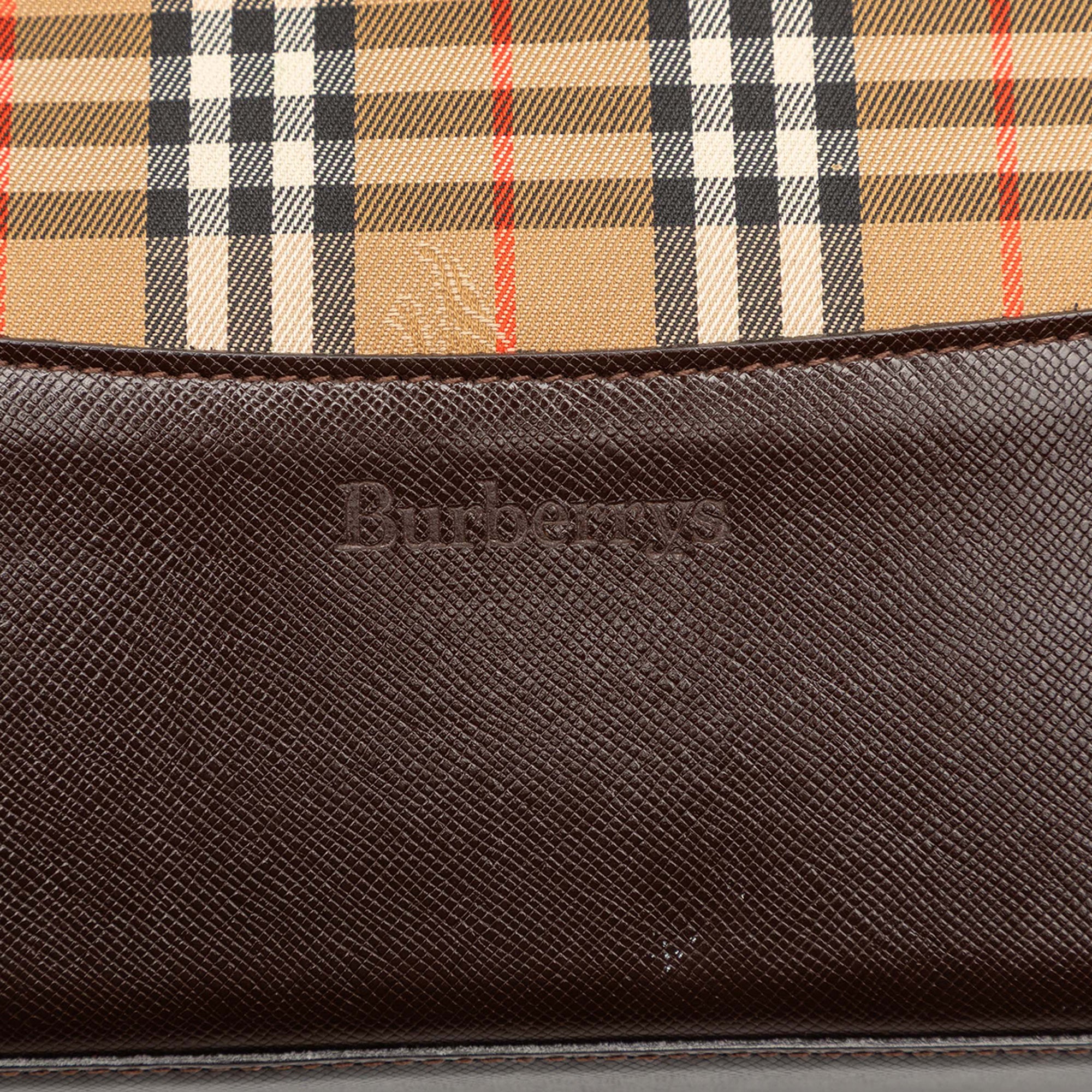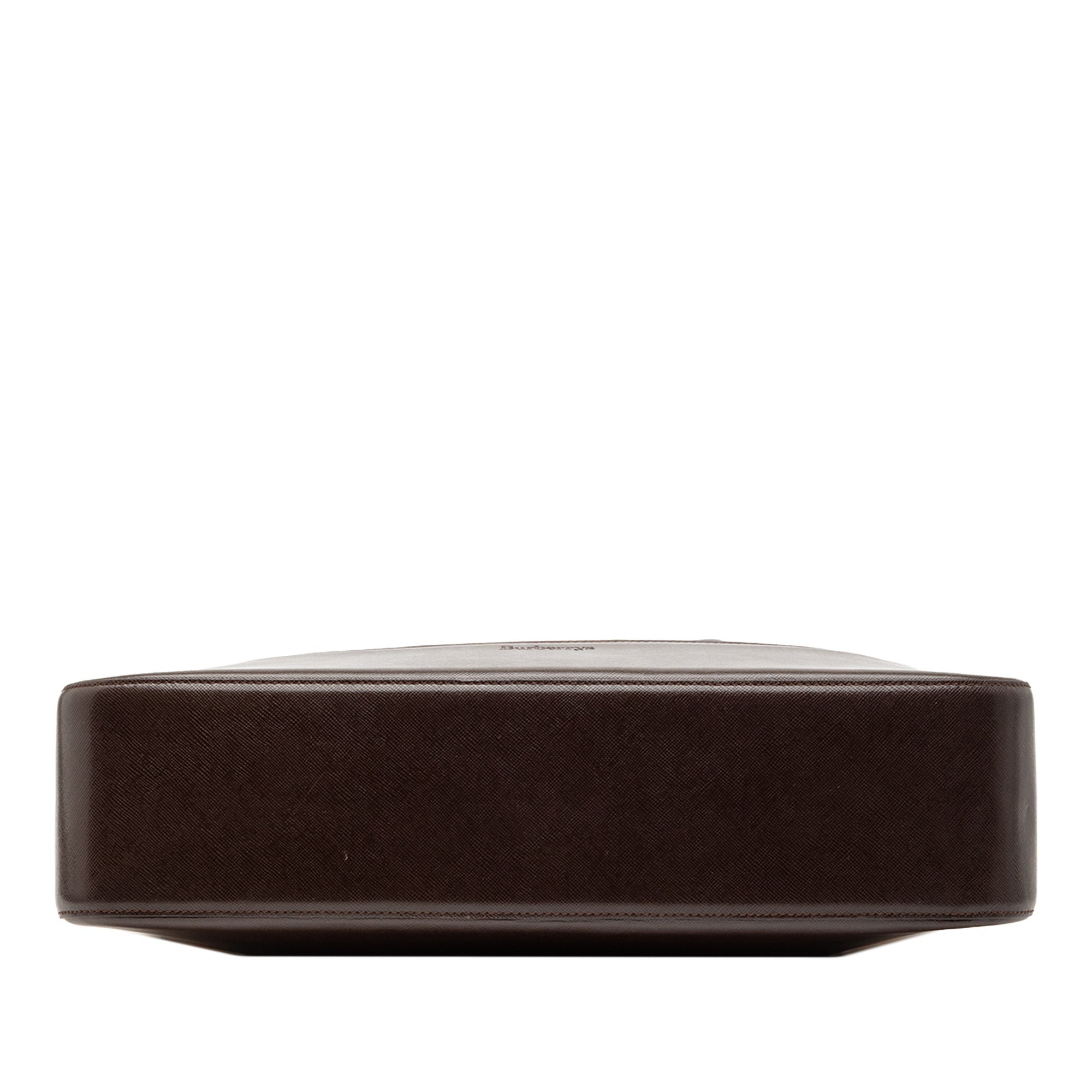 This tote bag features a haymarket check canvas body with a leather bottom panel and trim, flat leather straps, a top zip closure, an exterior slip pocket, and interior zip and slip pockets. Retail Price: 800.00