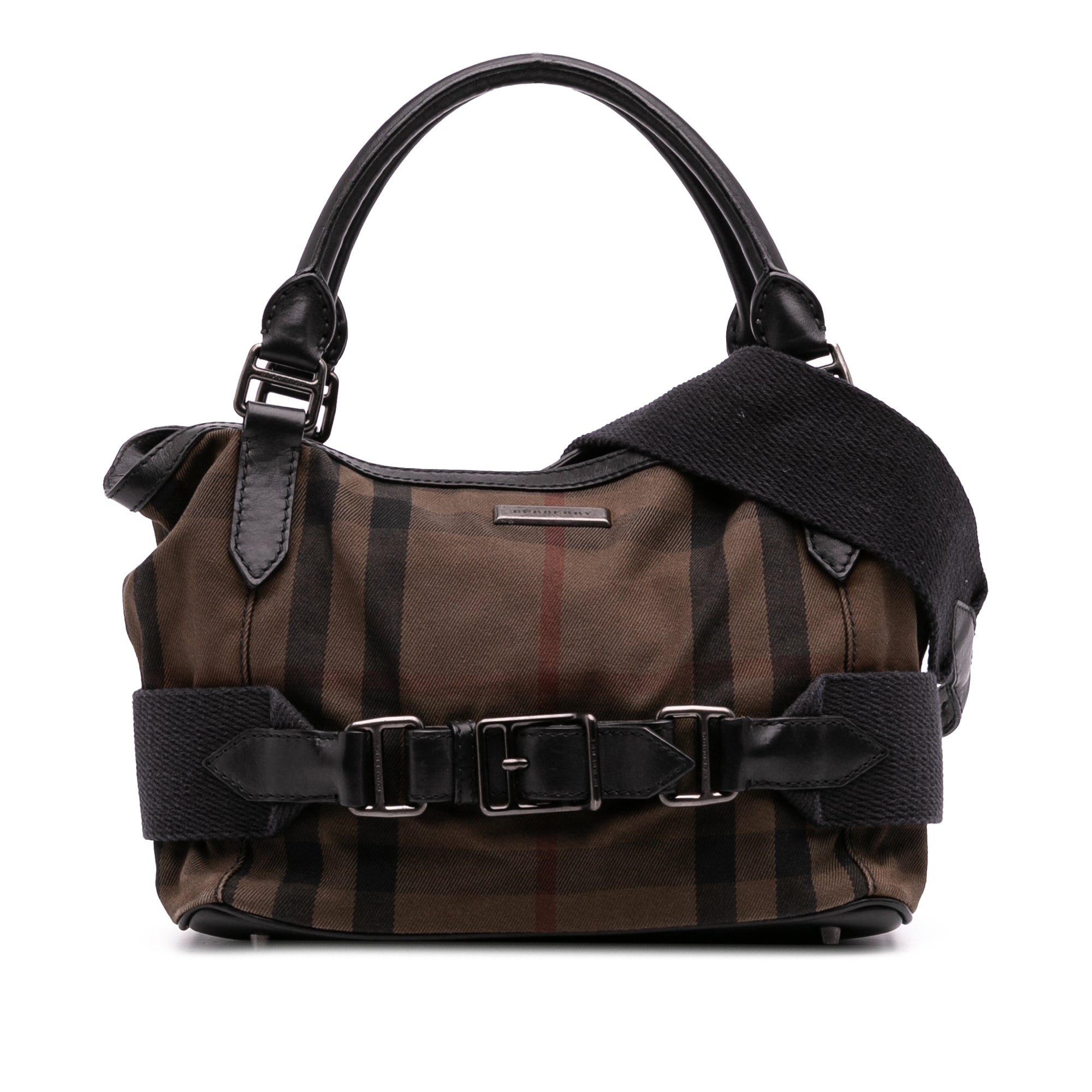 This satchel features a house check canvas body with leather trim and belt details, rolled leather top handles, a detachable and adjustable shoulder strap, an open top, an interior zip compartment, and an interior zip pocket. Retail Price: 845.00