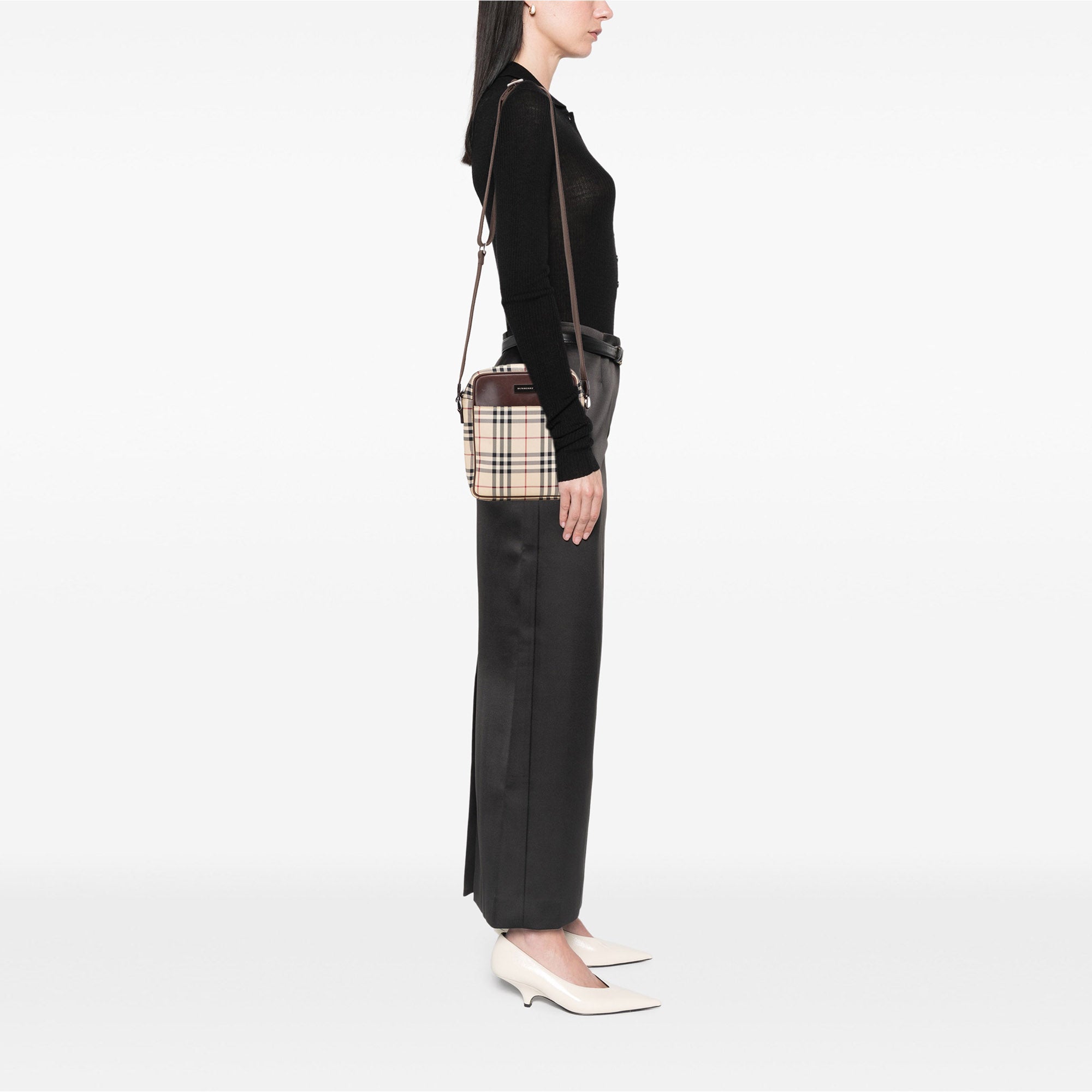 This crossbody bag features a house check canvas body with leather trim, an adjustable flat strap, a top zip closure, an exterior slip pocket, and an interior zip pocket. Retail Price: 782.00