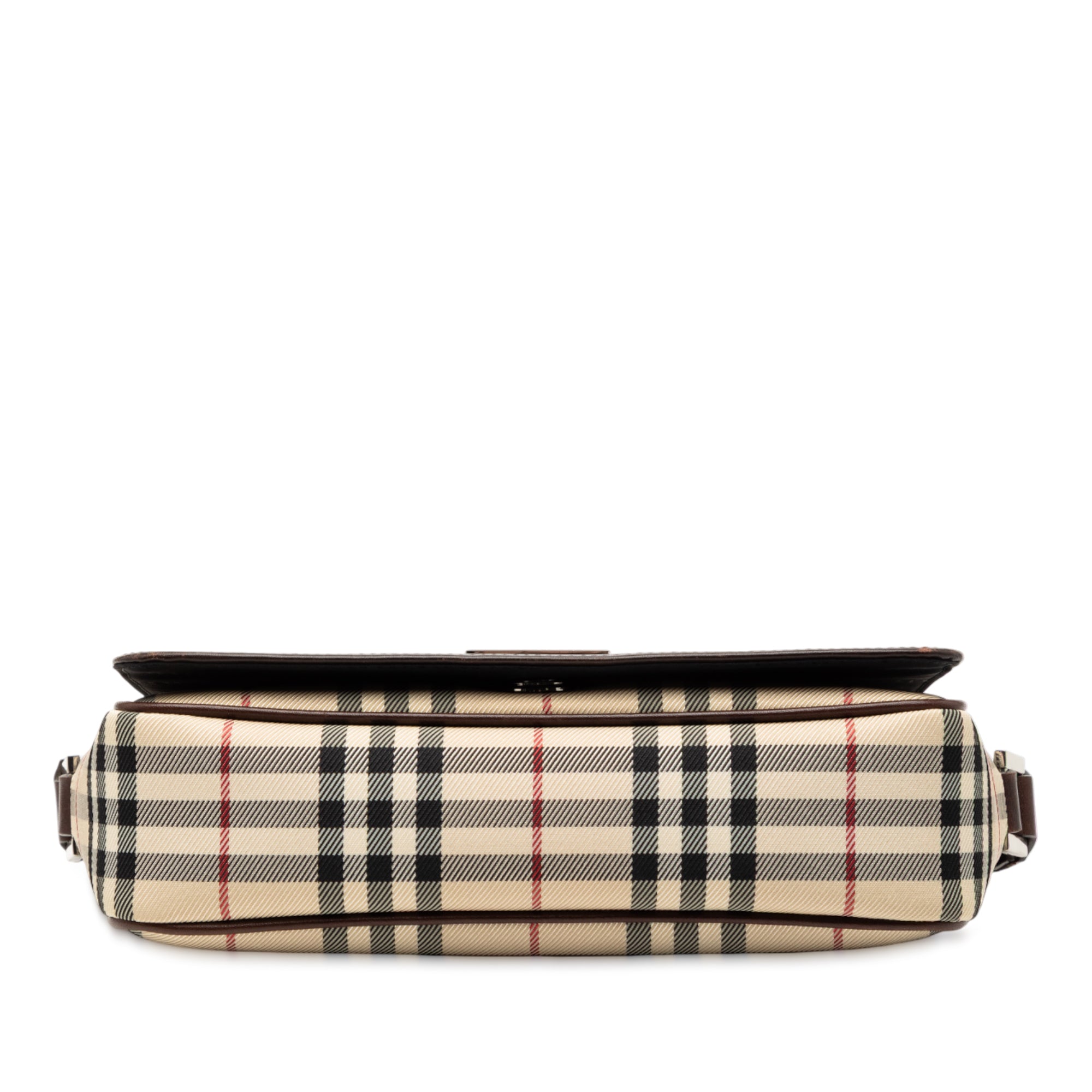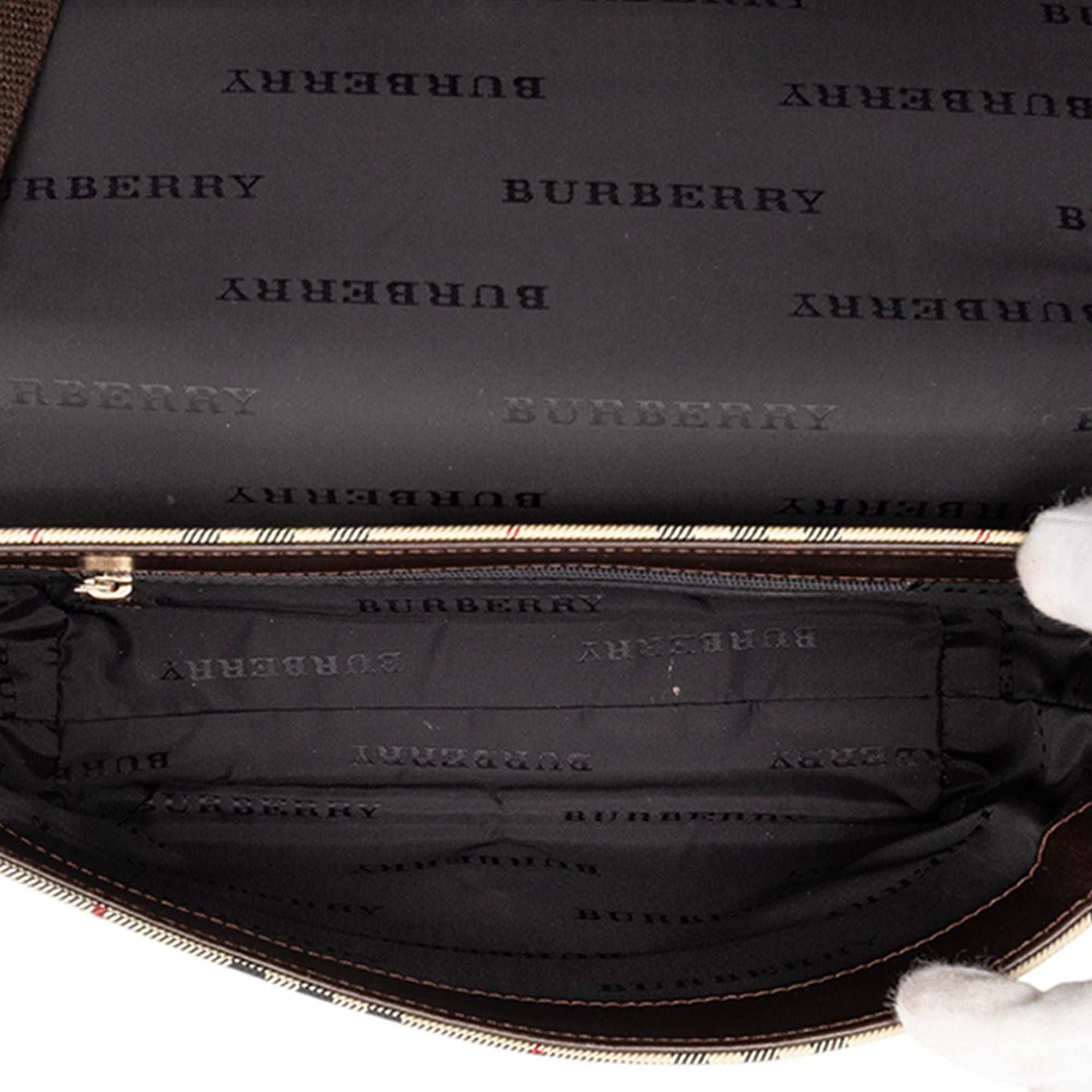 This crossbody bag features a canvas body with leather trim, an adjustable flat strap, a top flap with a magnetic snap closure, and an interior zip pocket. Retail Price: 538.00
