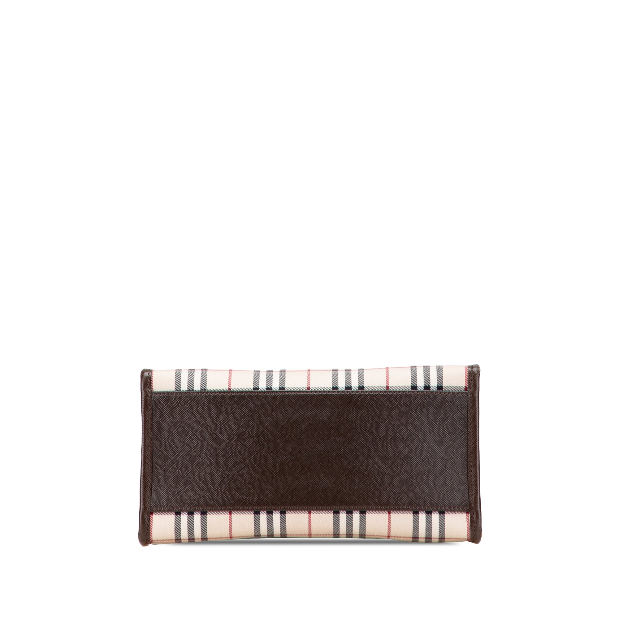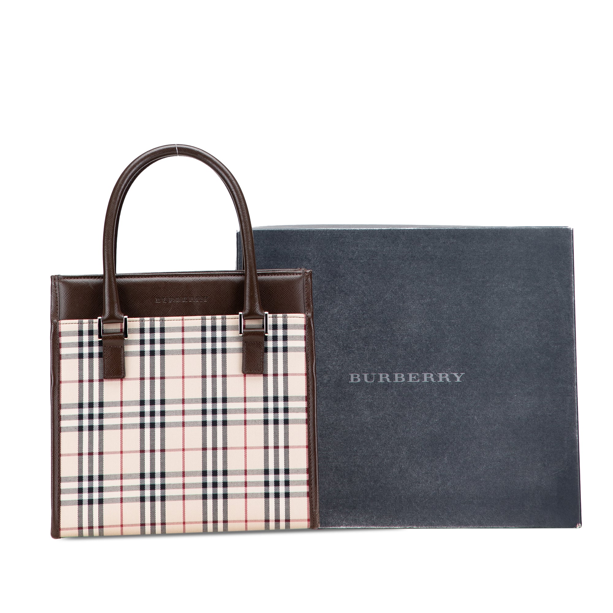 This handbag features a house check canvas body with leather trim, rolled leather handles, an open top with magnetic snap closure, and interior zip and slip pockets. Inclusion: box. Retail Price: 950.00
