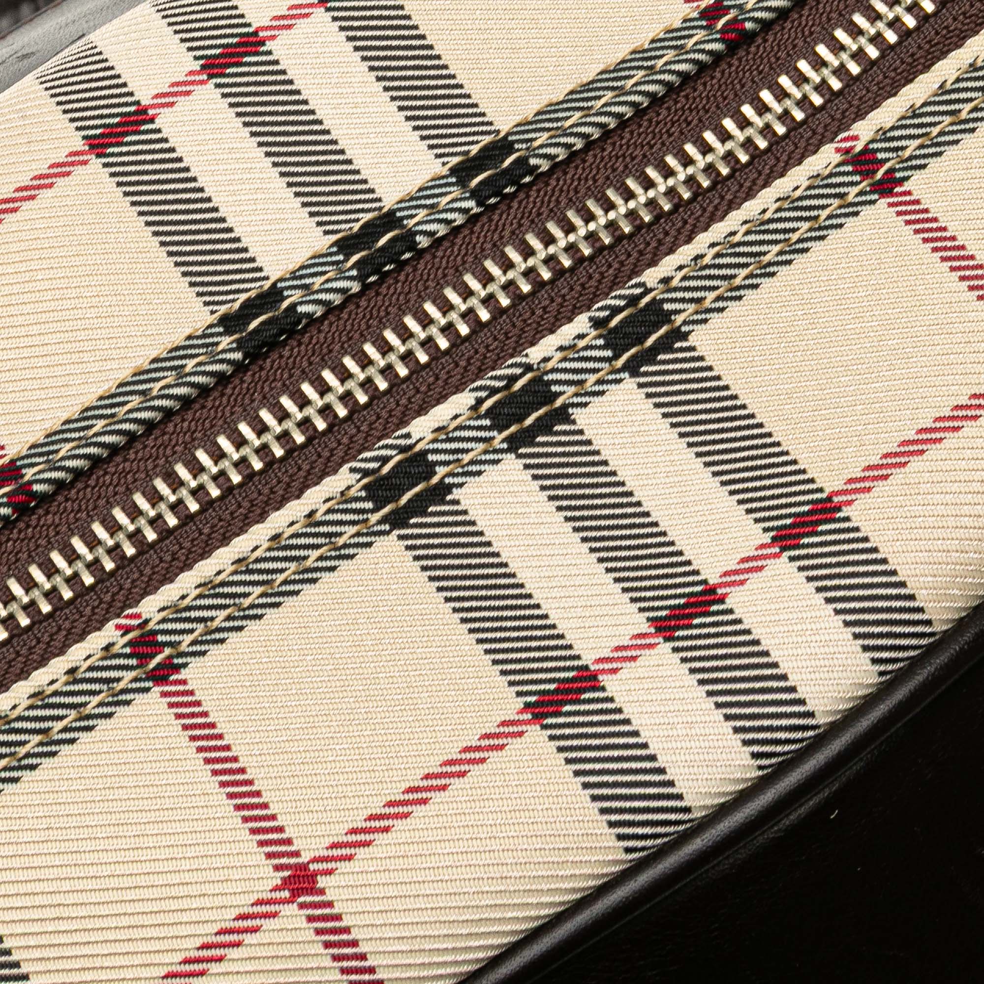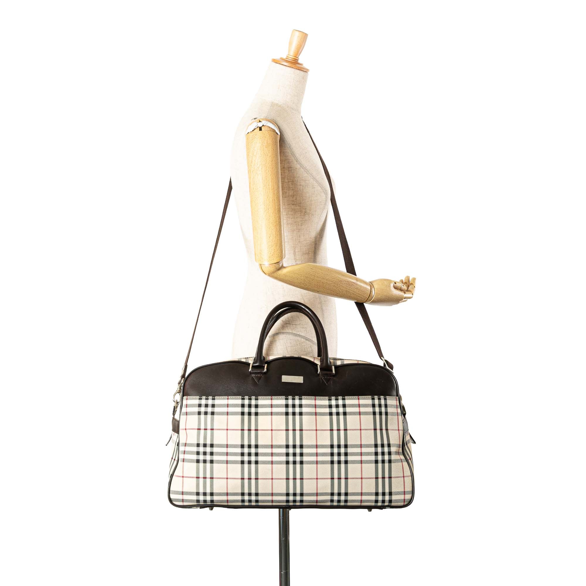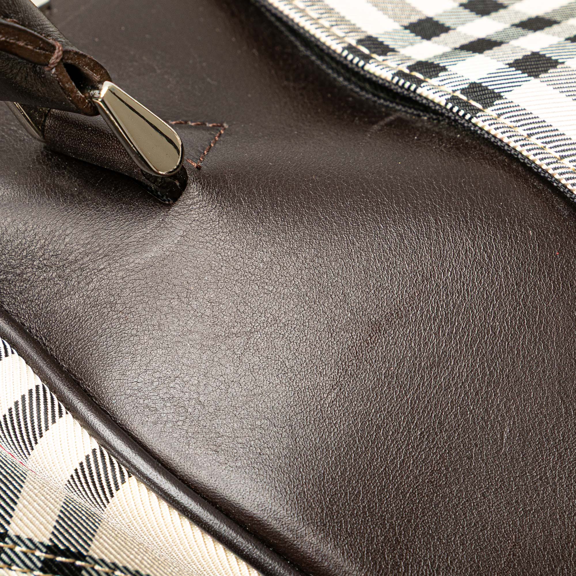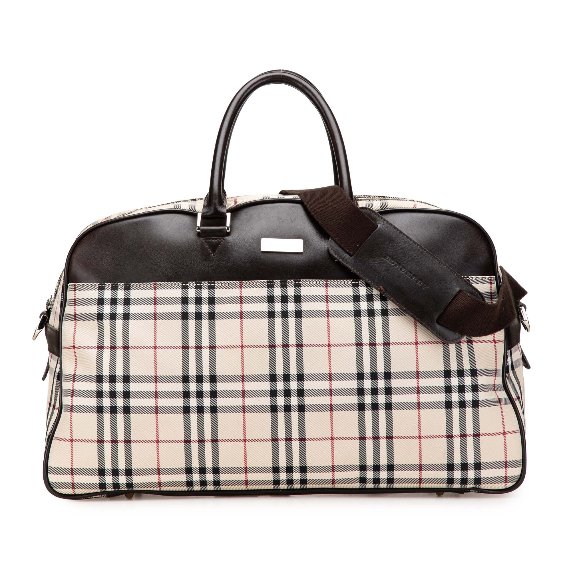 This travel bag features a house check canvas body with leather trim, rolled leather handles, a detachable and adjustable flat shoulder strap, a top zip closure, and interior zip and slip pockets. Retail Price: 1035.00