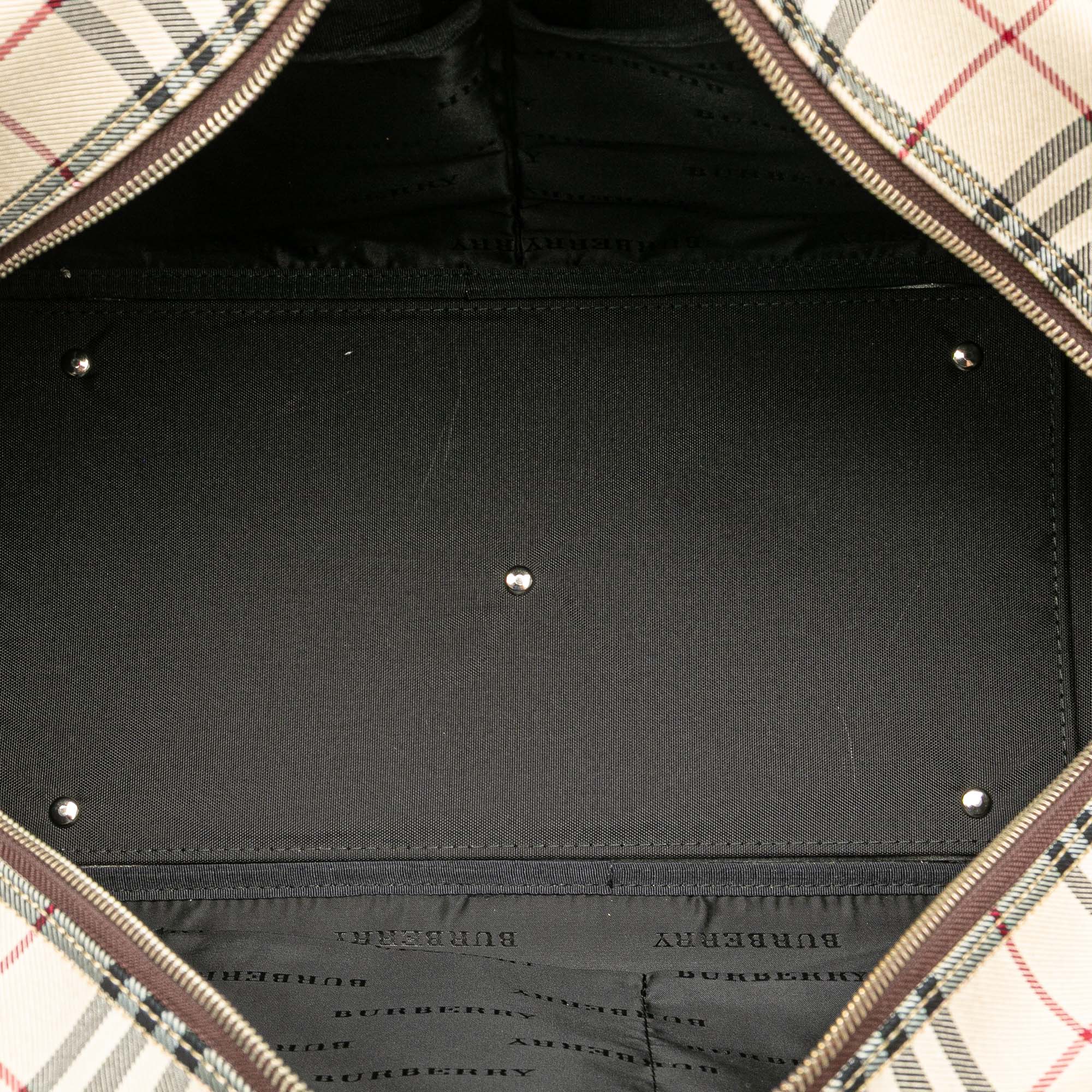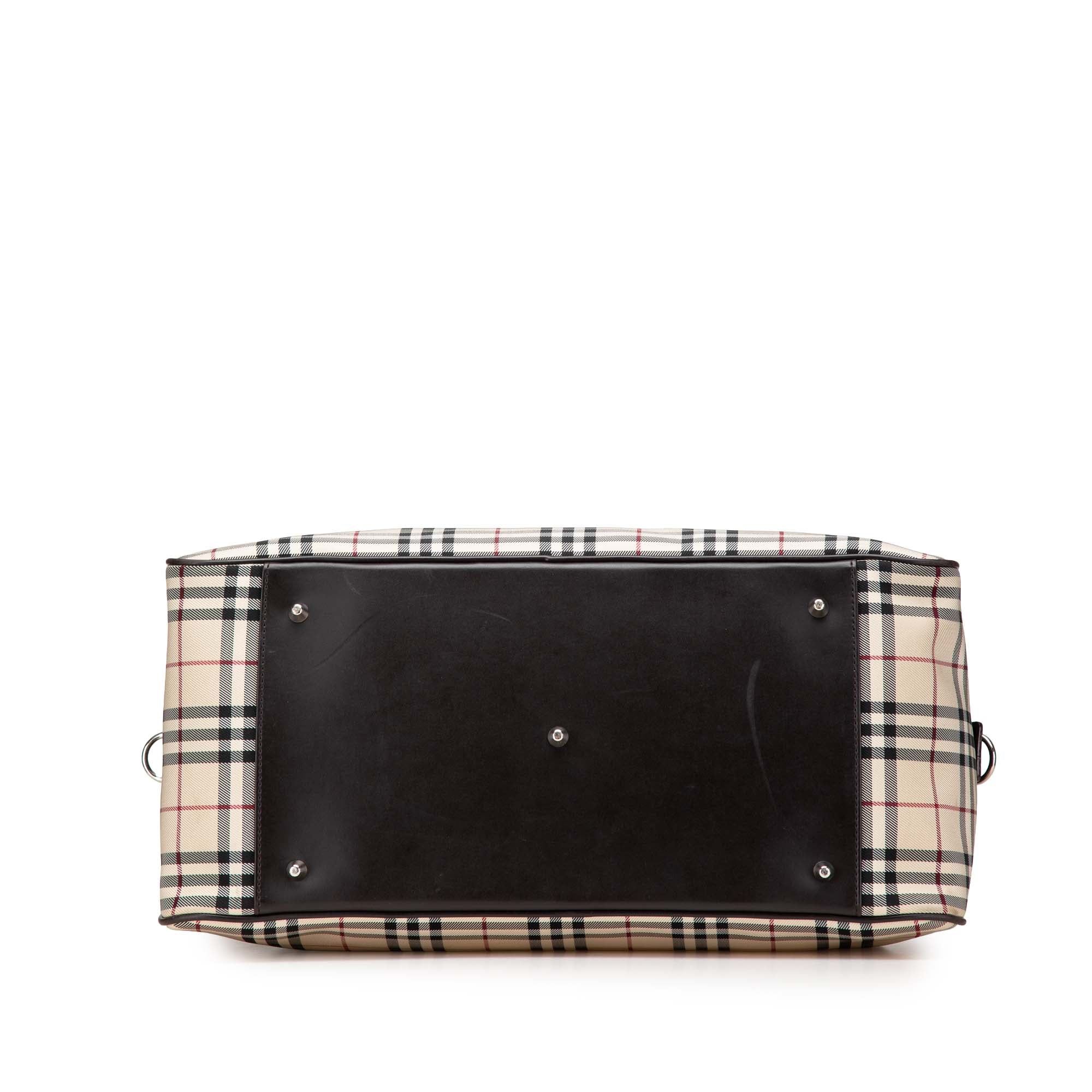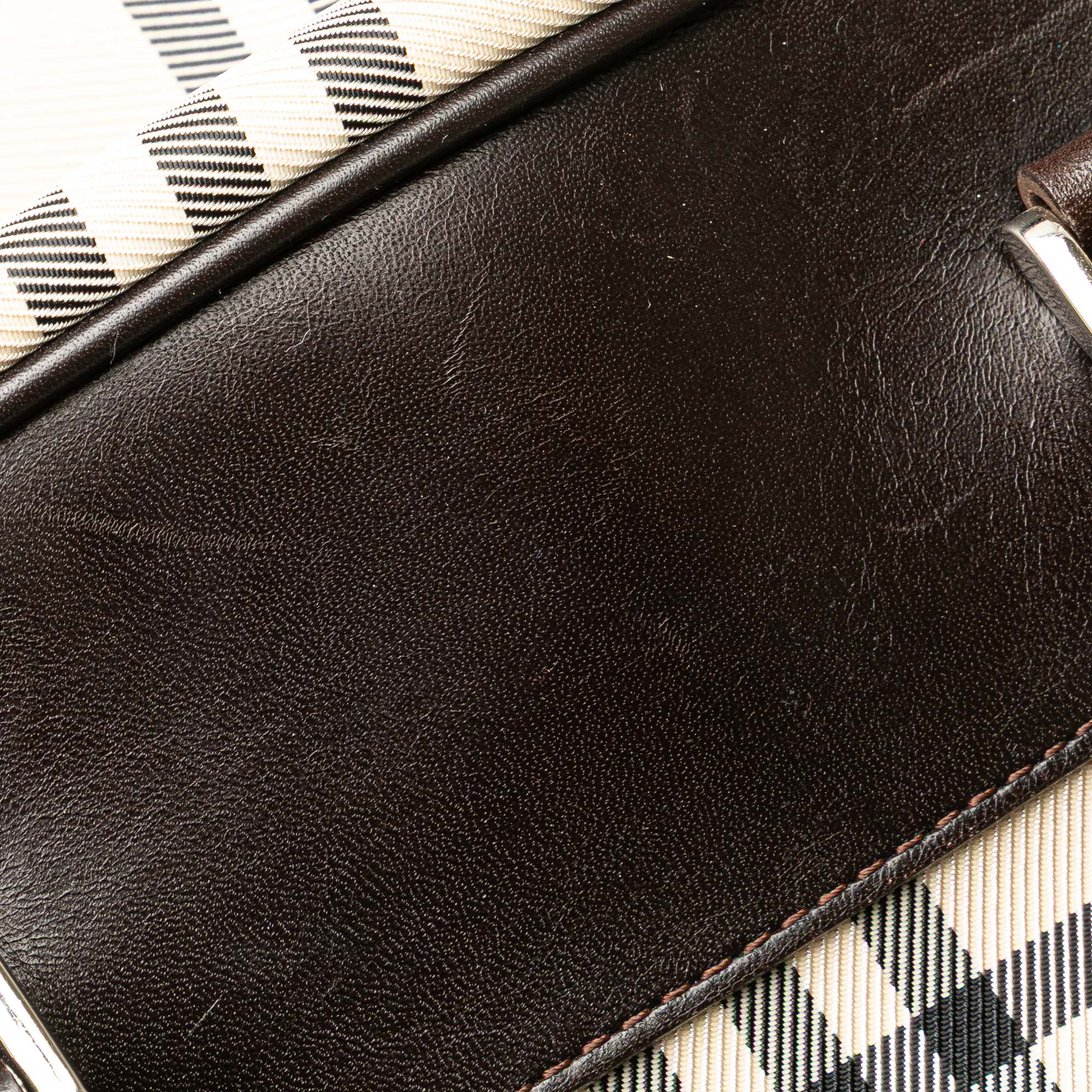 This travel bag features a house check canvas body with leather trim, rolled leather handles, a detachable and adjustable flat shoulder strap, a top zip closure, and interior zip and slip pockets. Retail Price: 1035.00