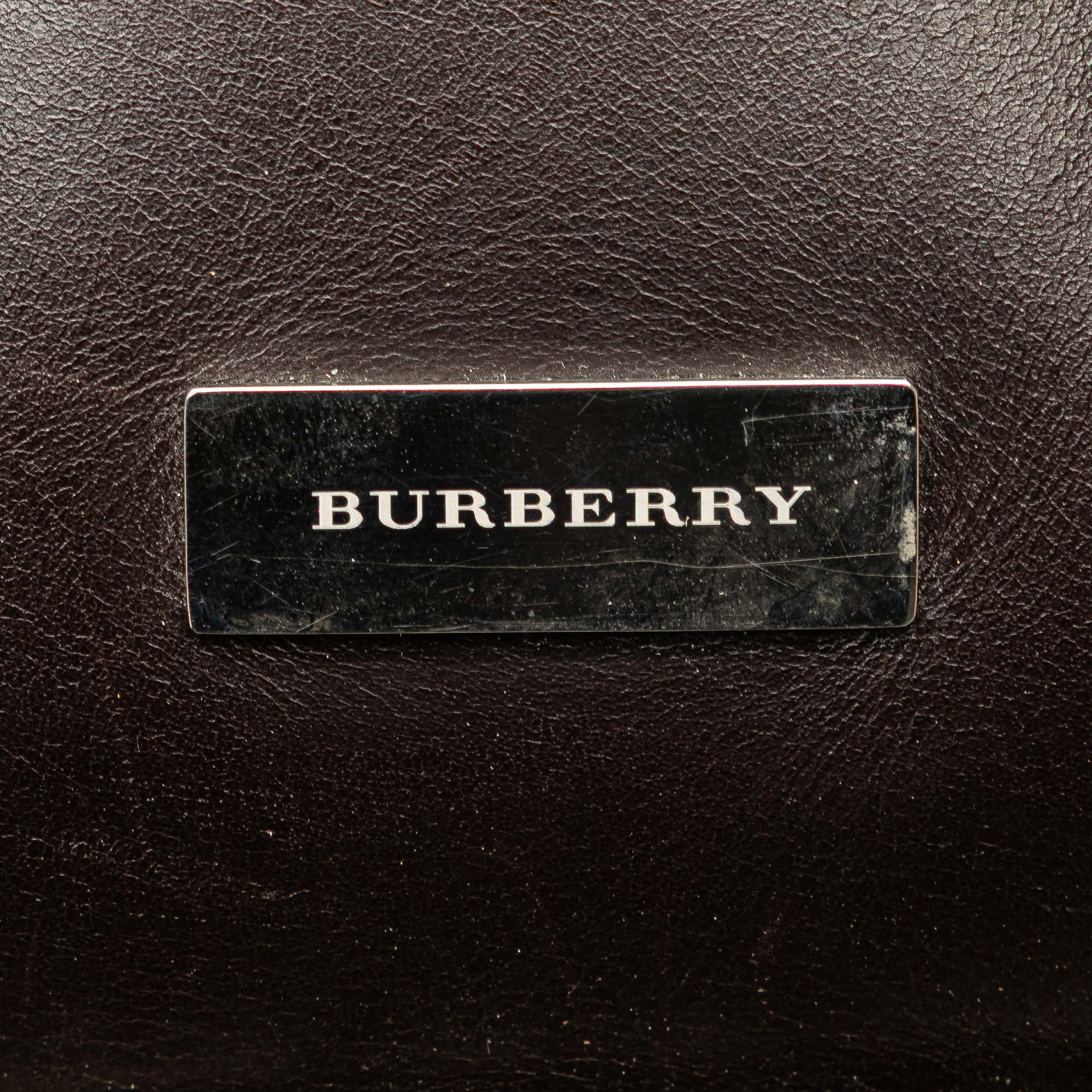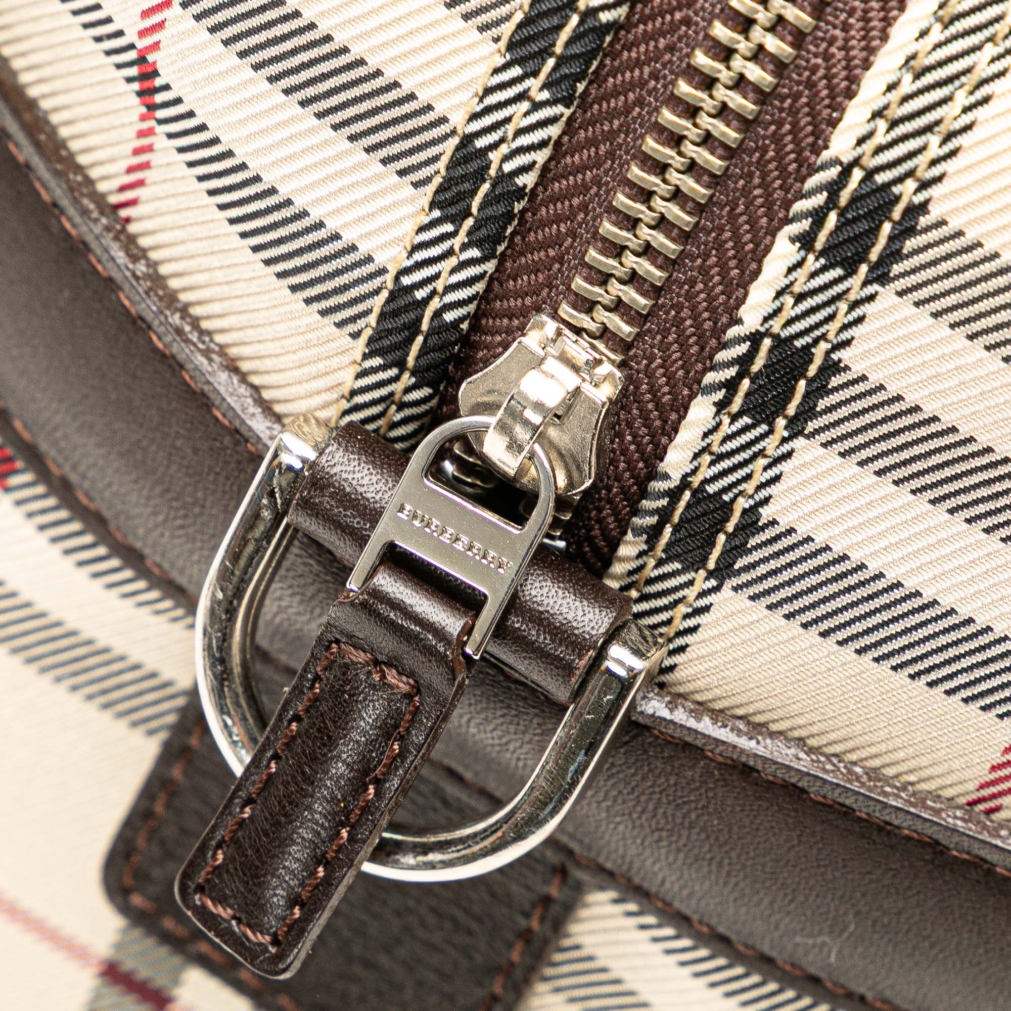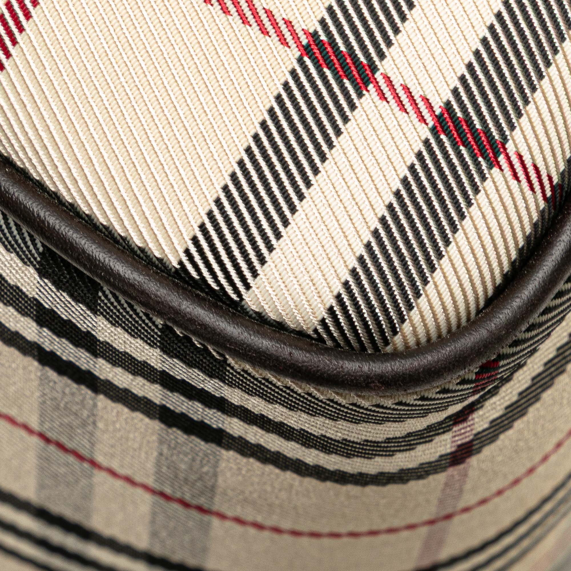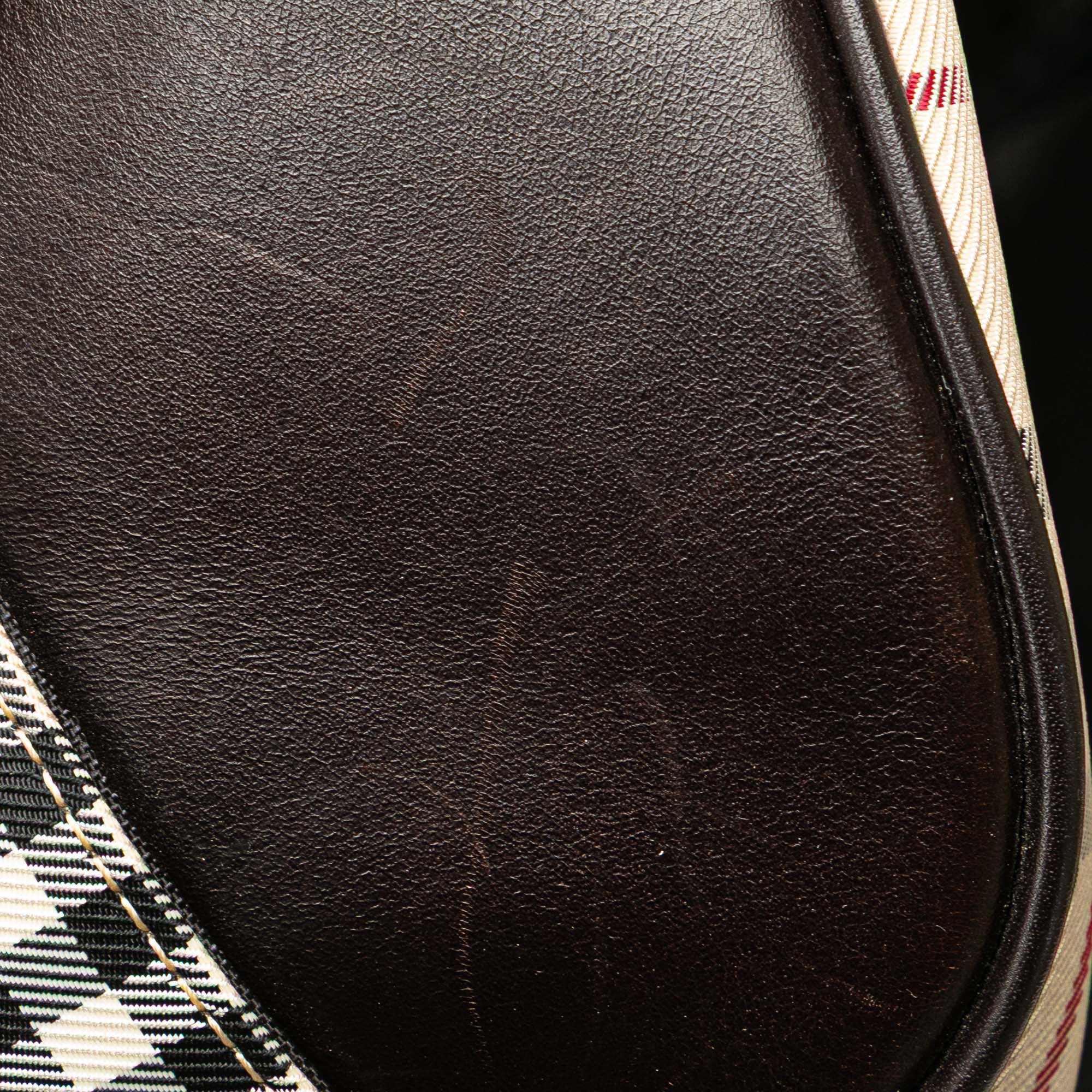 This travel bag features a house check canvas body with leather trim, rolled leather handles, a detachable and adjustable flat shoulder strap, a top zip closure, and interior zip and slip pockets. Retail Price: 1035.00