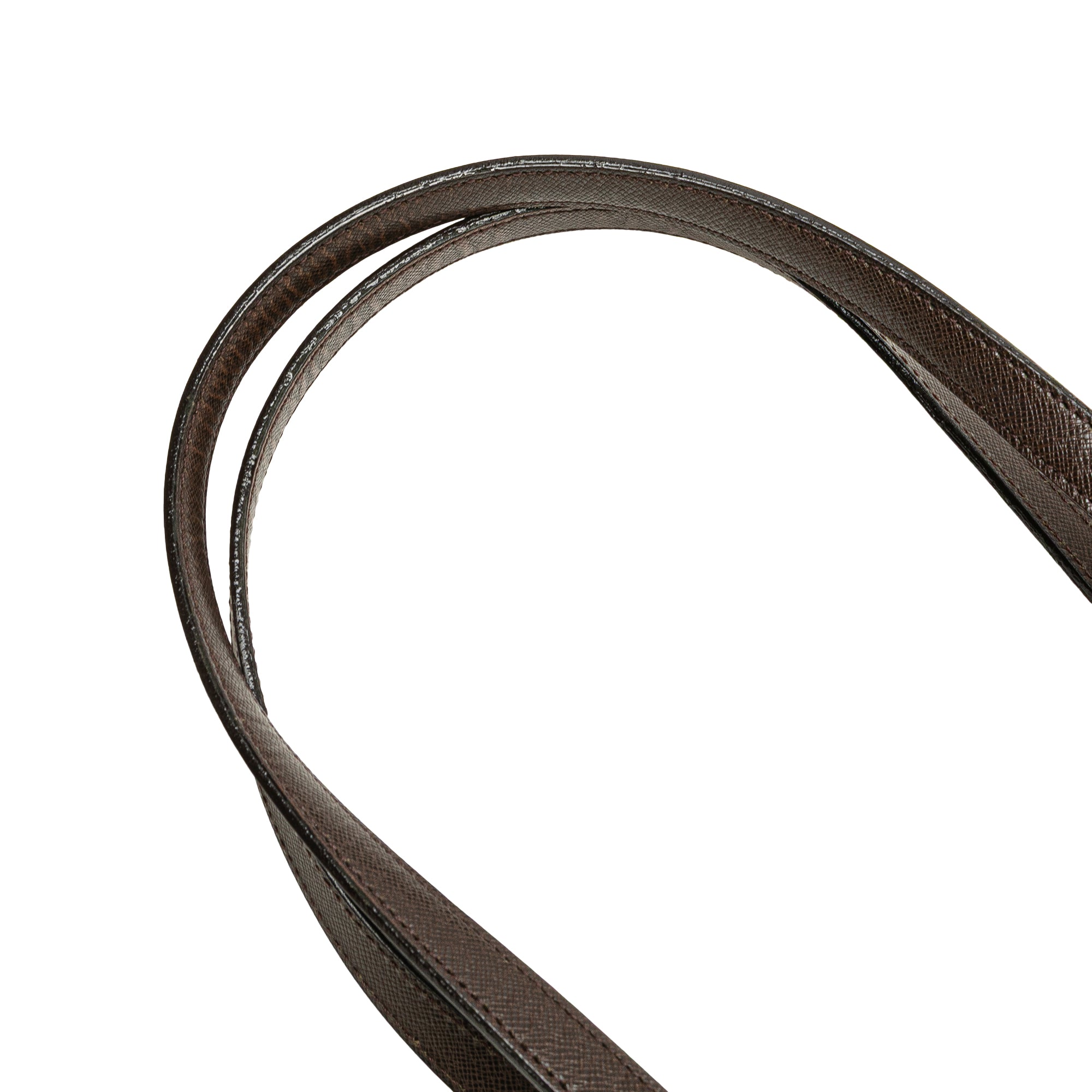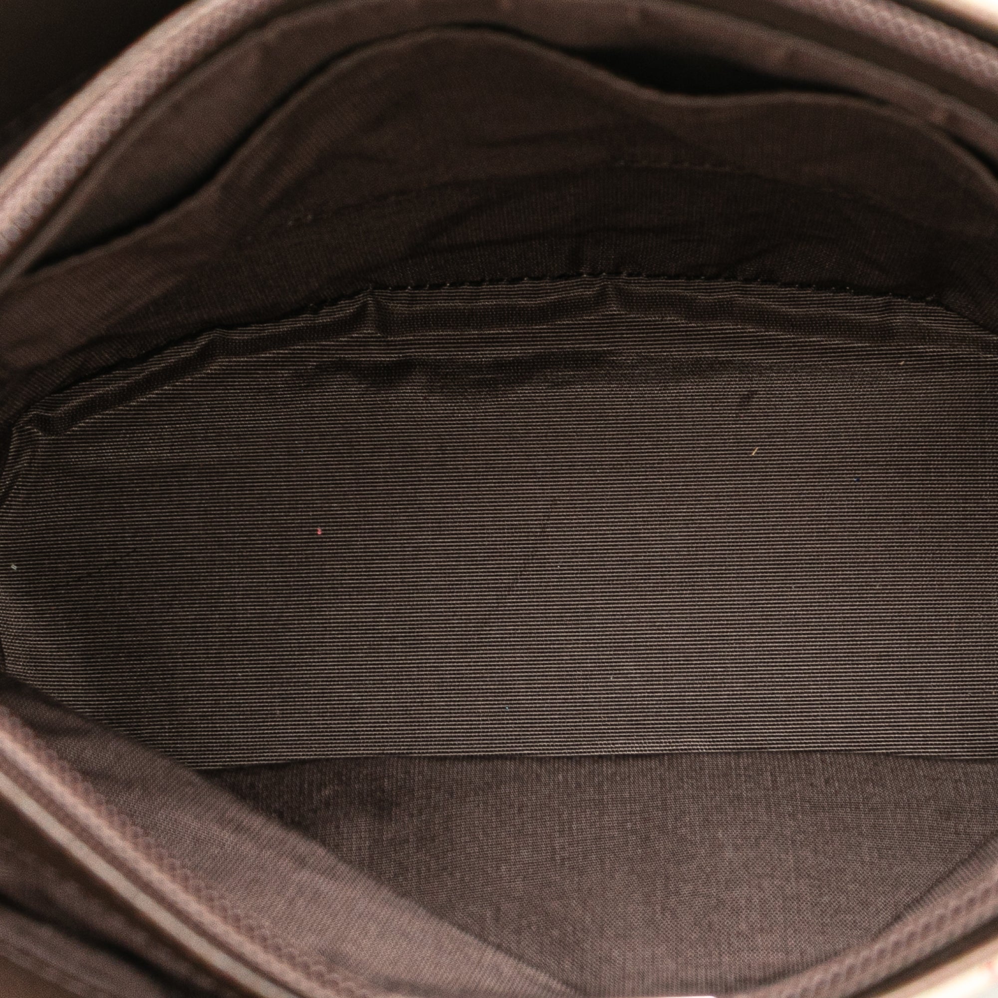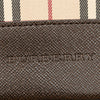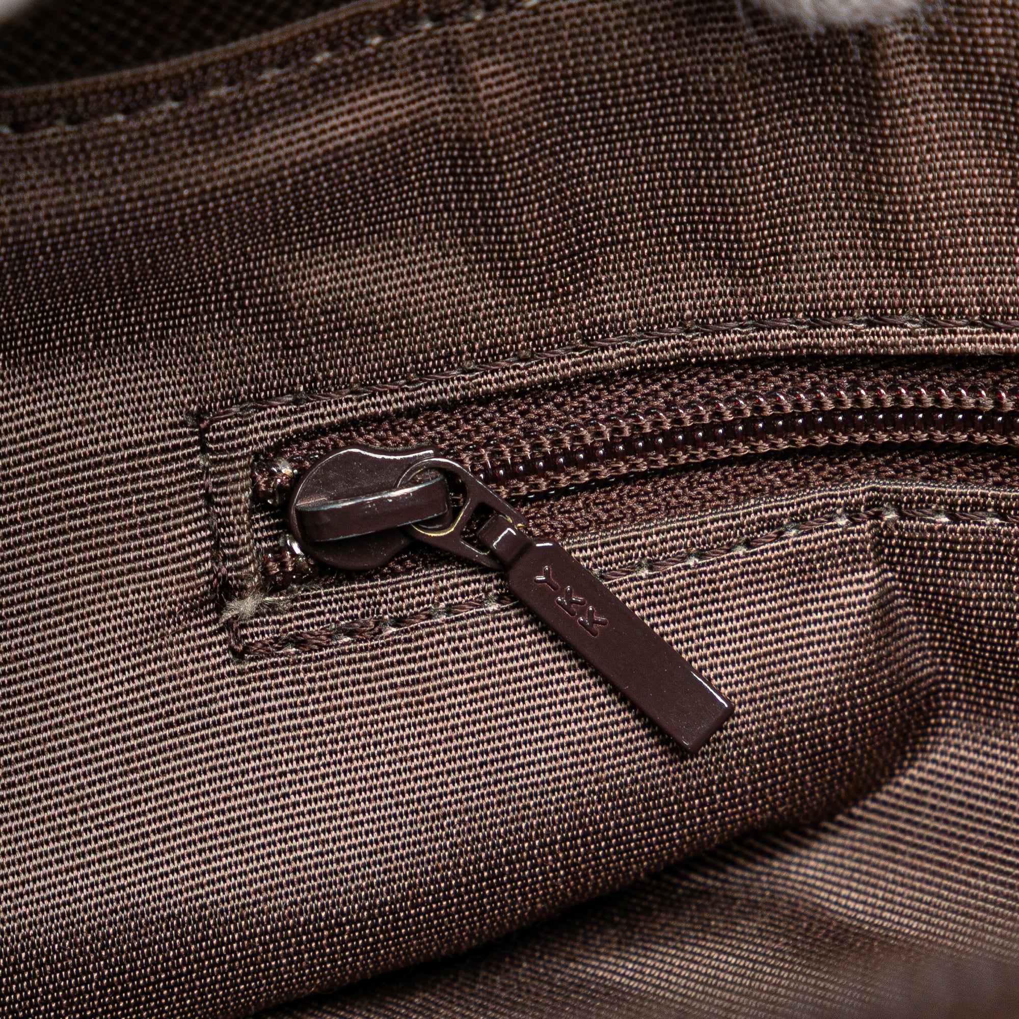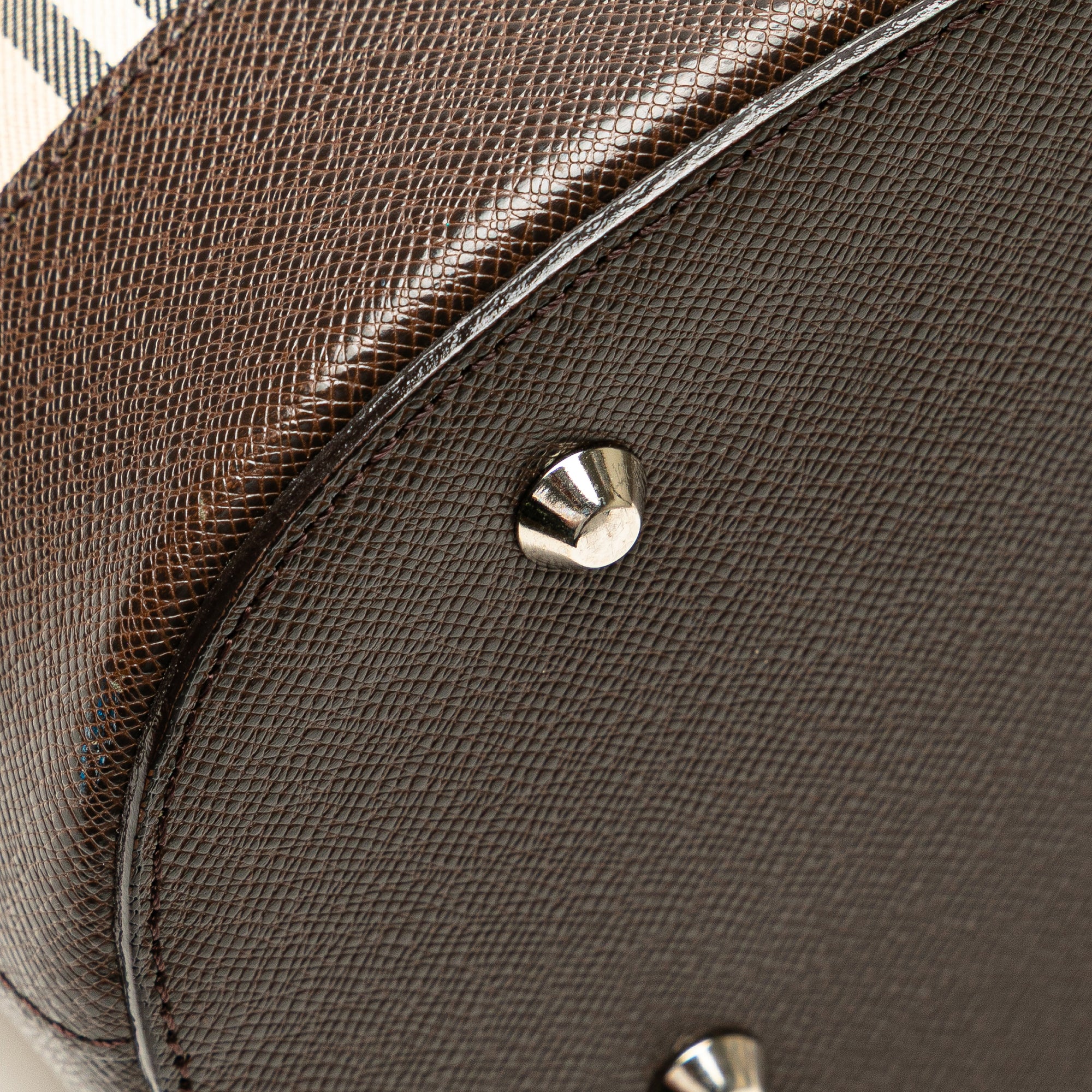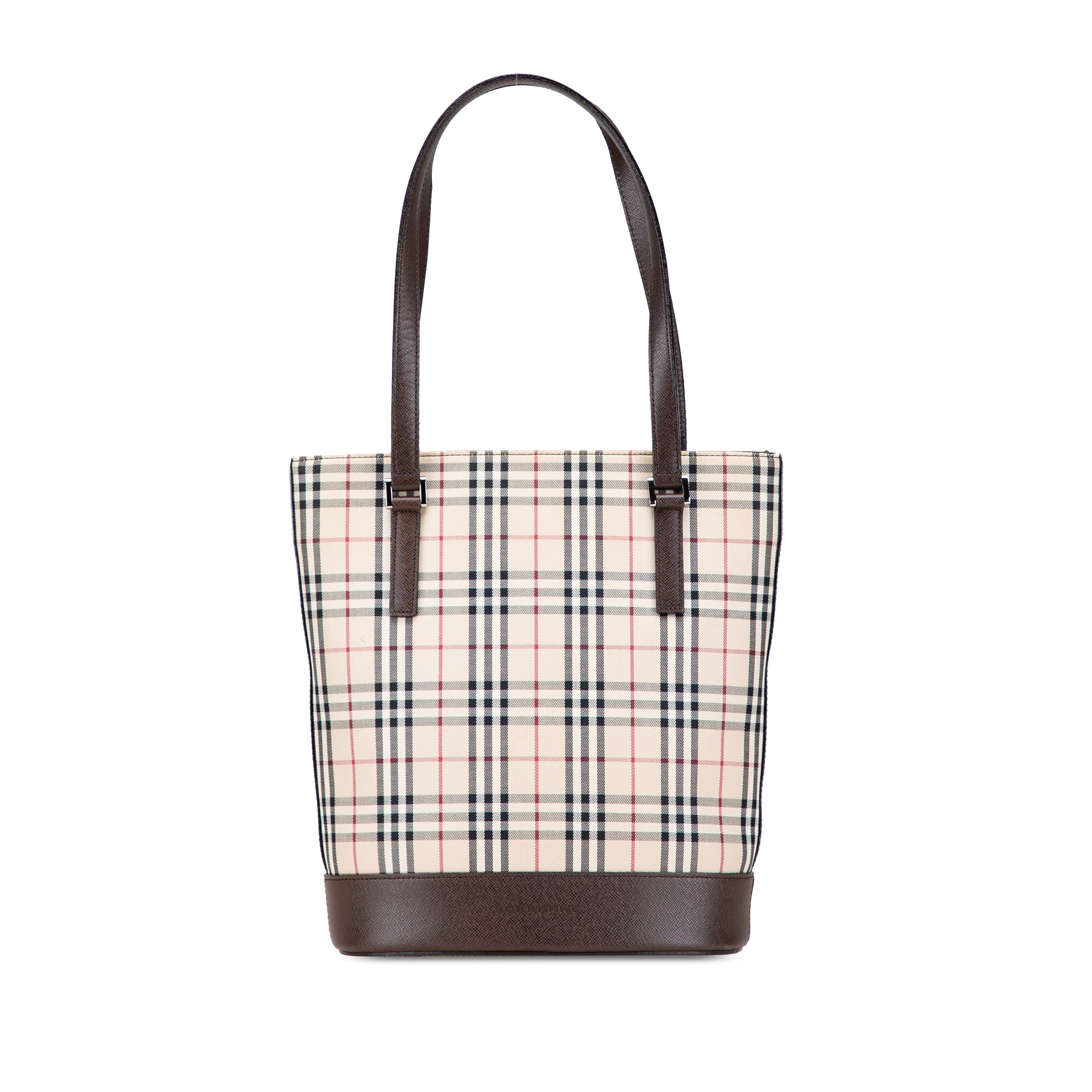 This tote bag features a house check coated canvas body with a leather bottom panel, flat leather handles, a top zip closure, and interior zip and slip pockets. Retail Price: 836.00