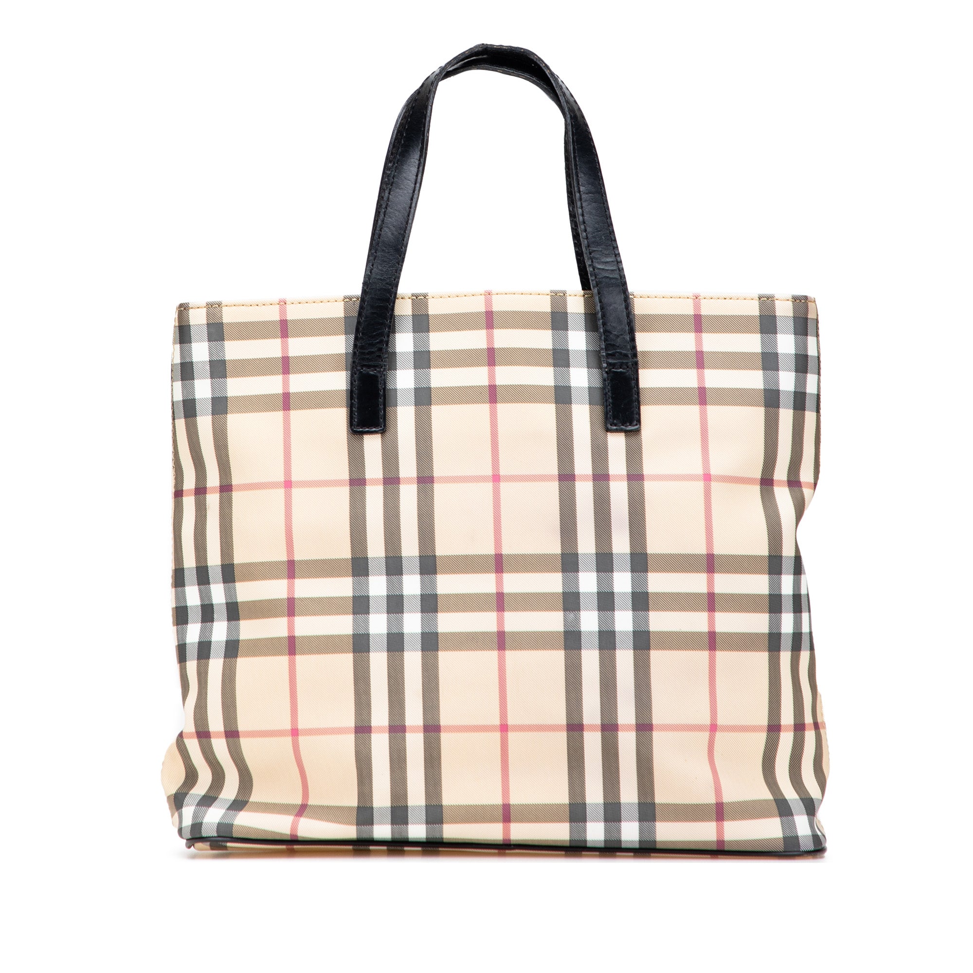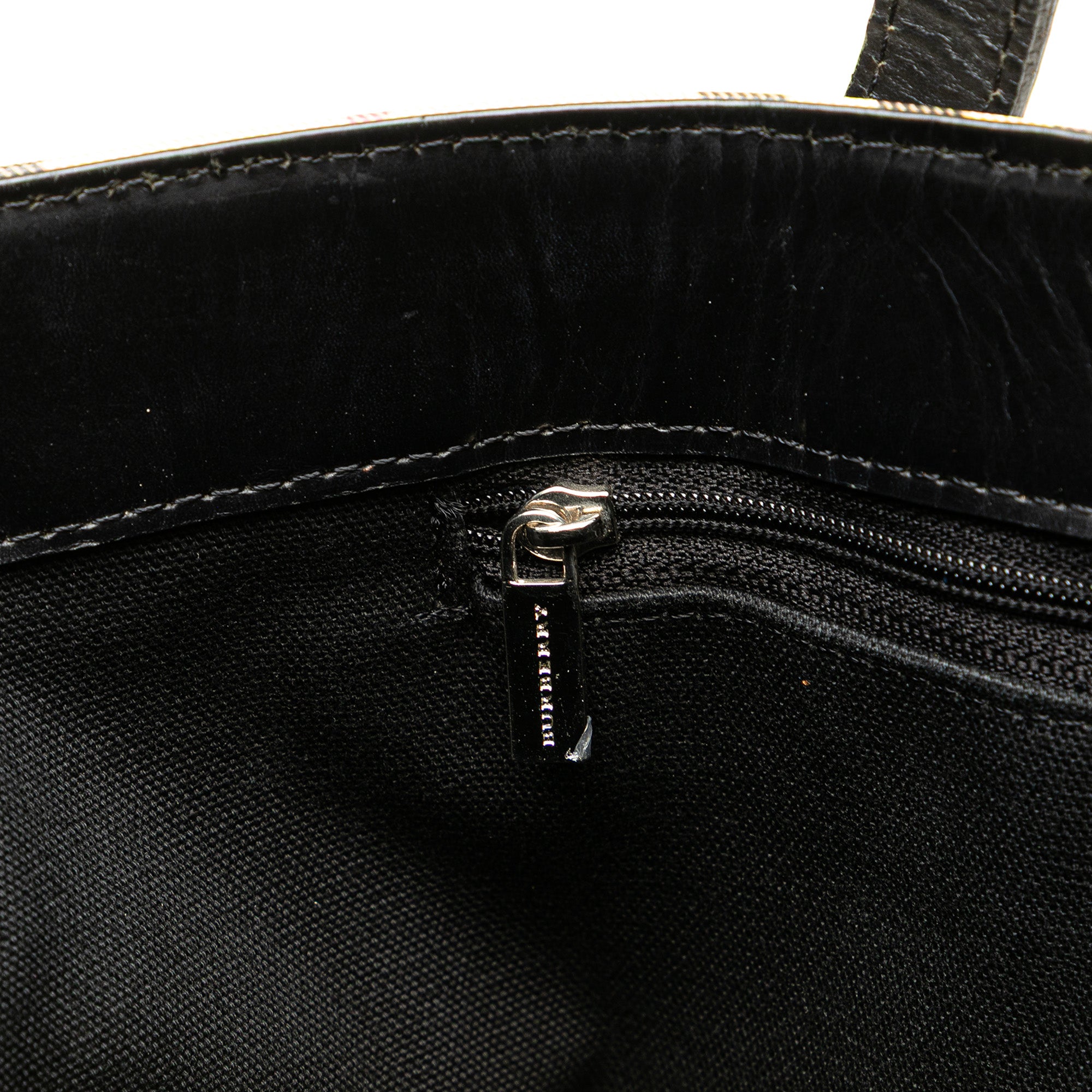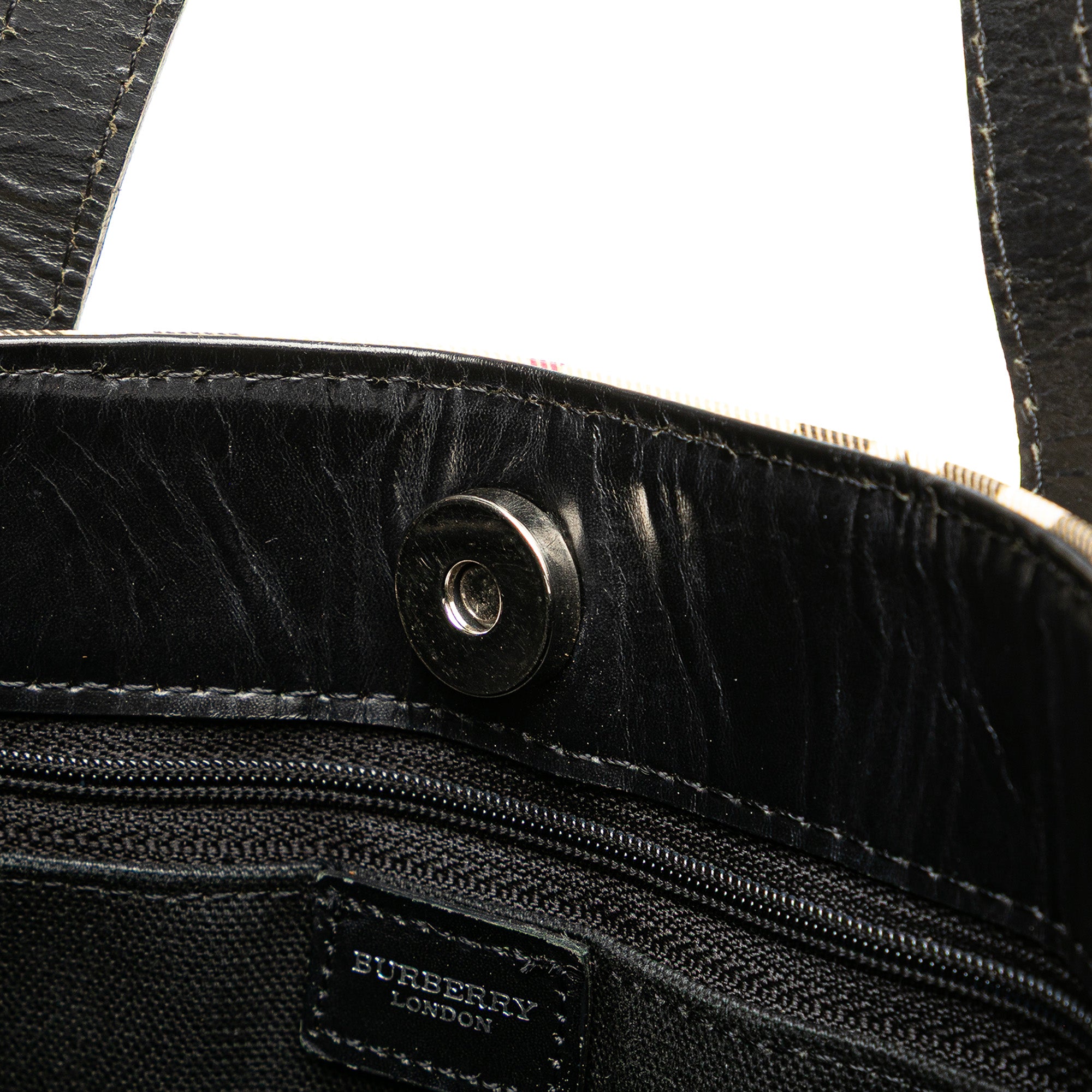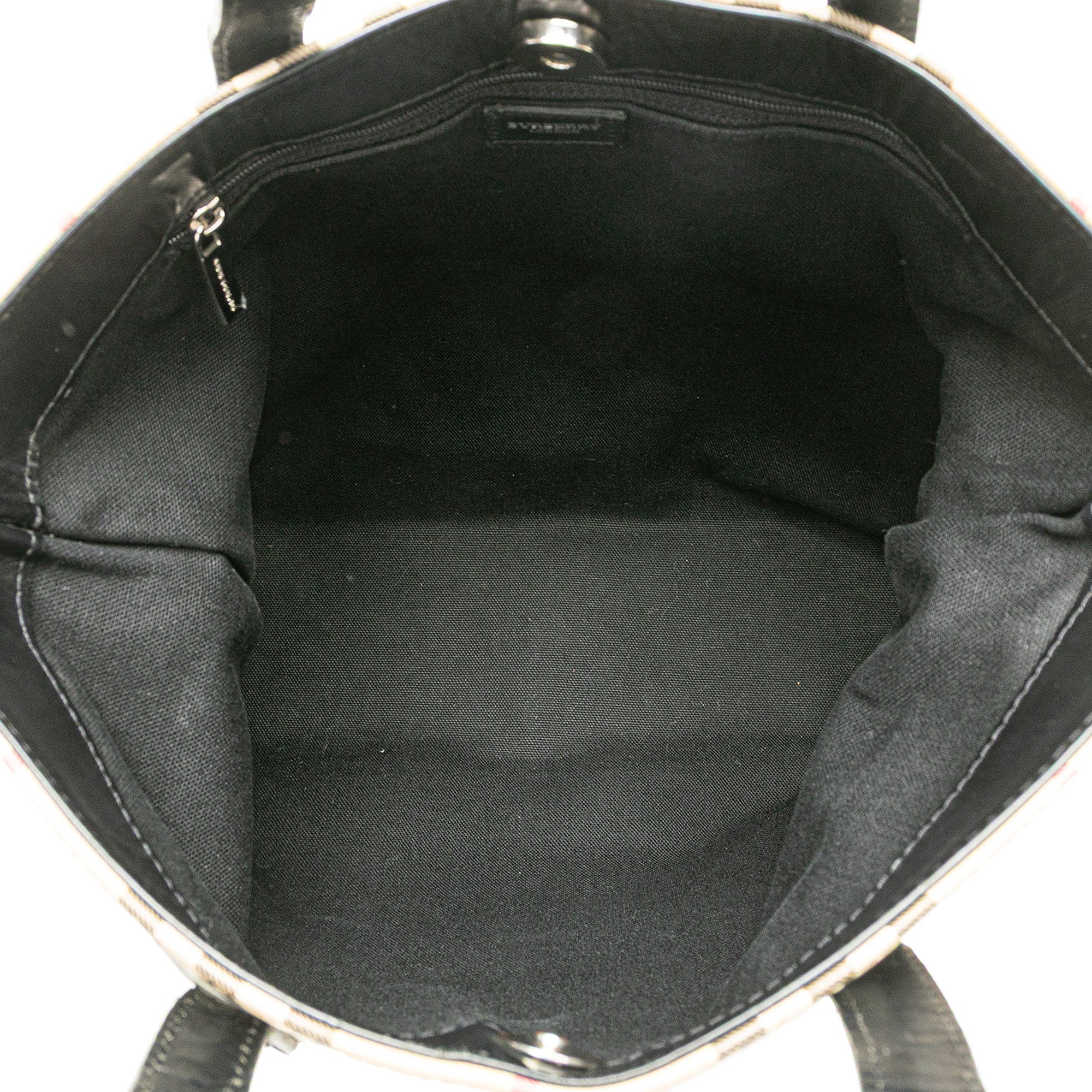 This tote bag features a coated canvas body, flat leather handles, an open top with magnetic snap closure, and an interior zip pocket. Retail Price: 950.00
