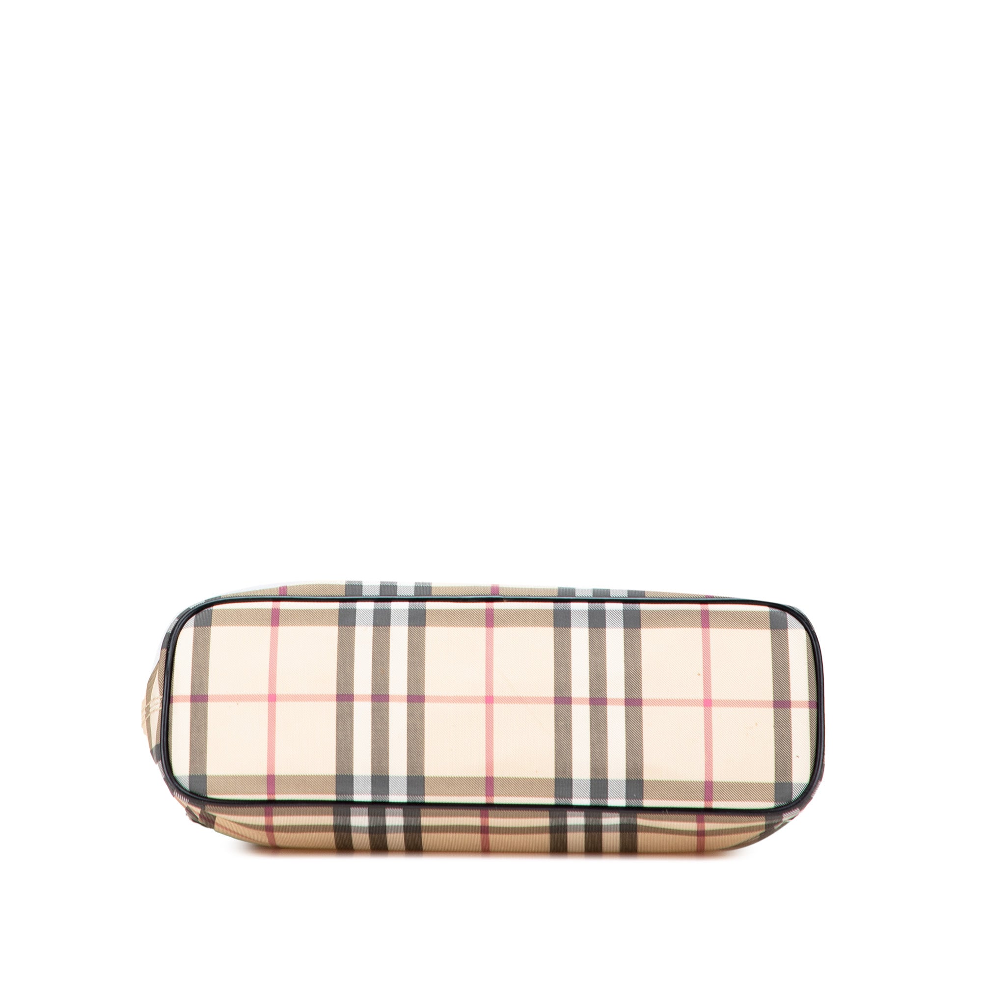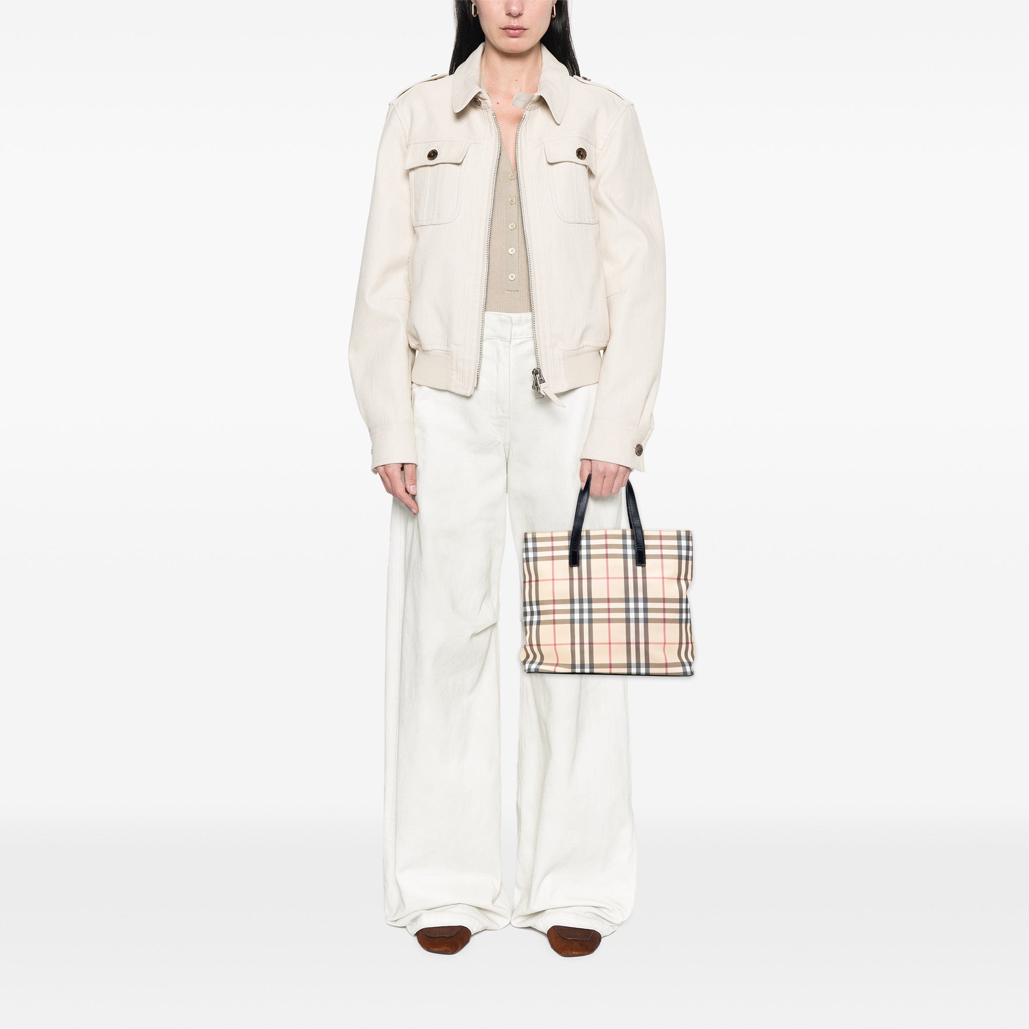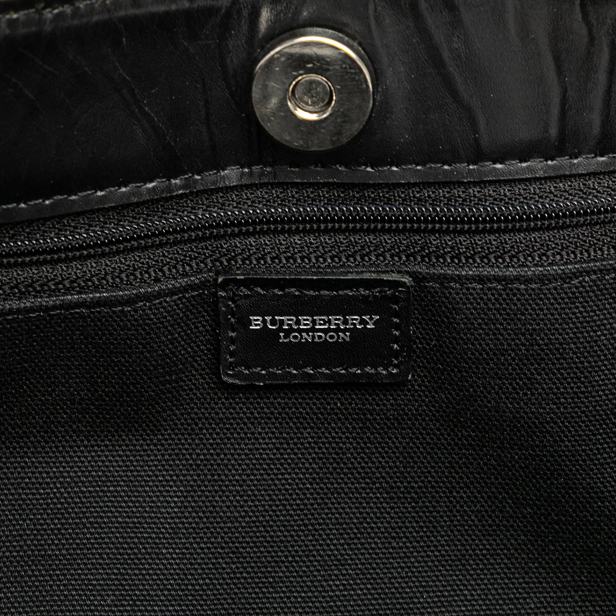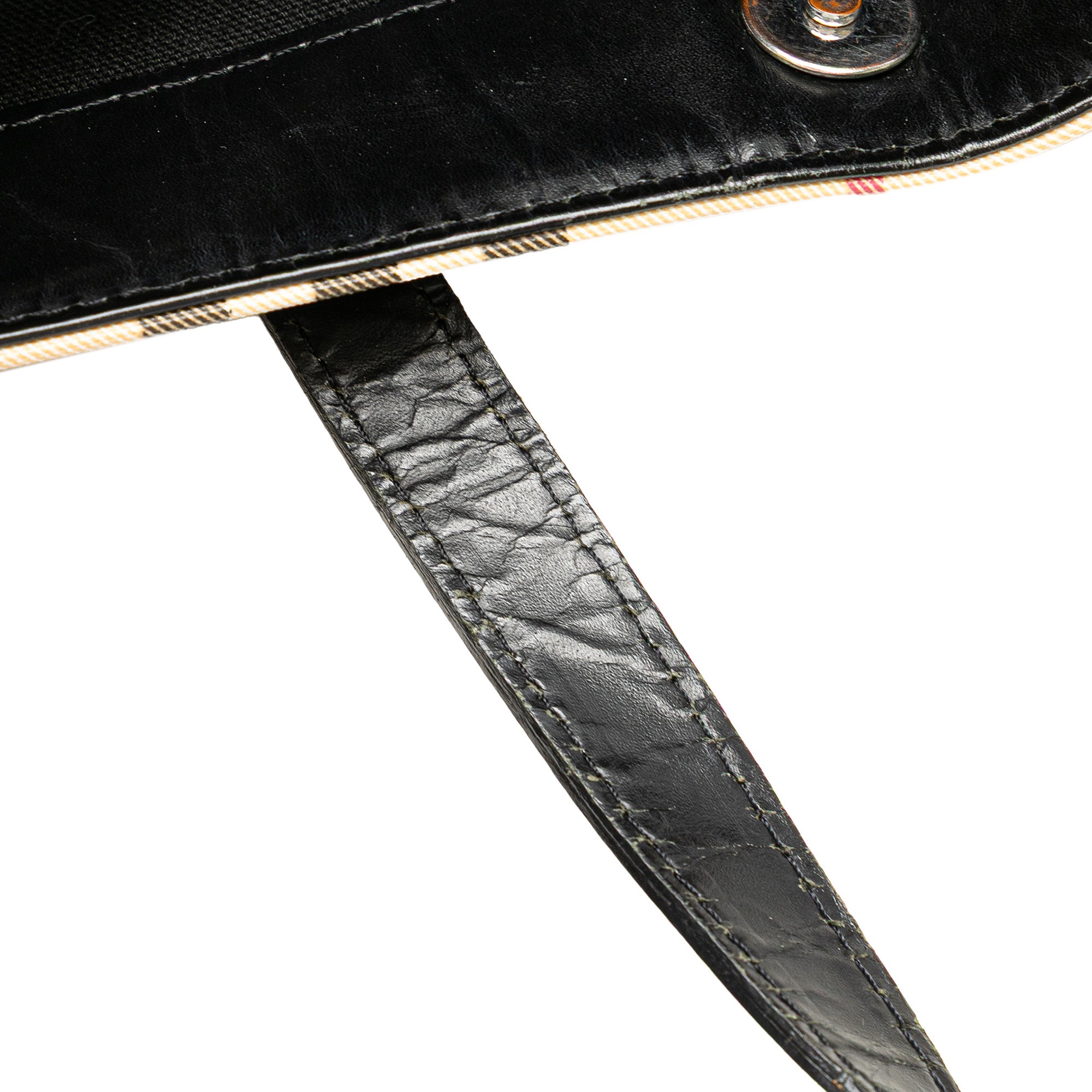 This tote bag features a coated canvas body, flat leather handles, an open top with magnetic snap closure, and an interior zip pocket. Retail Price: 950.00