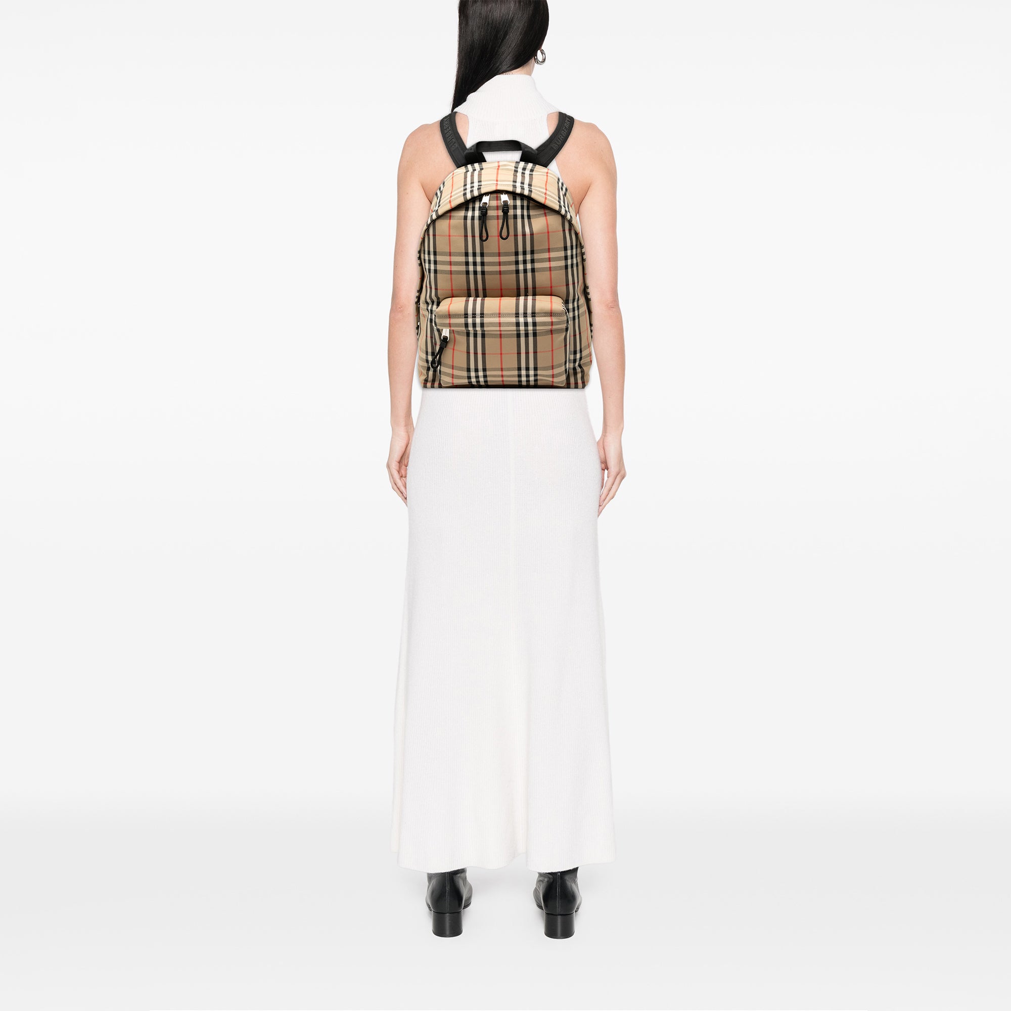 This backpack features a house check nylon body, a flat top handle, flat adjustable back shoulder straps, a top zip closure, an exterior front zip pocket, and an interior slip pocket. Retail Price: 2165.00