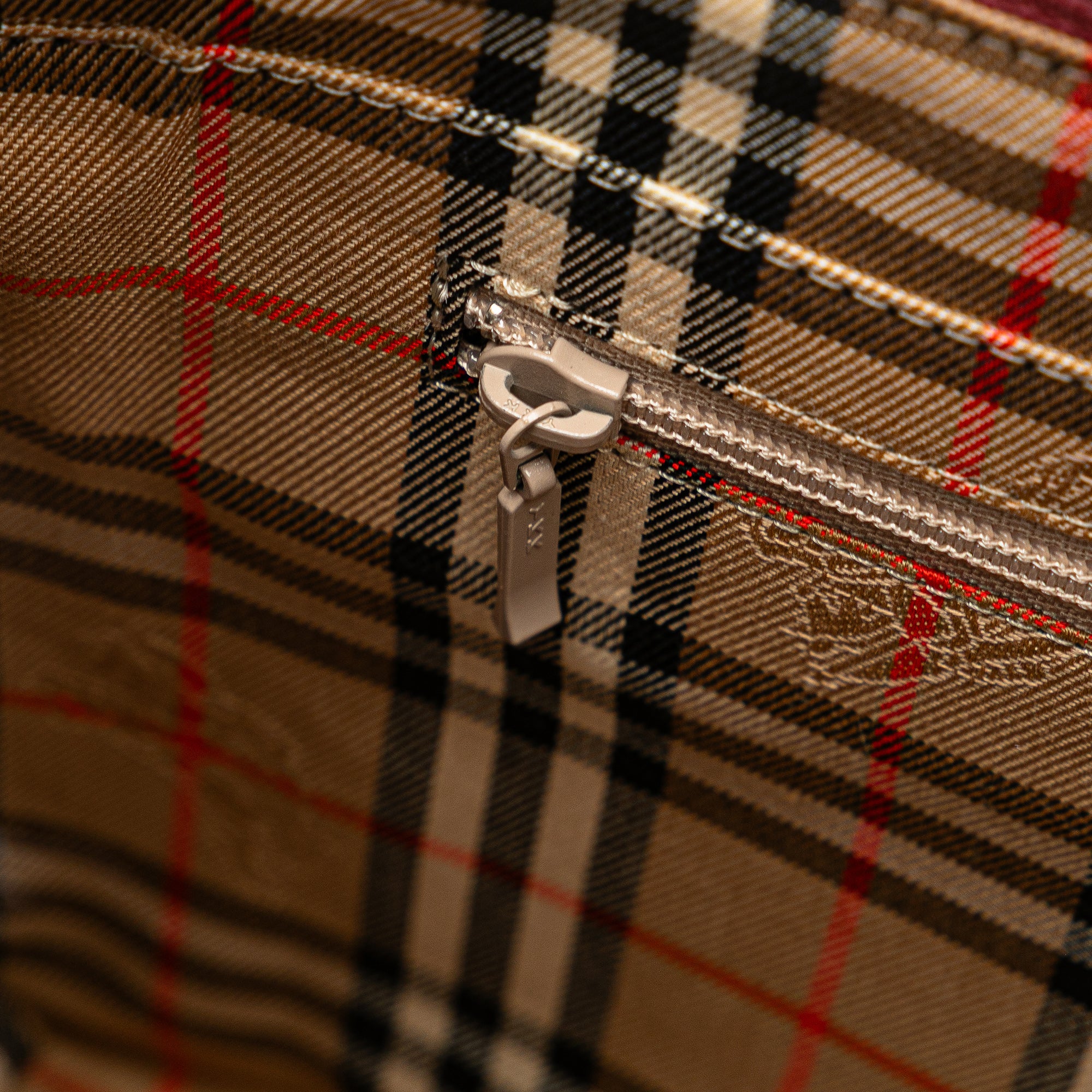 This handbag features a leather body with house check canvas trim, flat leather handles, a top zip closure, an exterior back slip pocket and interior zip and slip pockets. Retail Price: 845.00