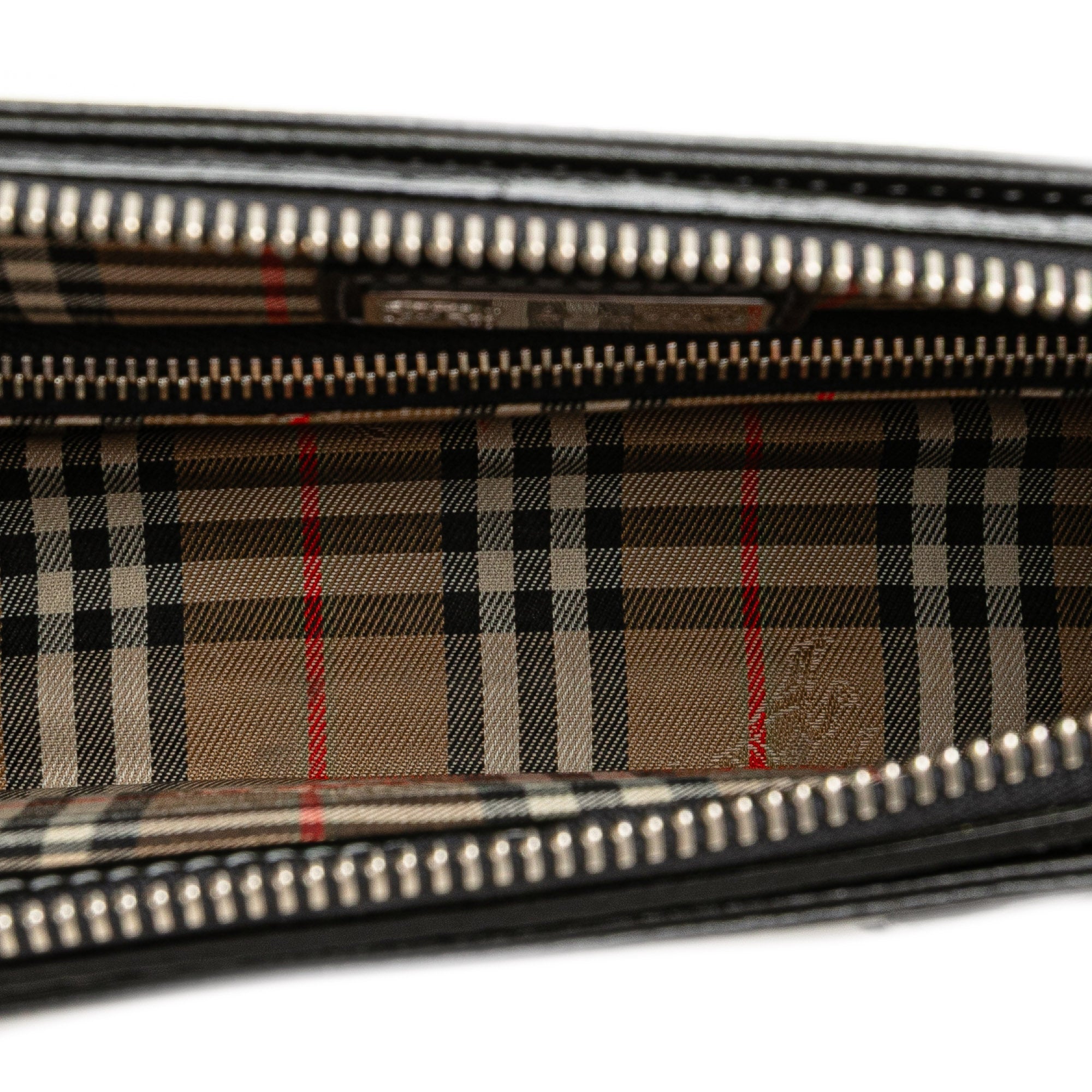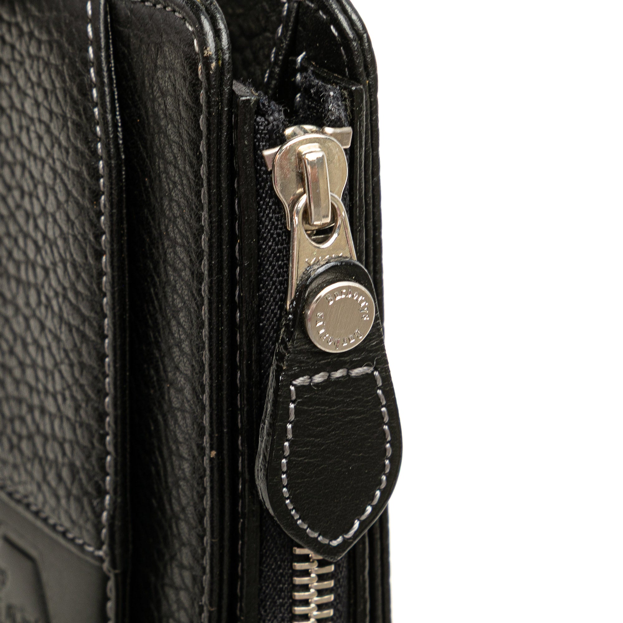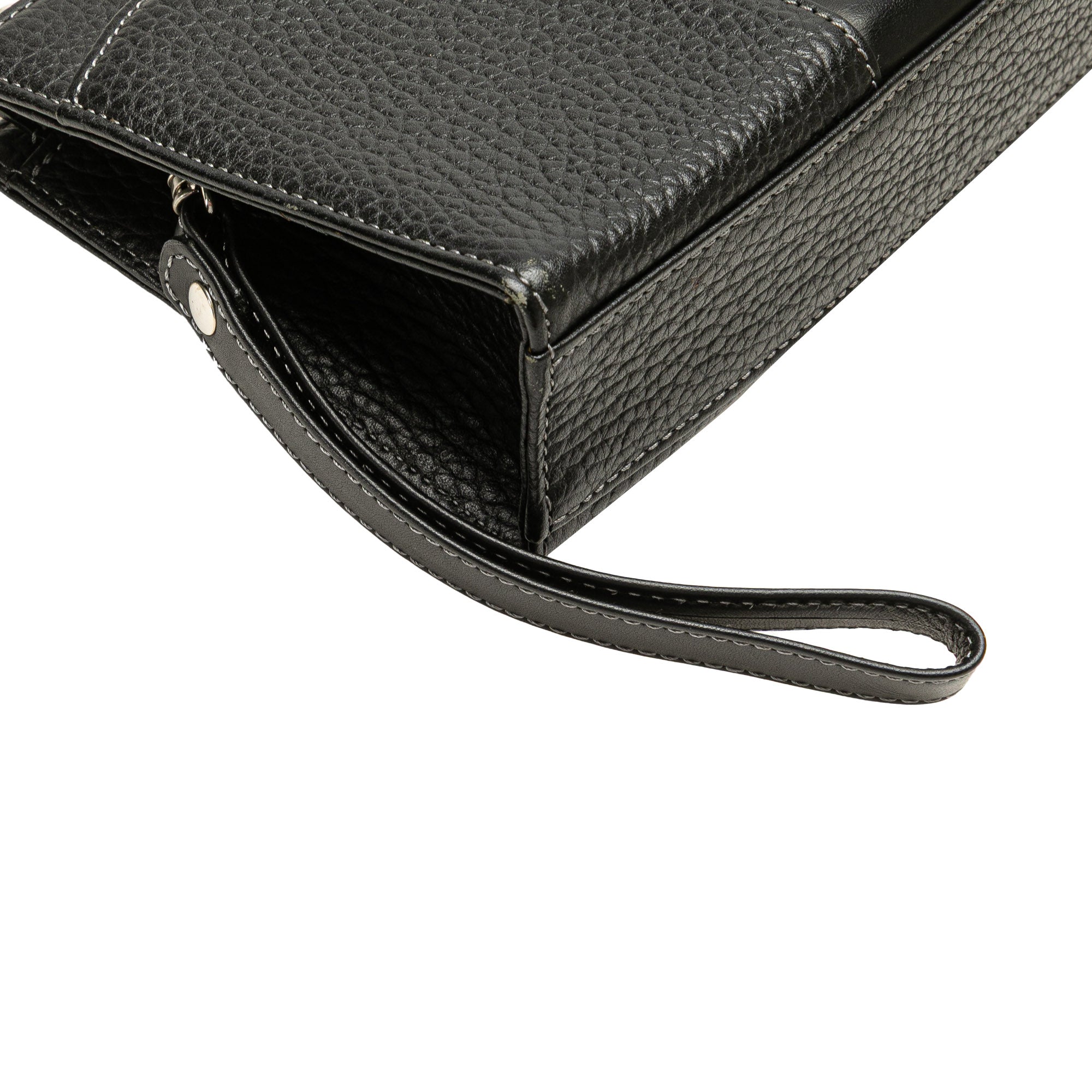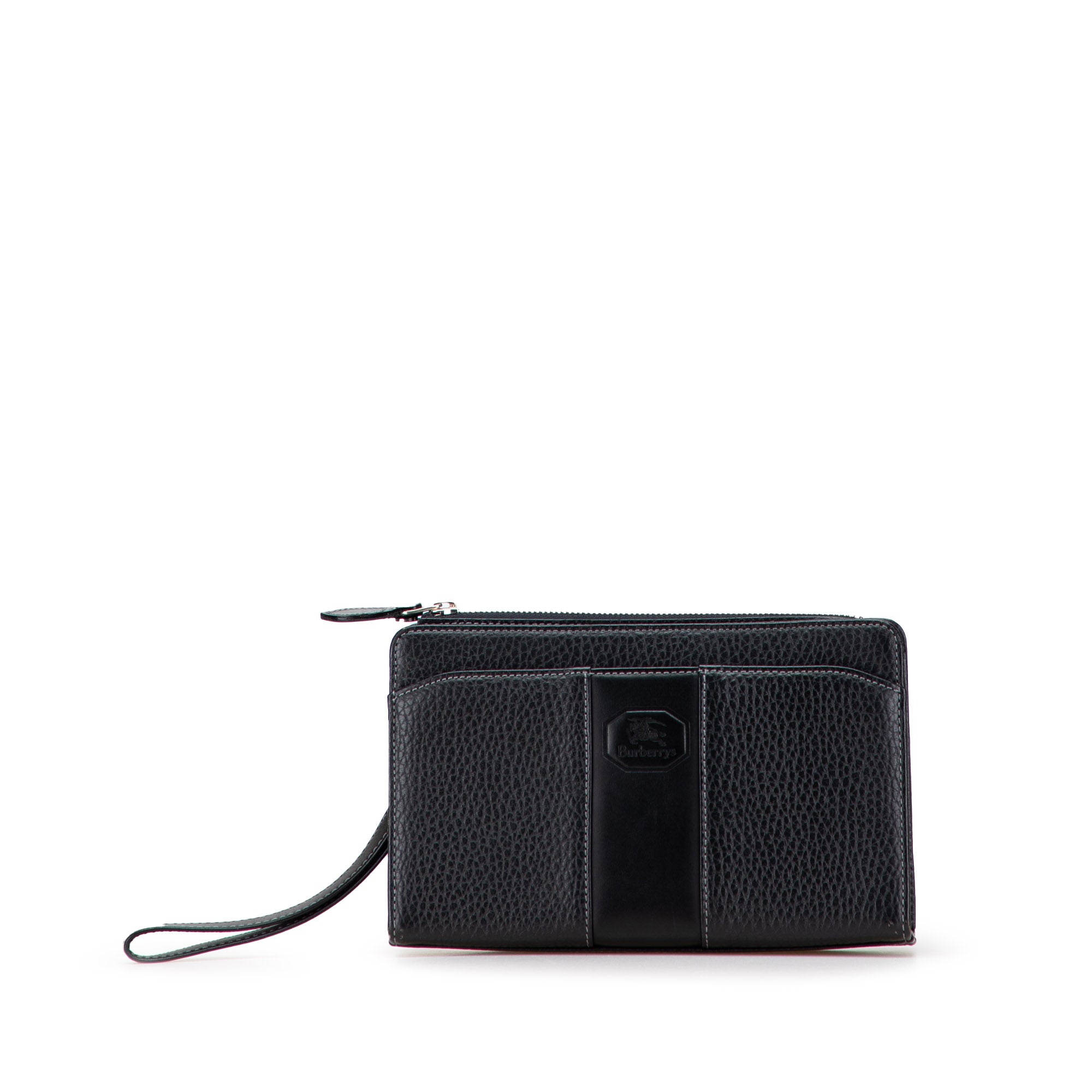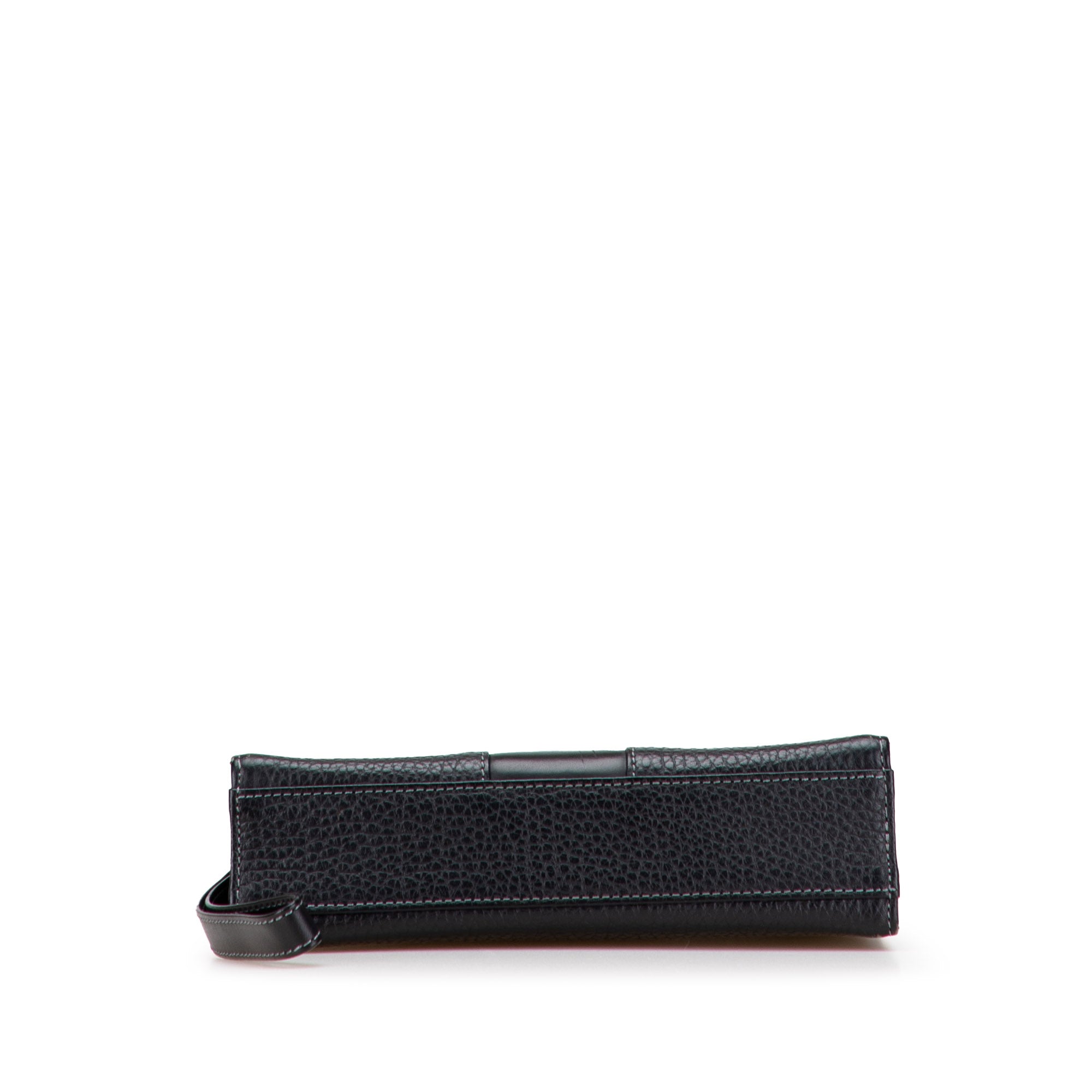 This clutch bag features a leather body, a flat leather wrist strap, a top zip closure, an exterior slip pocket, and an interior zip pocket. Retail Price: 250.00