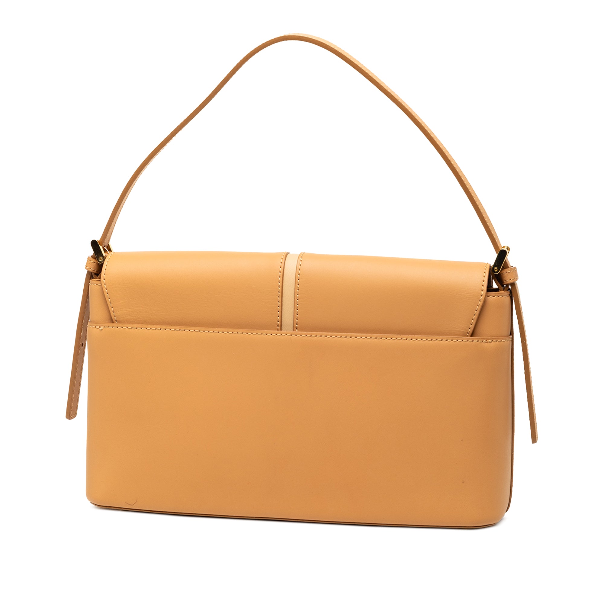 This shoulder bag features a leather body, a flat leather strap, a top flap with magnetic snap button closure, and interior zip and slip pockets. Retail Price: 500.00