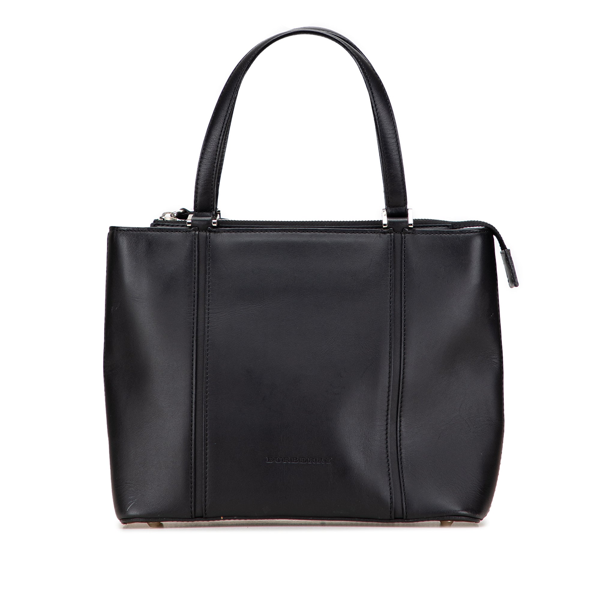 This handbag features a leather body, flat leather handles, a top zip closure, and interior zip and slip pockets. Retail Price: 450.00