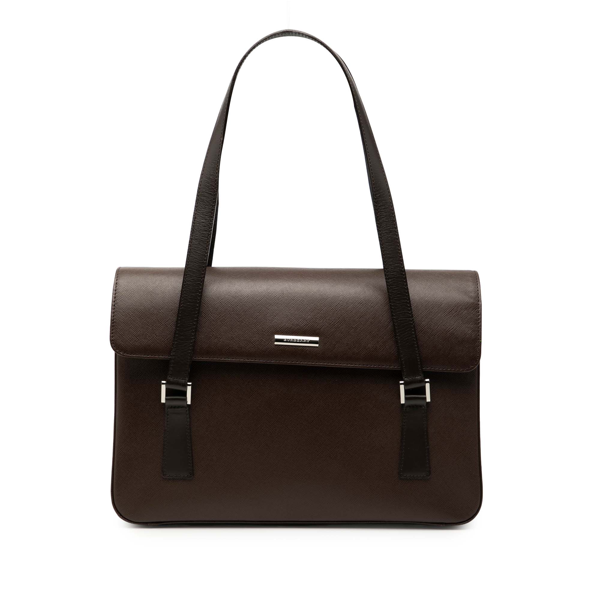 This shoulder bag features a leather body, flat shoulder straps, and a flap with magnetic snap closure. Retail Price: 700.00