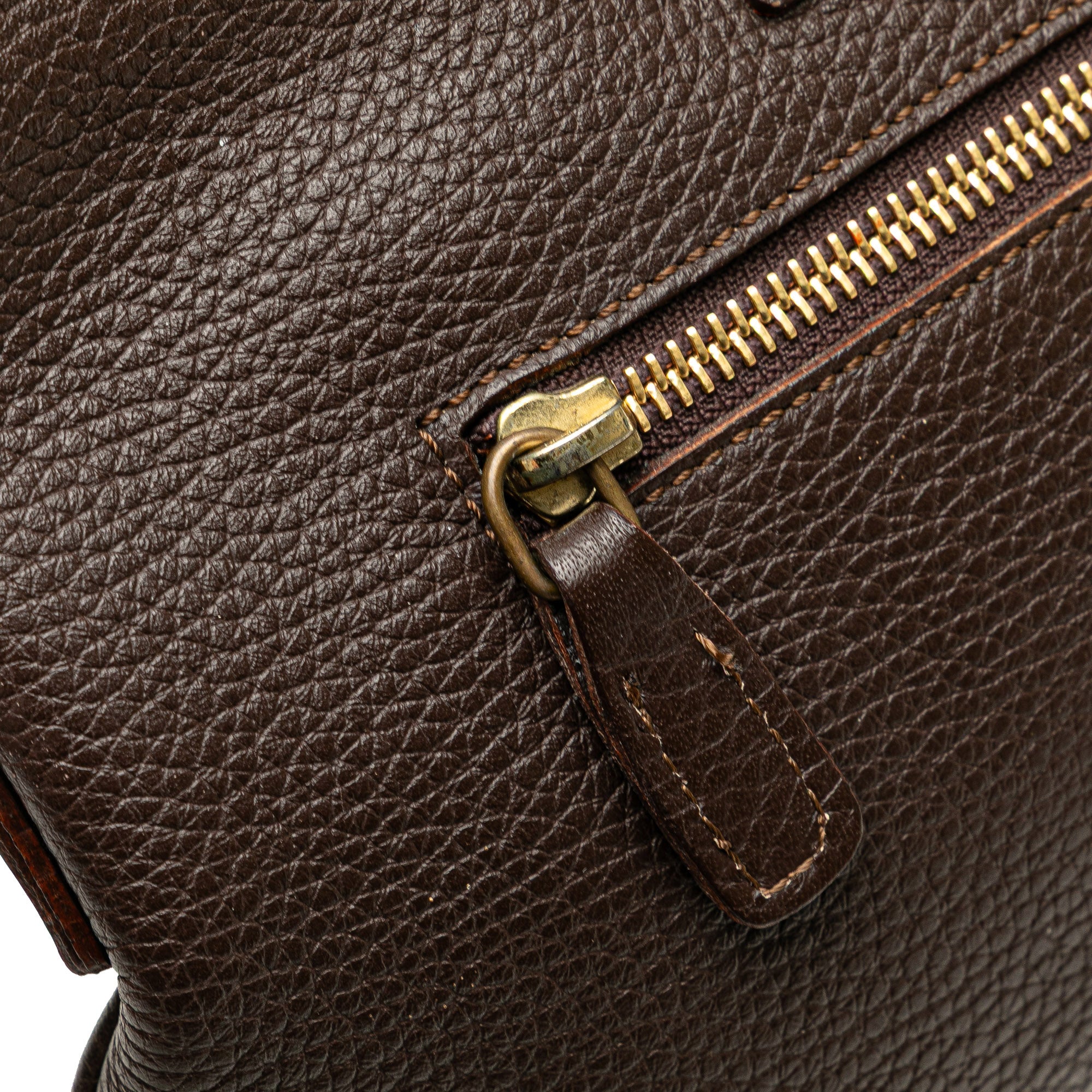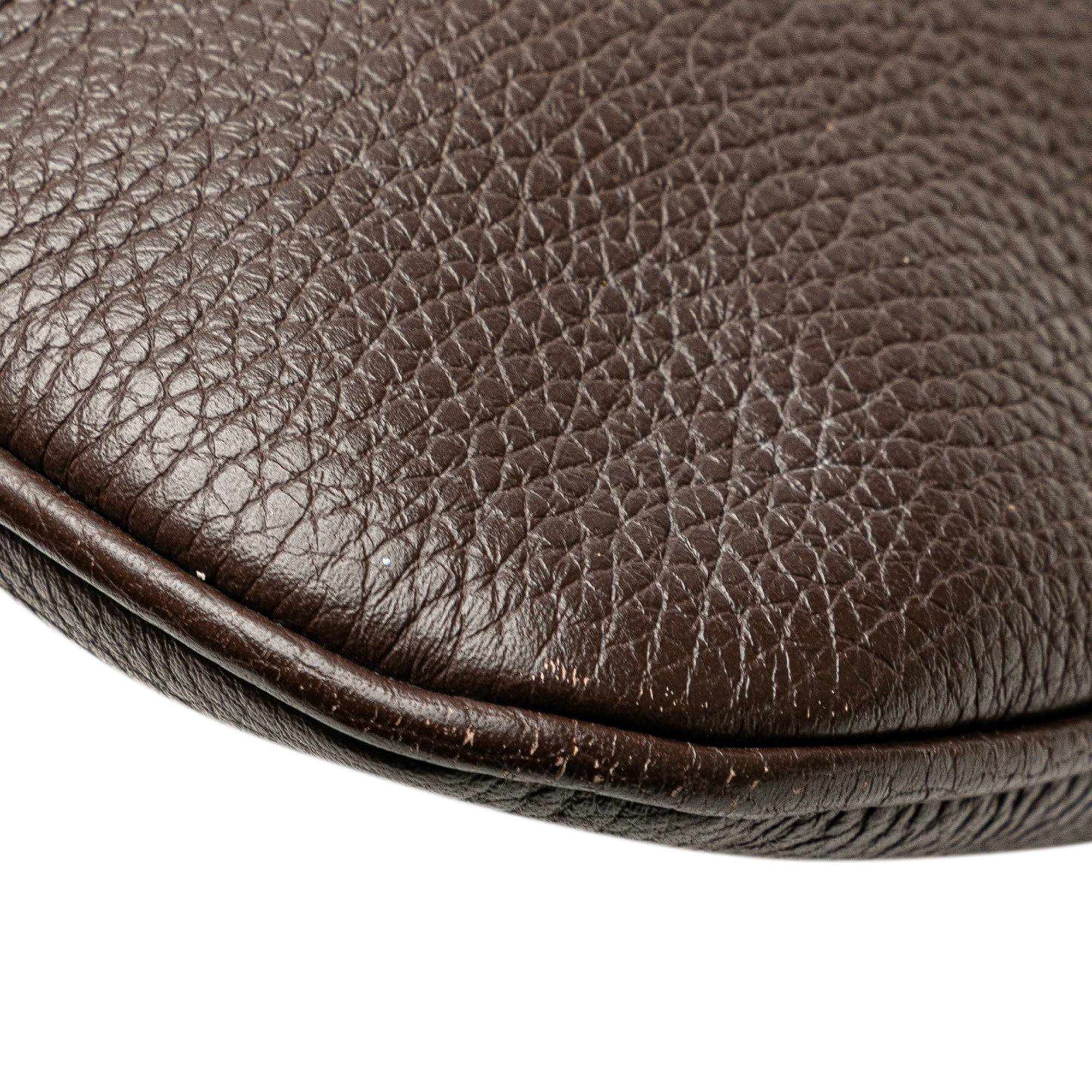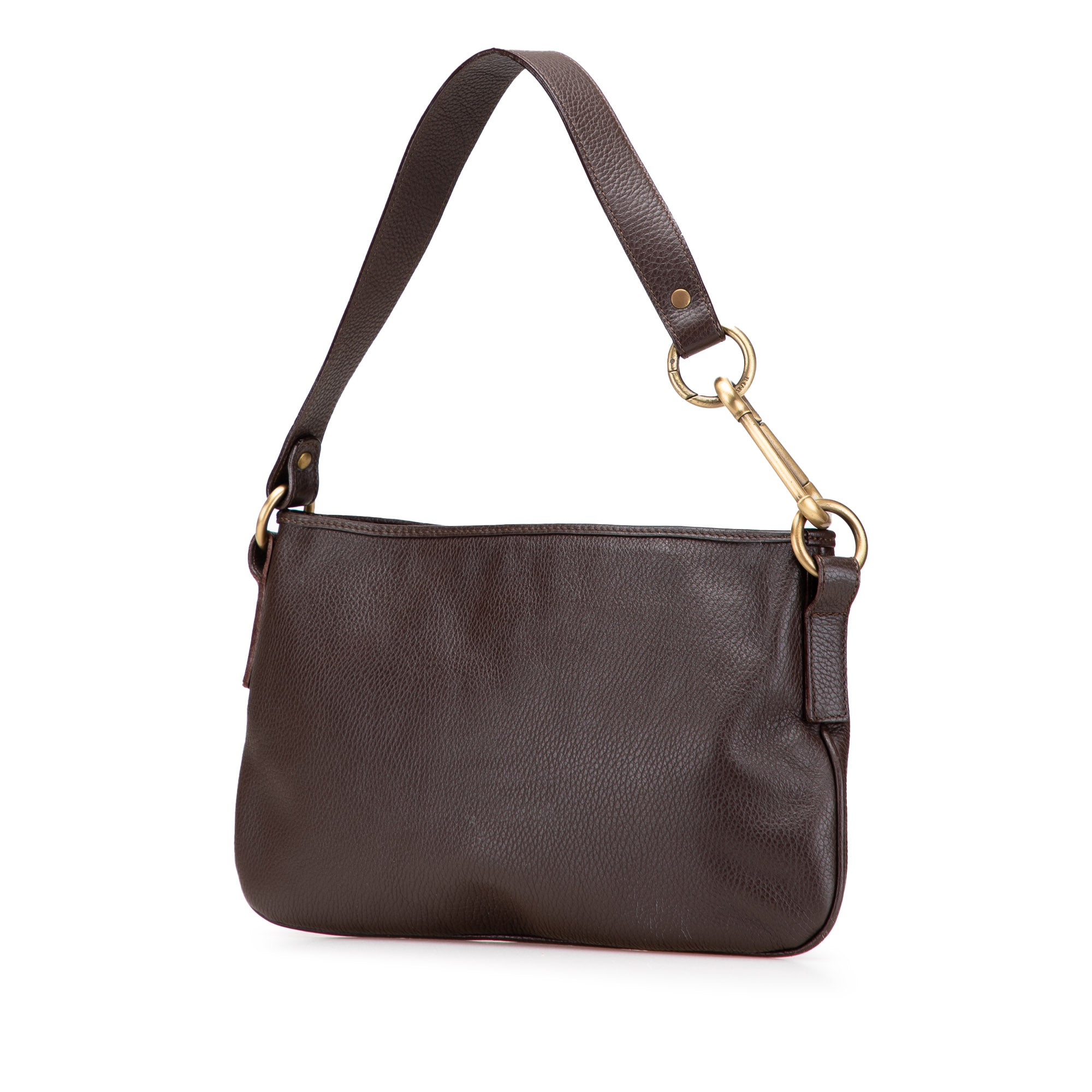 This shoulder bag features a leather body, a flat leather strap, a top zip closure, an exterior zip pocket, and interior zip and slip pockets. Retail Price: 615.00