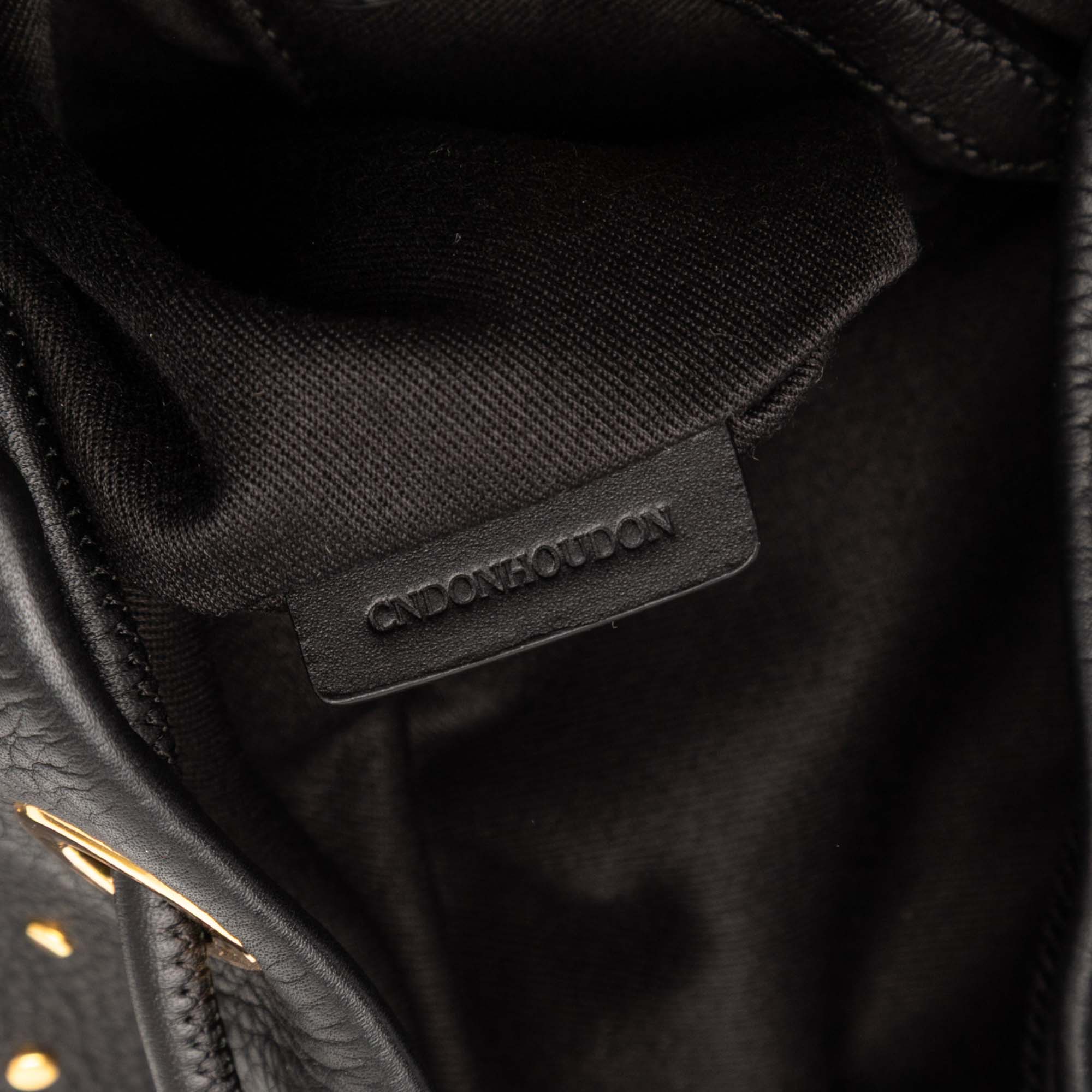This backpack features a studded leather body, a rolled leather top handle, adjustable flat back straps, a front flap with magnetic snap buttons and a drawstring closure, a front exterior zip pocket, side exterior zip pockets, and an interior zip pocket. Retail Price: 1595.00