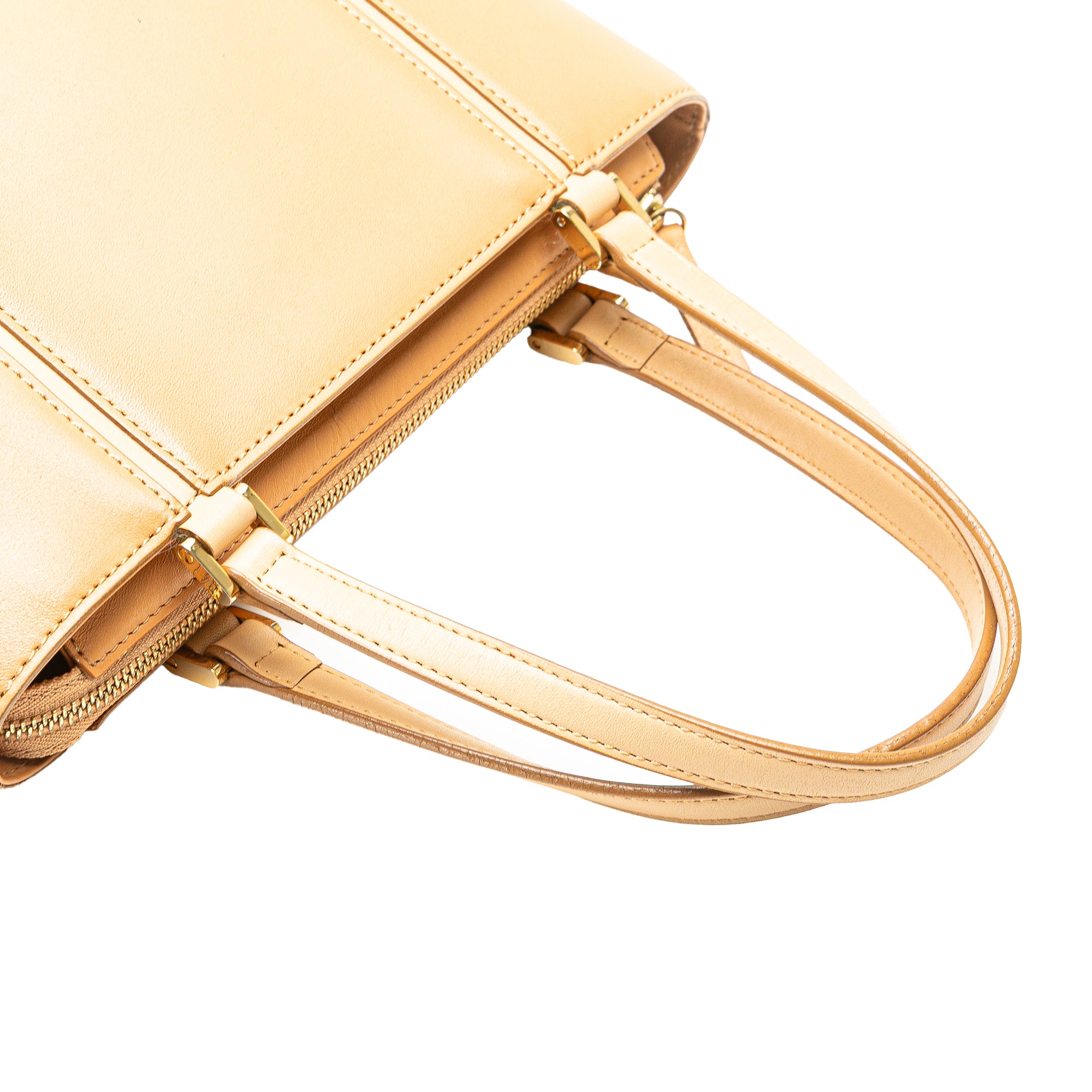This tote bag features a leather body, flat leather handles, a top zip closure, and interior zip and slip pockets. Retail Price: 450.00
