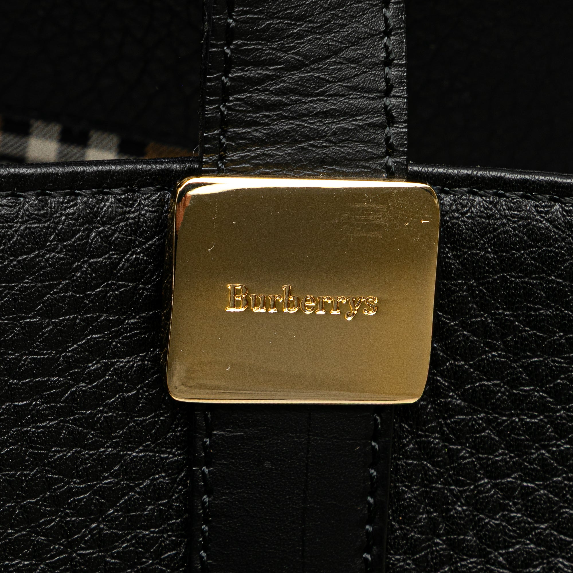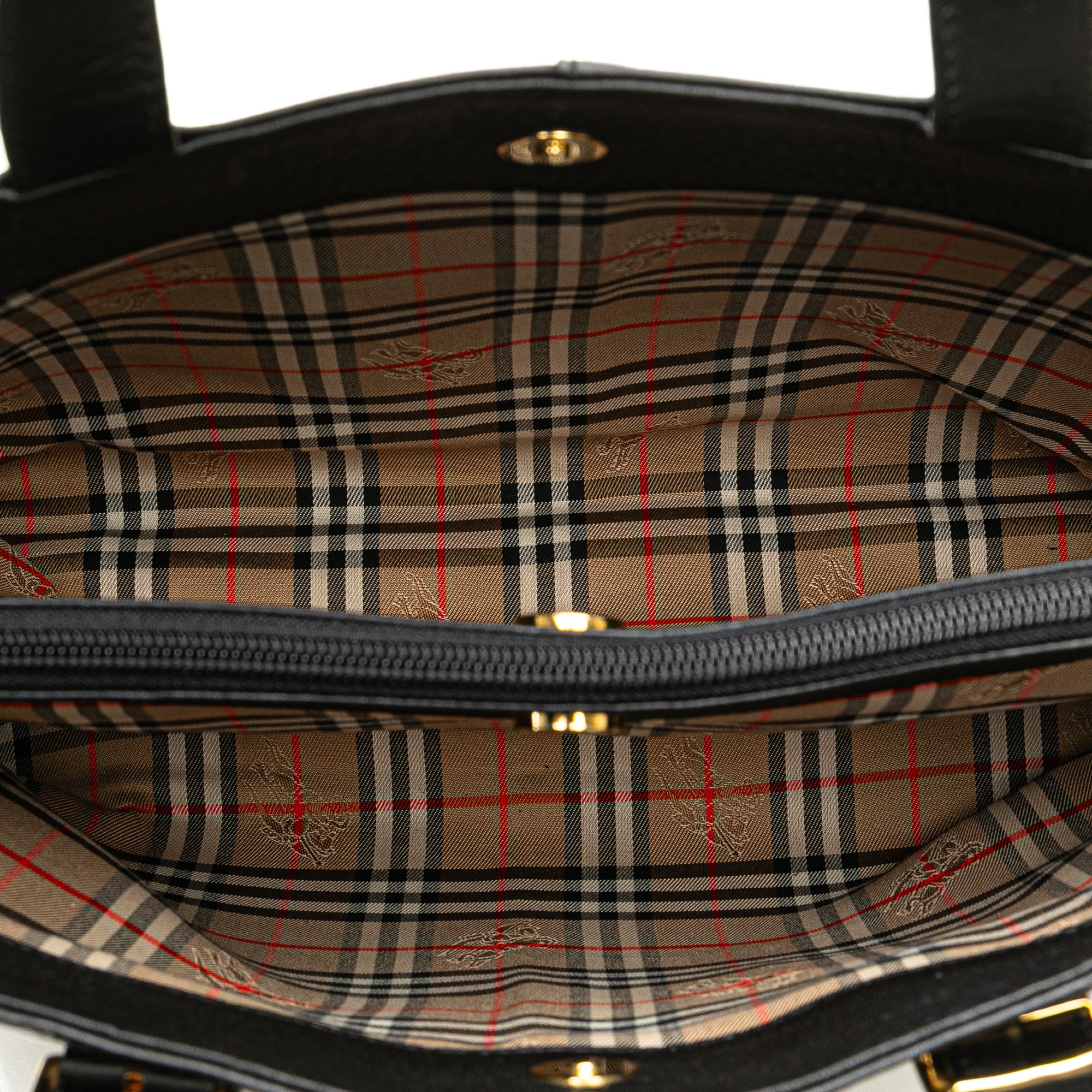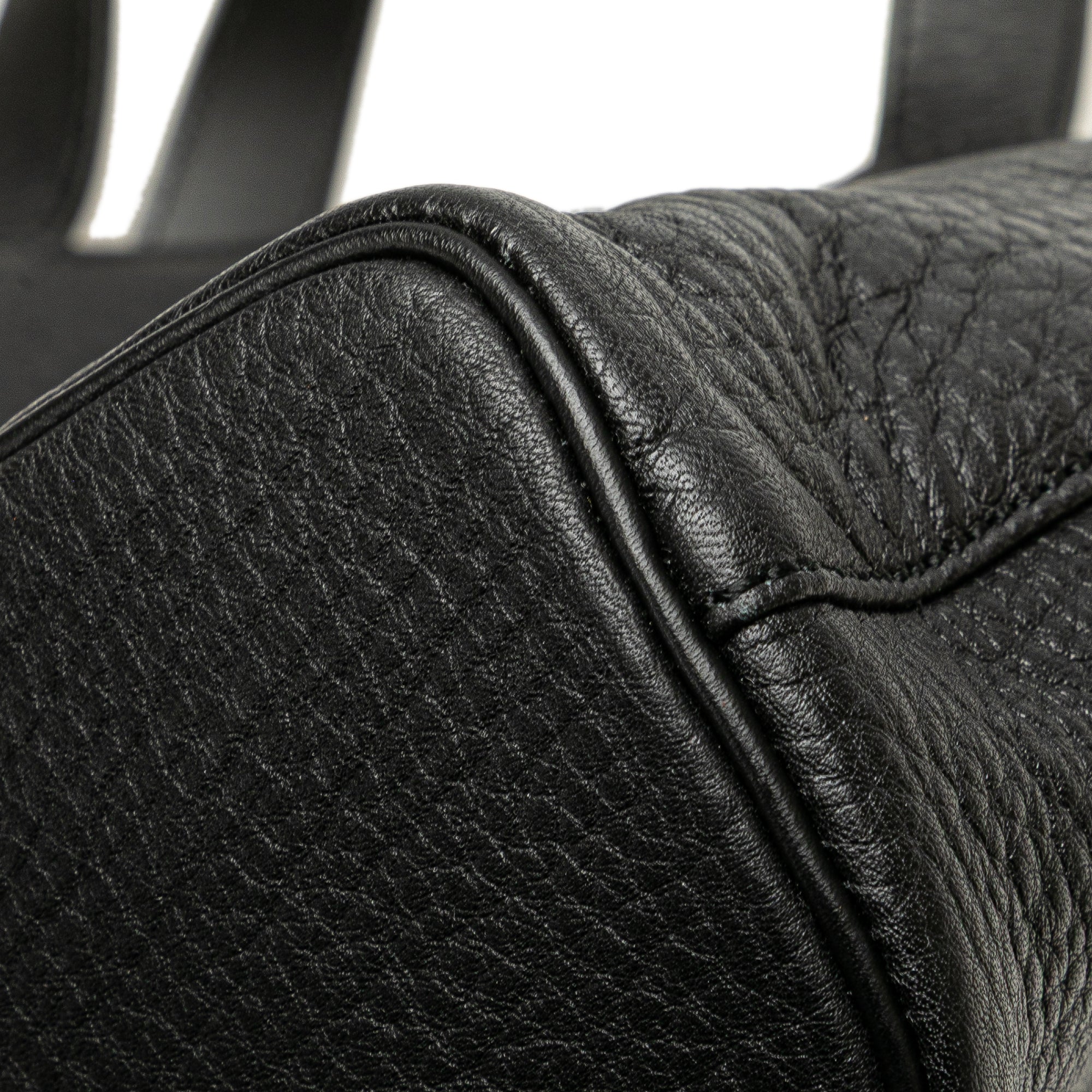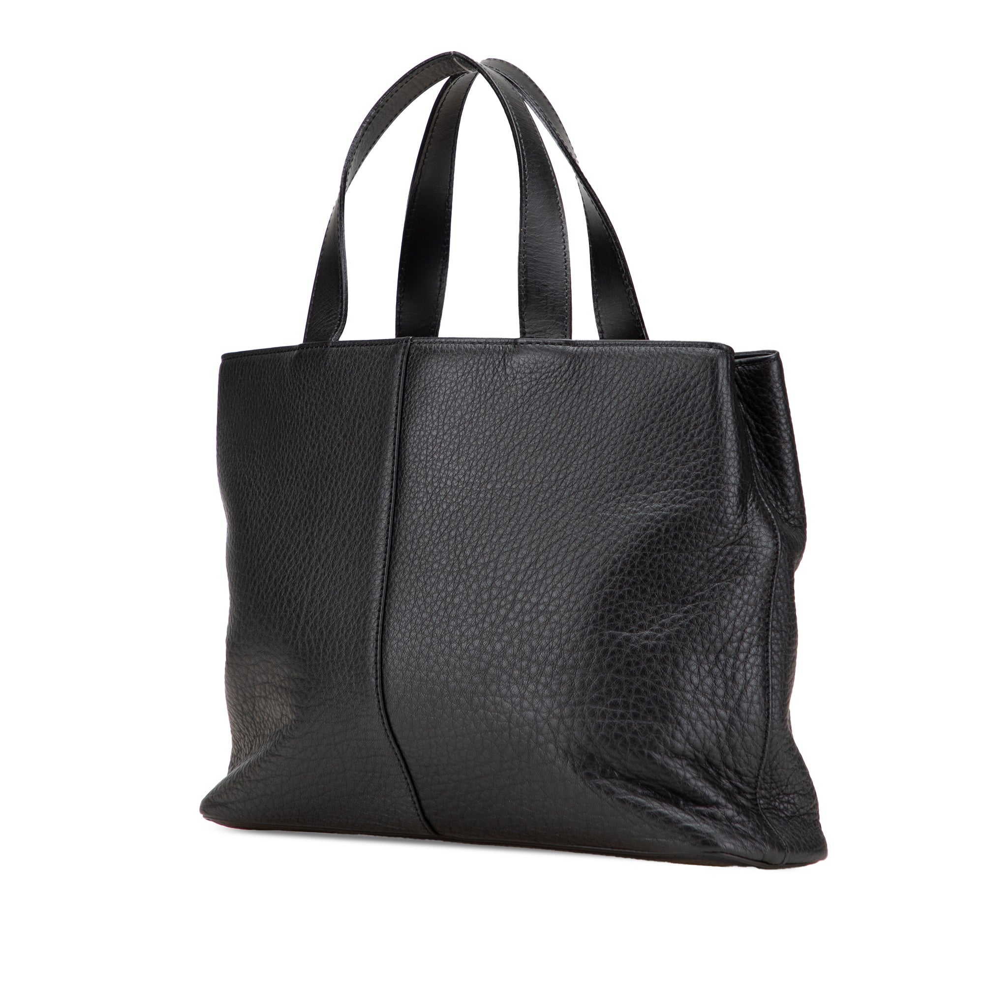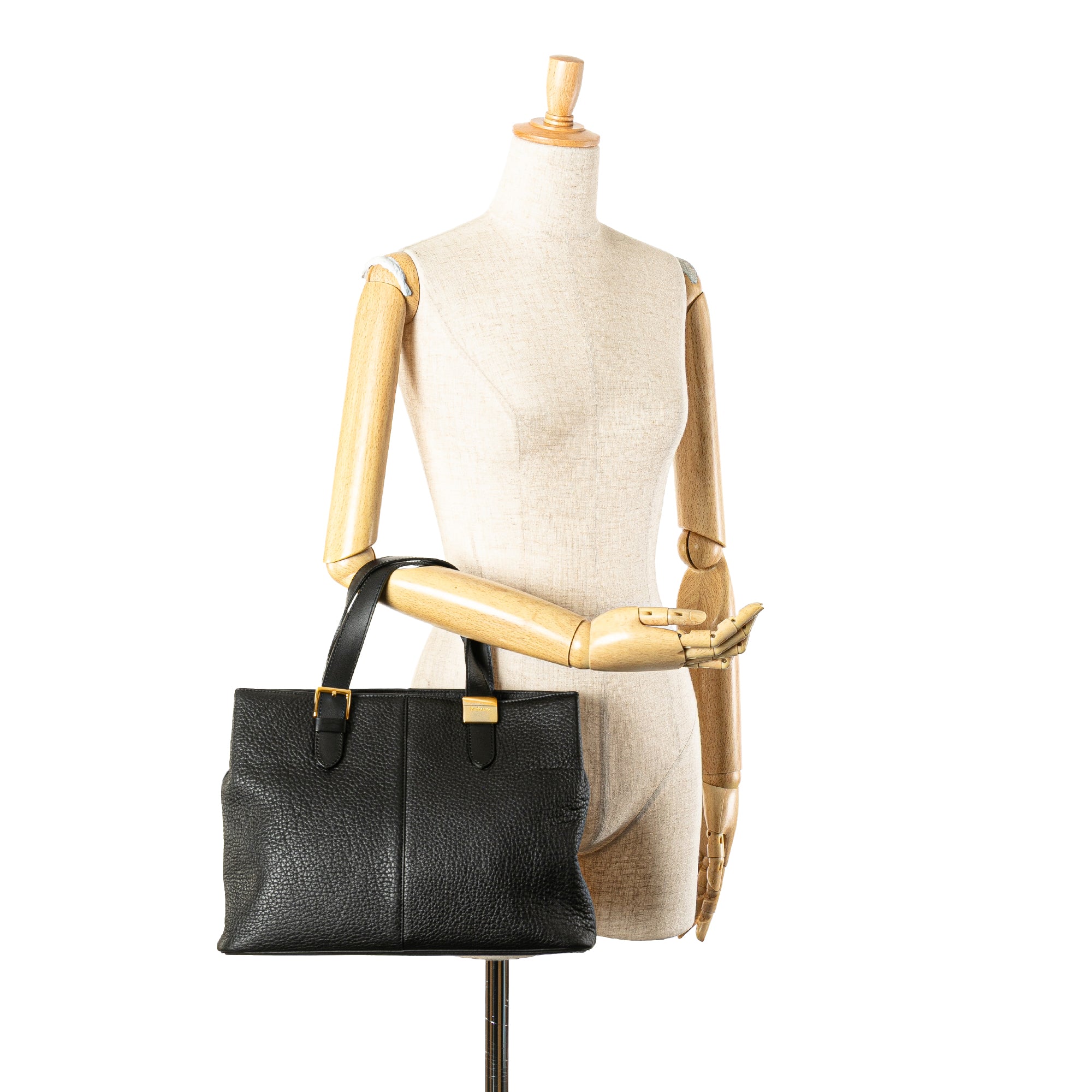 This tote bag features a leather body, flat leather handles, open top compartments with magnetic snap closures, a top zip compartment, and interior zip and slip pockets. Retail Price: 523.00