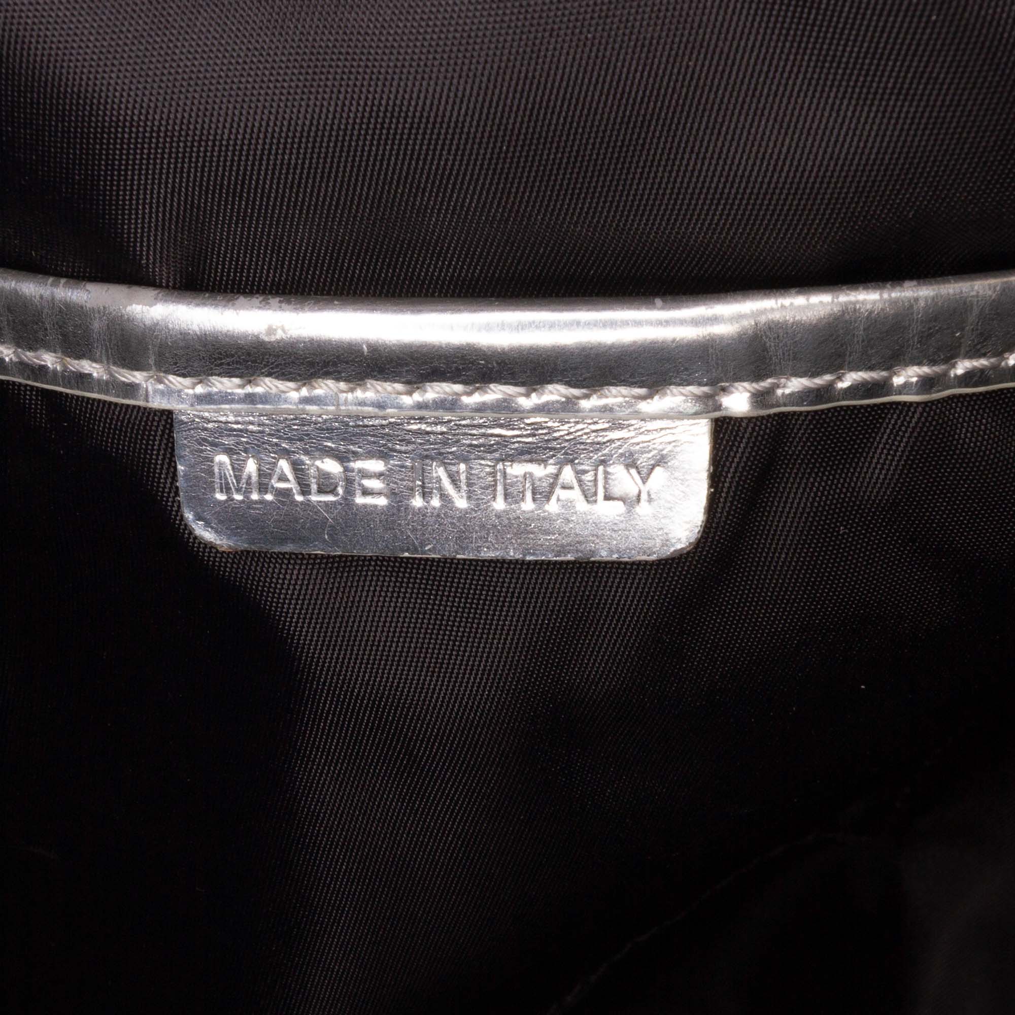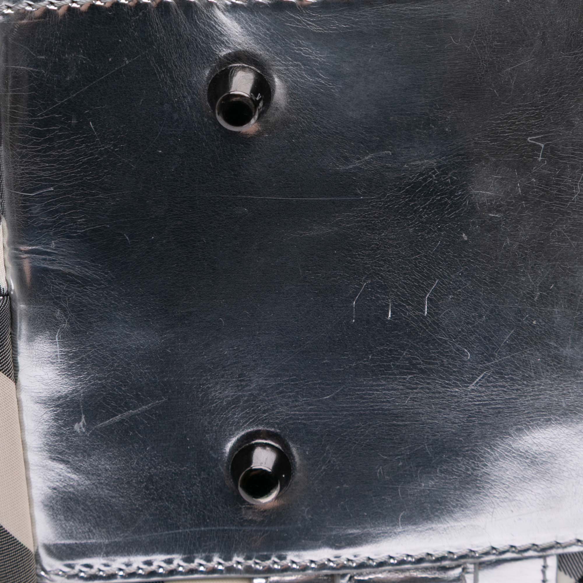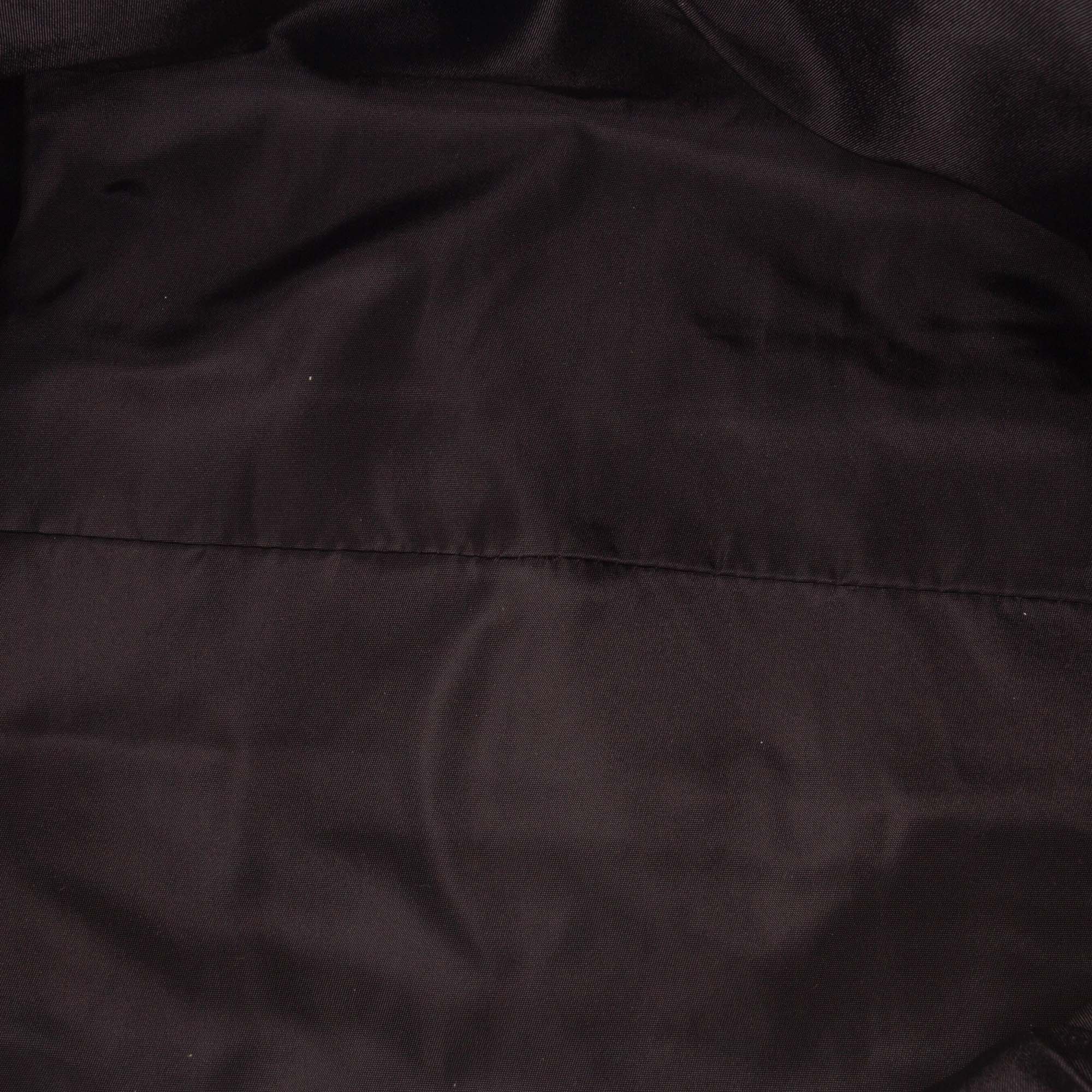 This tote features a nylon body with patent leather trim, flat patent leather straps, an open top with magnetic snap closure, and interior zip and slip pockets. Retail Price: 1000.00