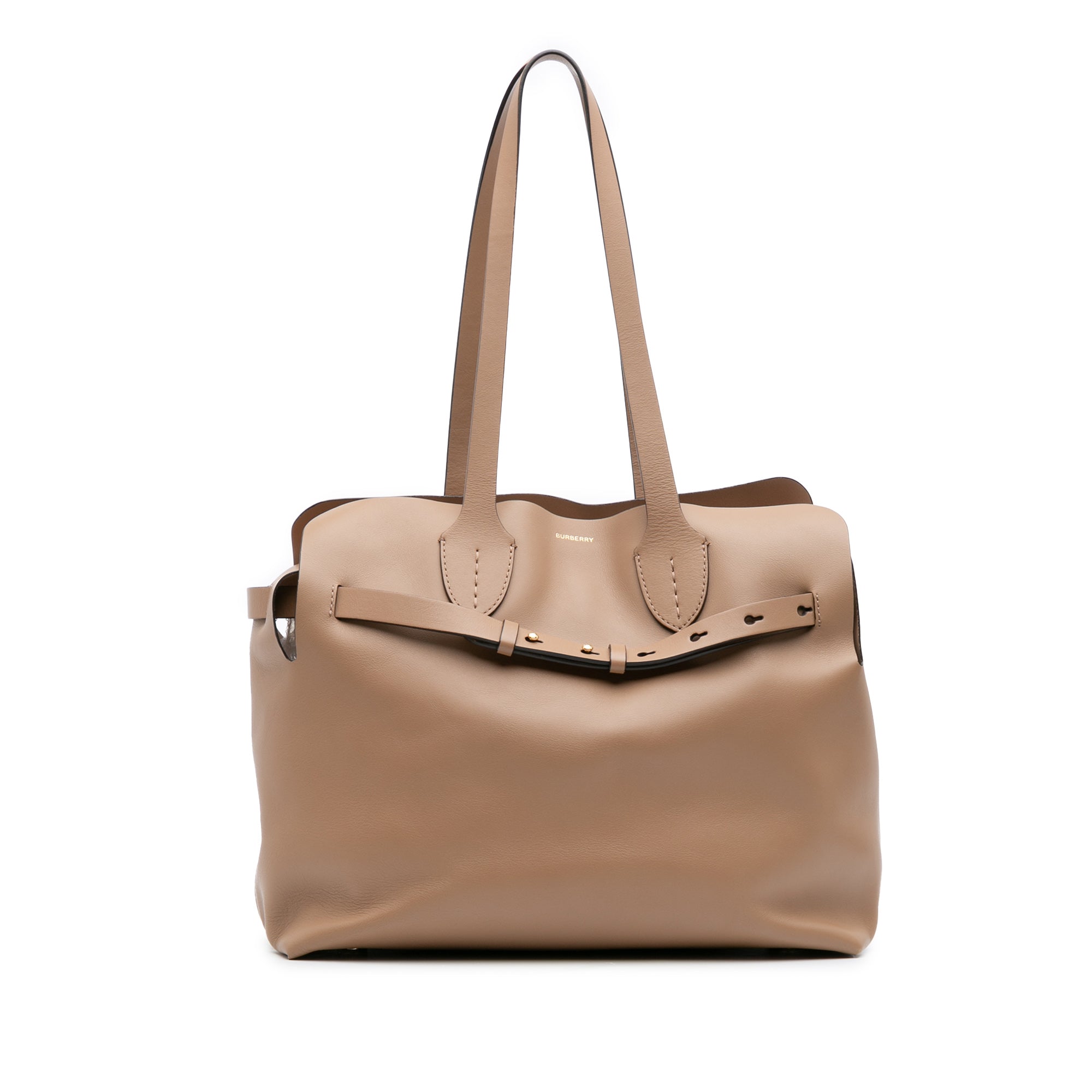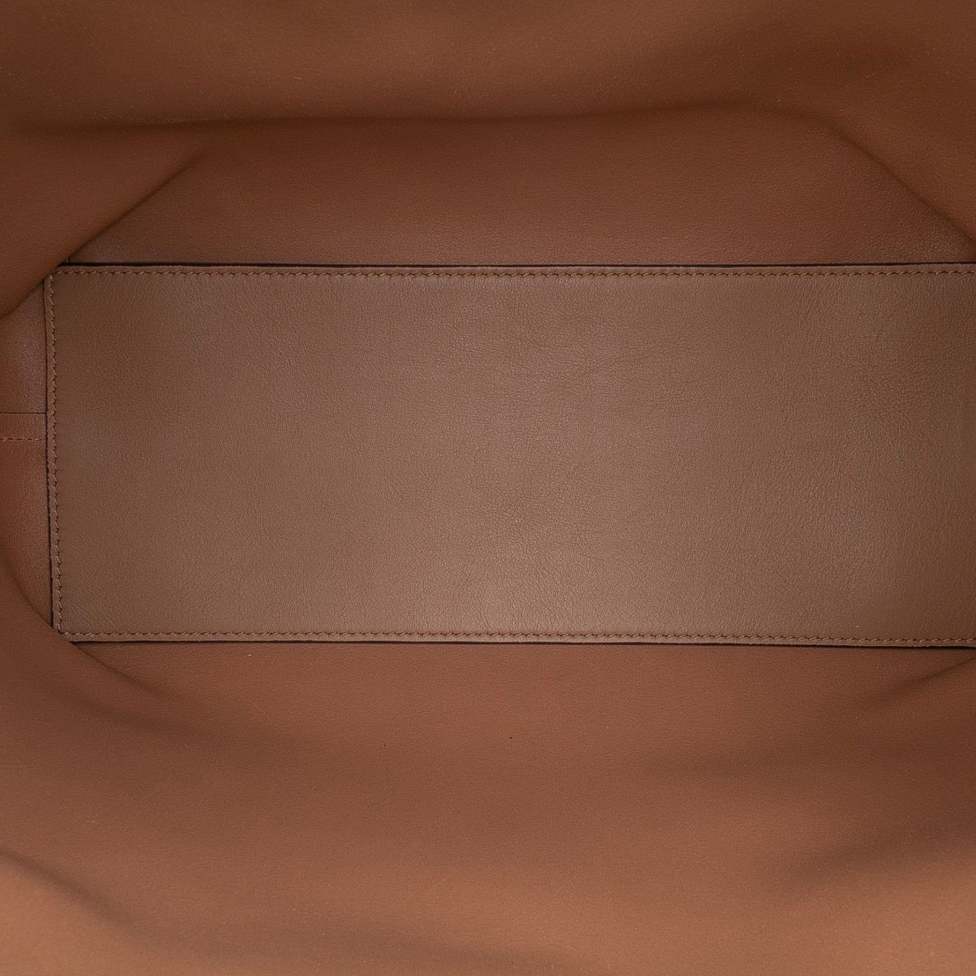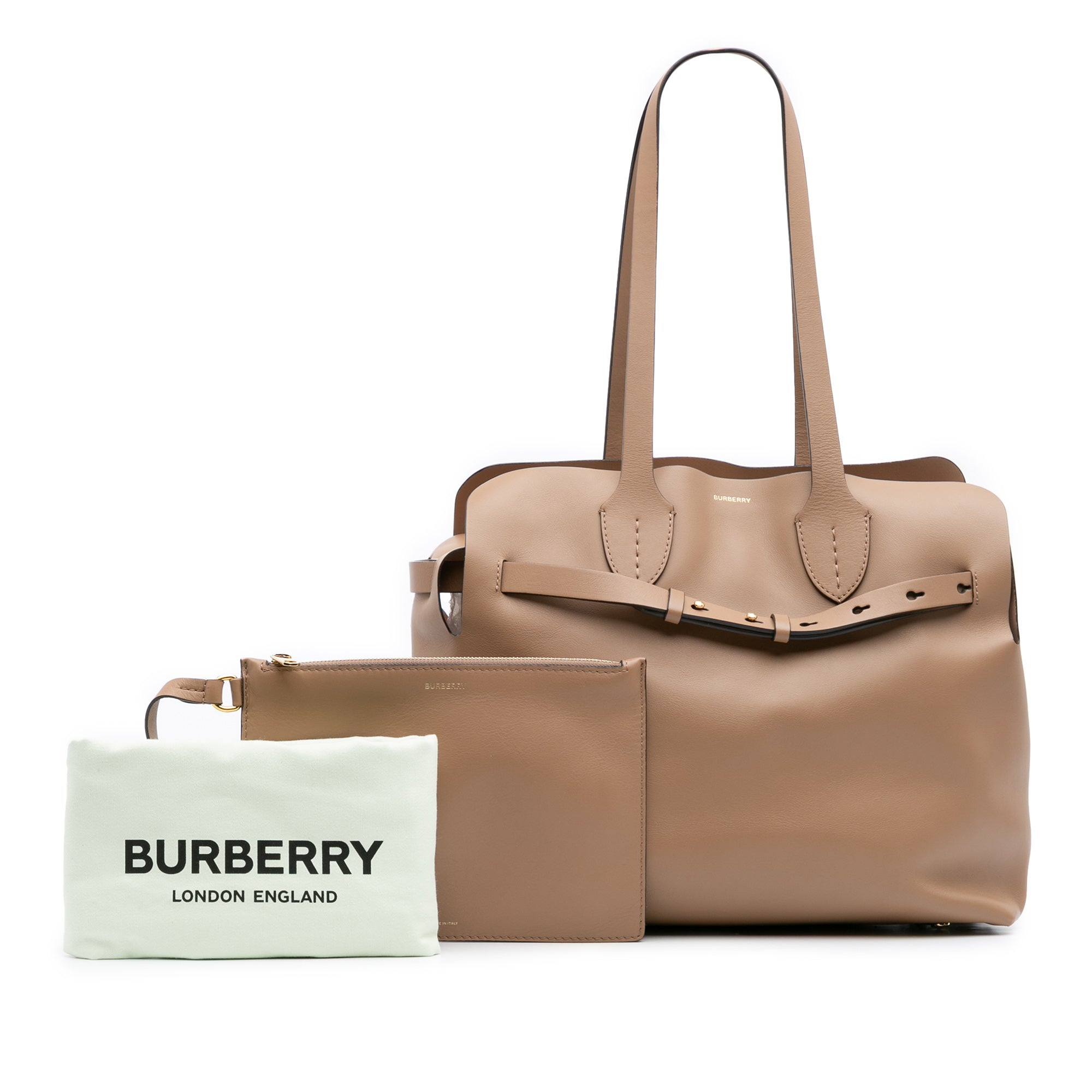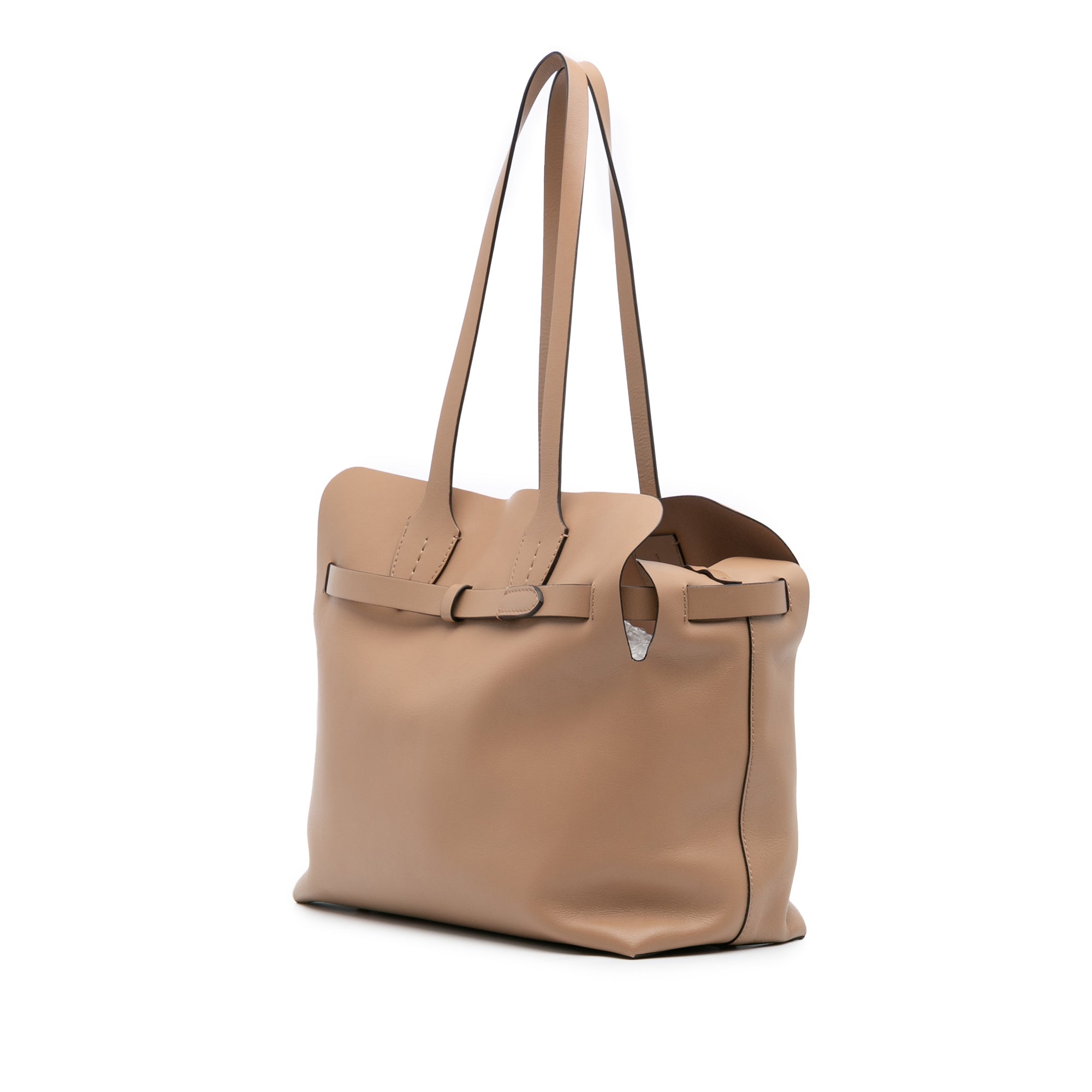 This tote bag features a leather body, flat leather straps, an open top with belt around closure, and an interior zip pocket. Inclusion: Dust bag. Retail Price: 800.00