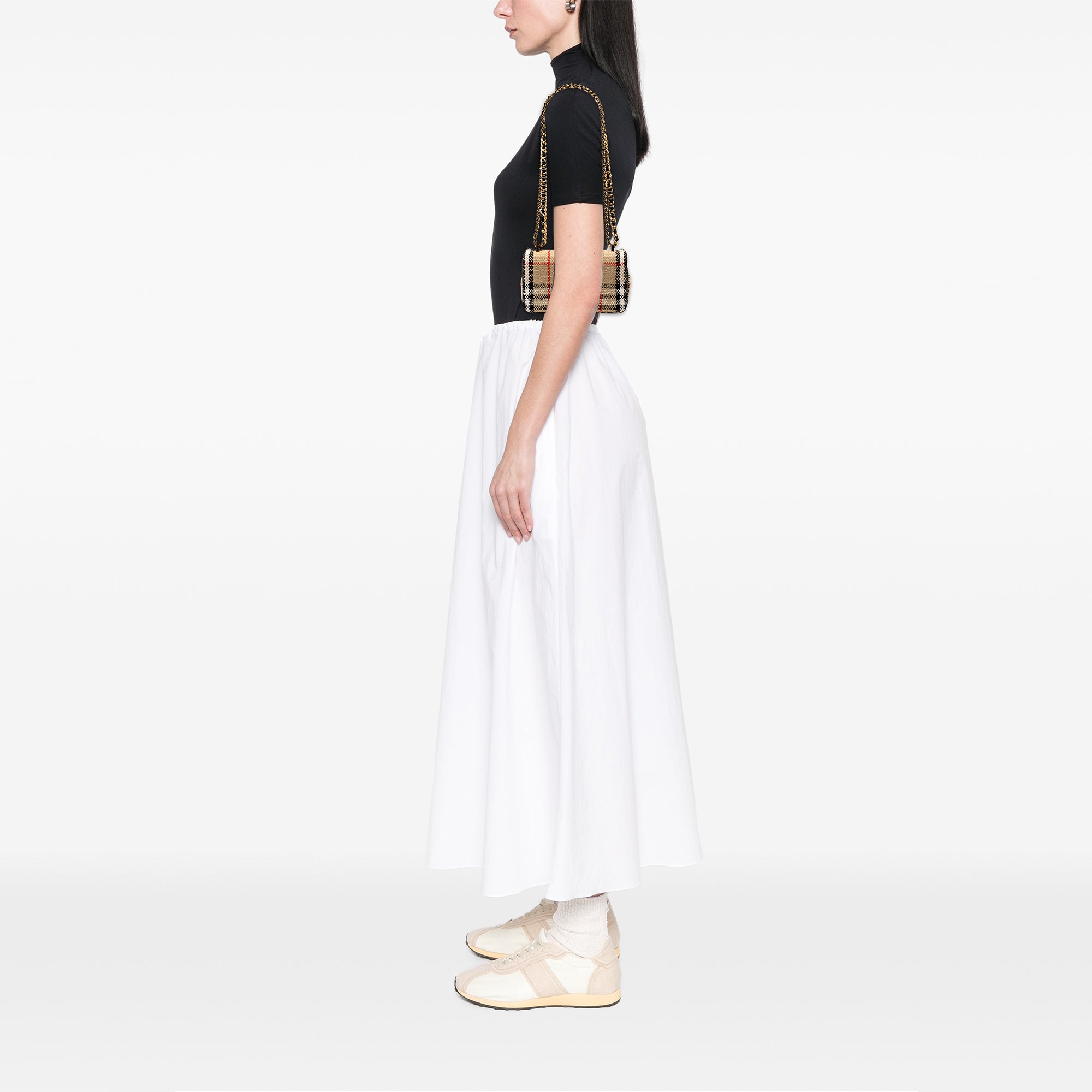 The Lola features a plaid cotton body with leather trim, a leather woven chain link strap, a front flap with a magnetic snap button closure, and an interior slip pocket. Inclusion: Dust bag, box. Retail Price: 1750.00