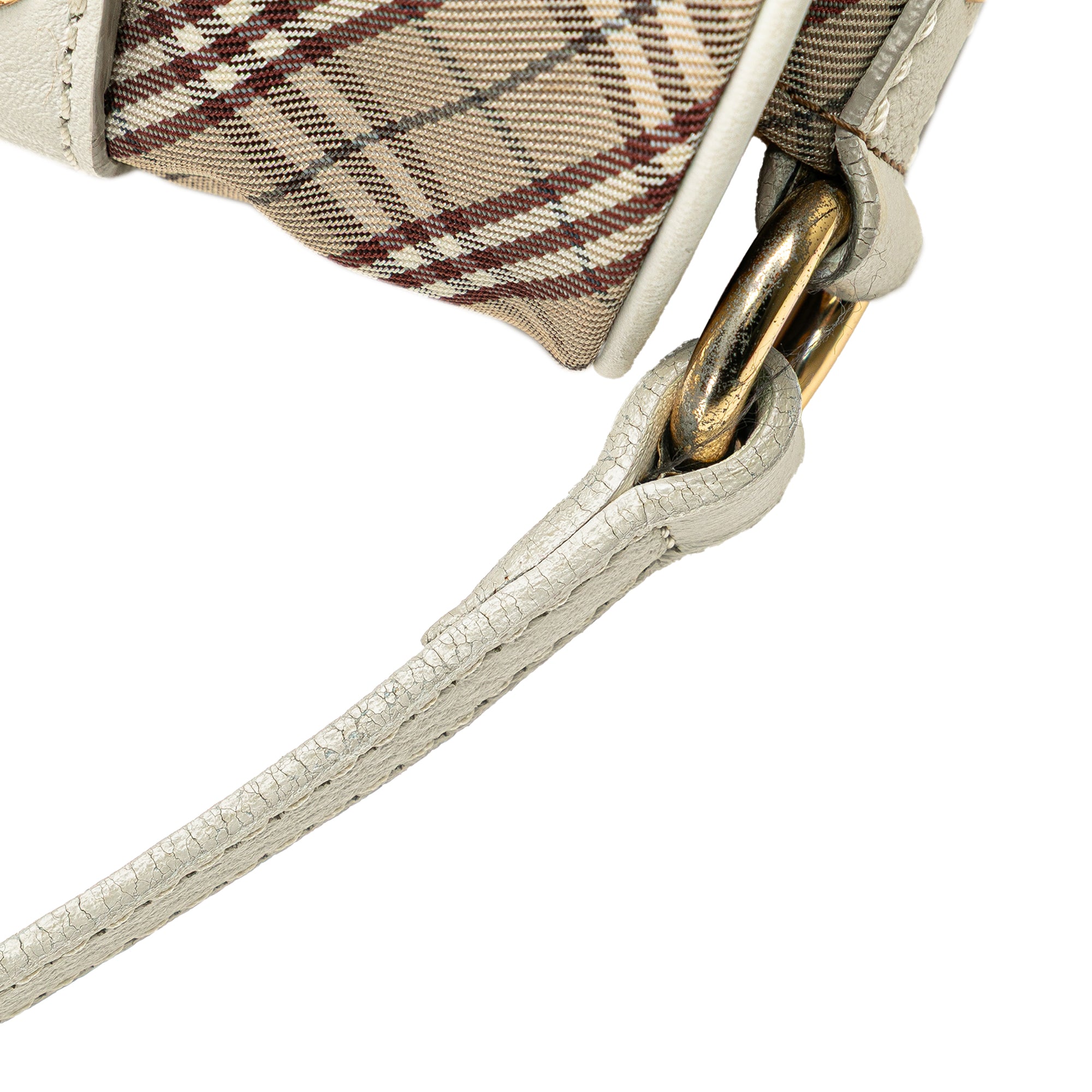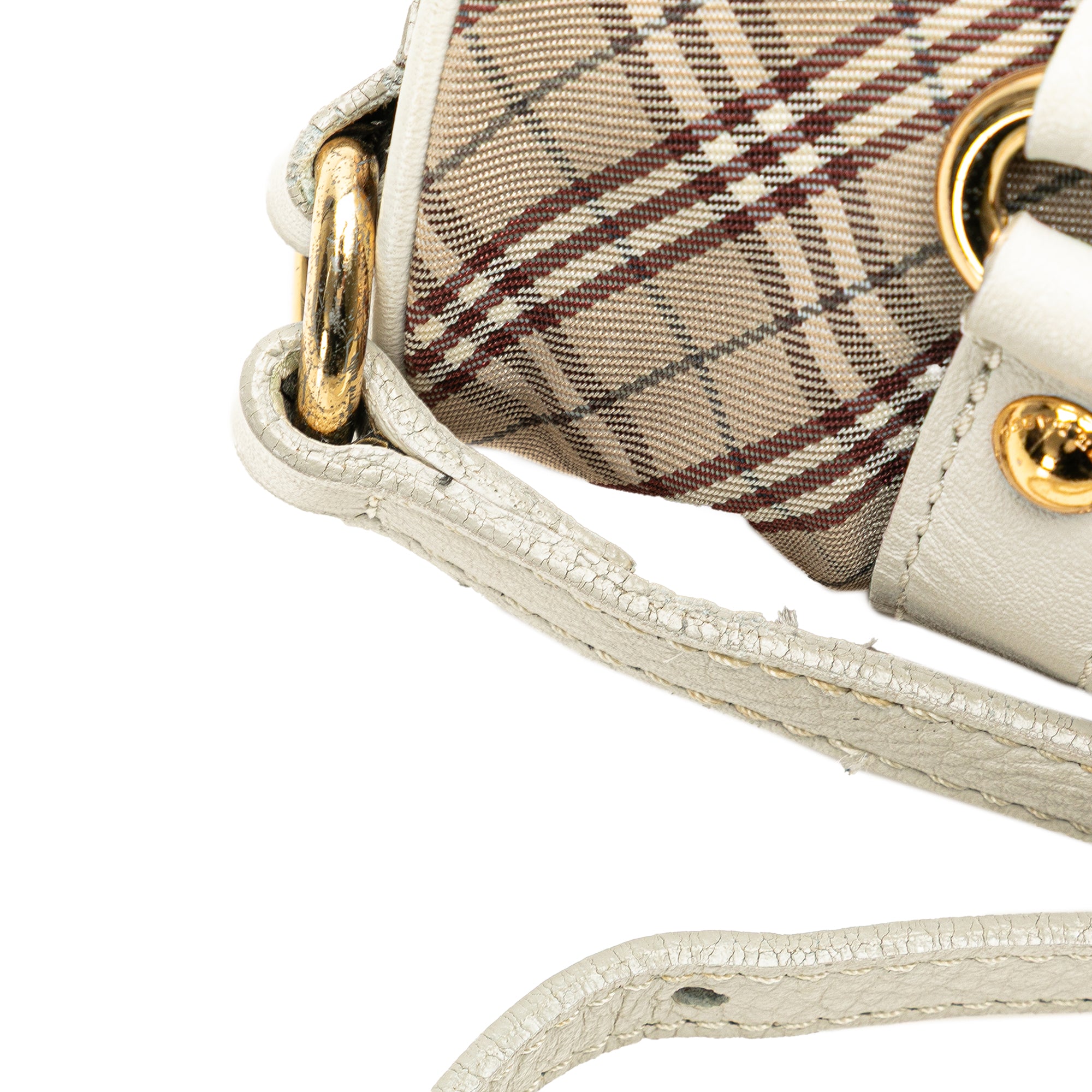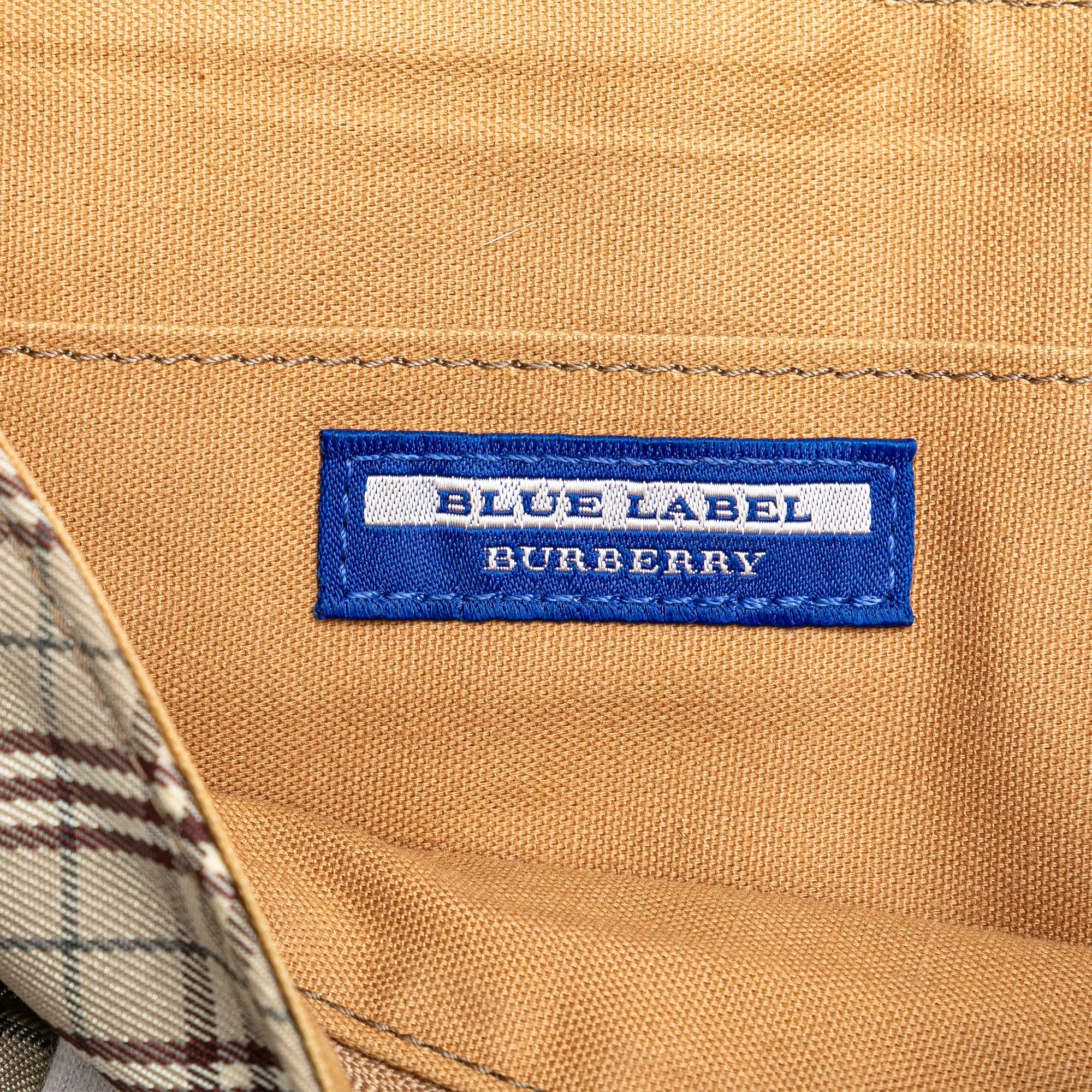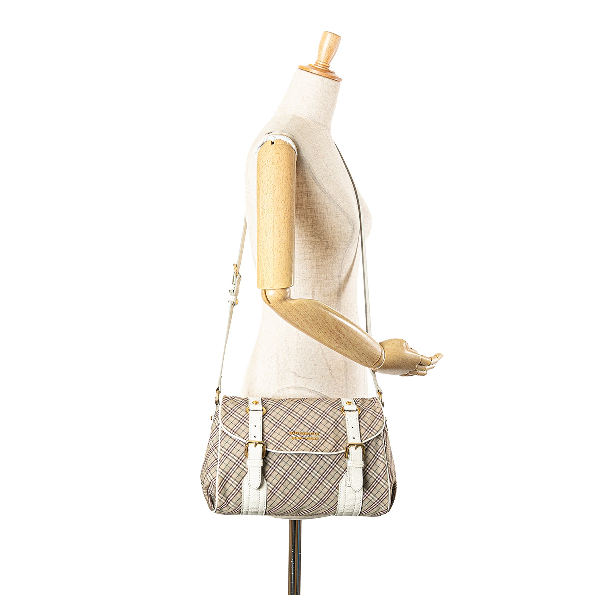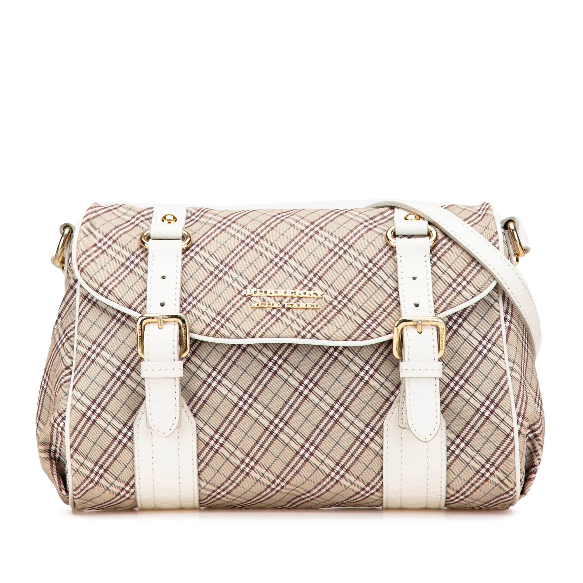 This crossbody bag features a canvas body with leather trim, an adjustable flat leather strap, a front flap with buckle closures, and interior zip and slip pockets. Retail Price: 530.00