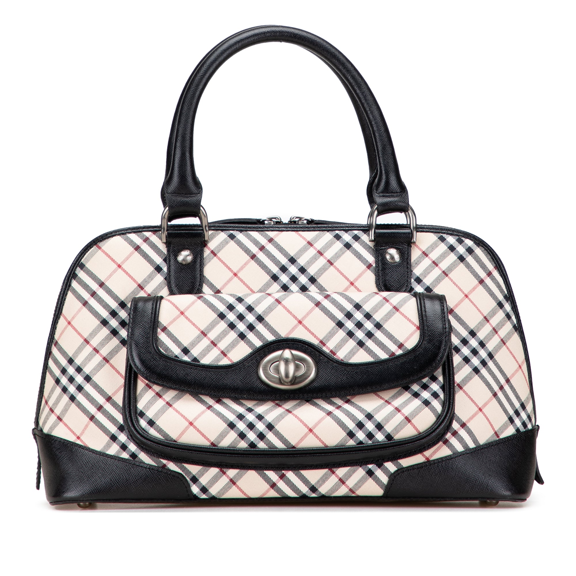 This handbag features a nova check canvas body with leather trim, rolled leather handles, a top zip closure, an exterior front flap pocket with turn lock closure, and interior zip and slip pockets. Retail Price: 1000.00