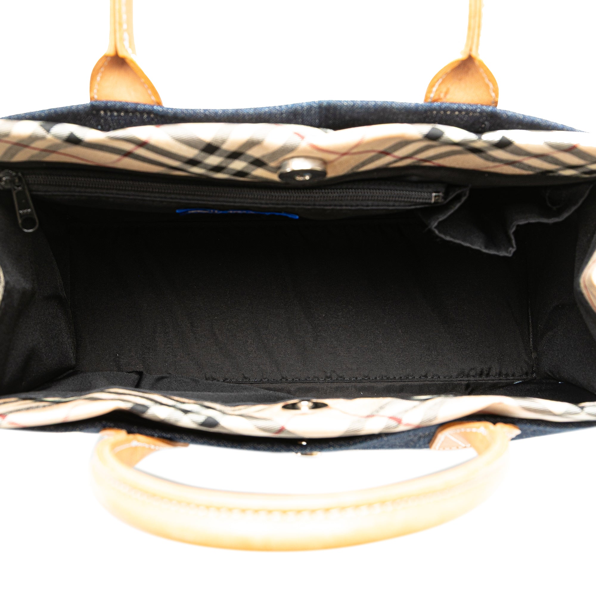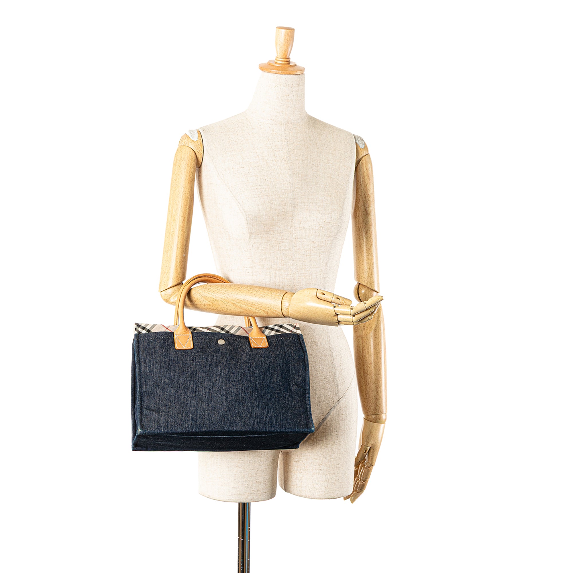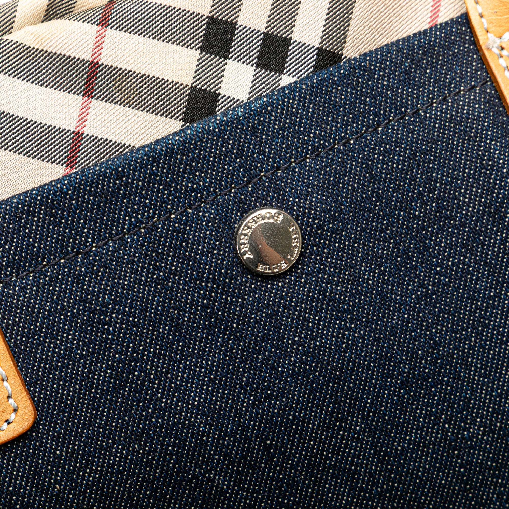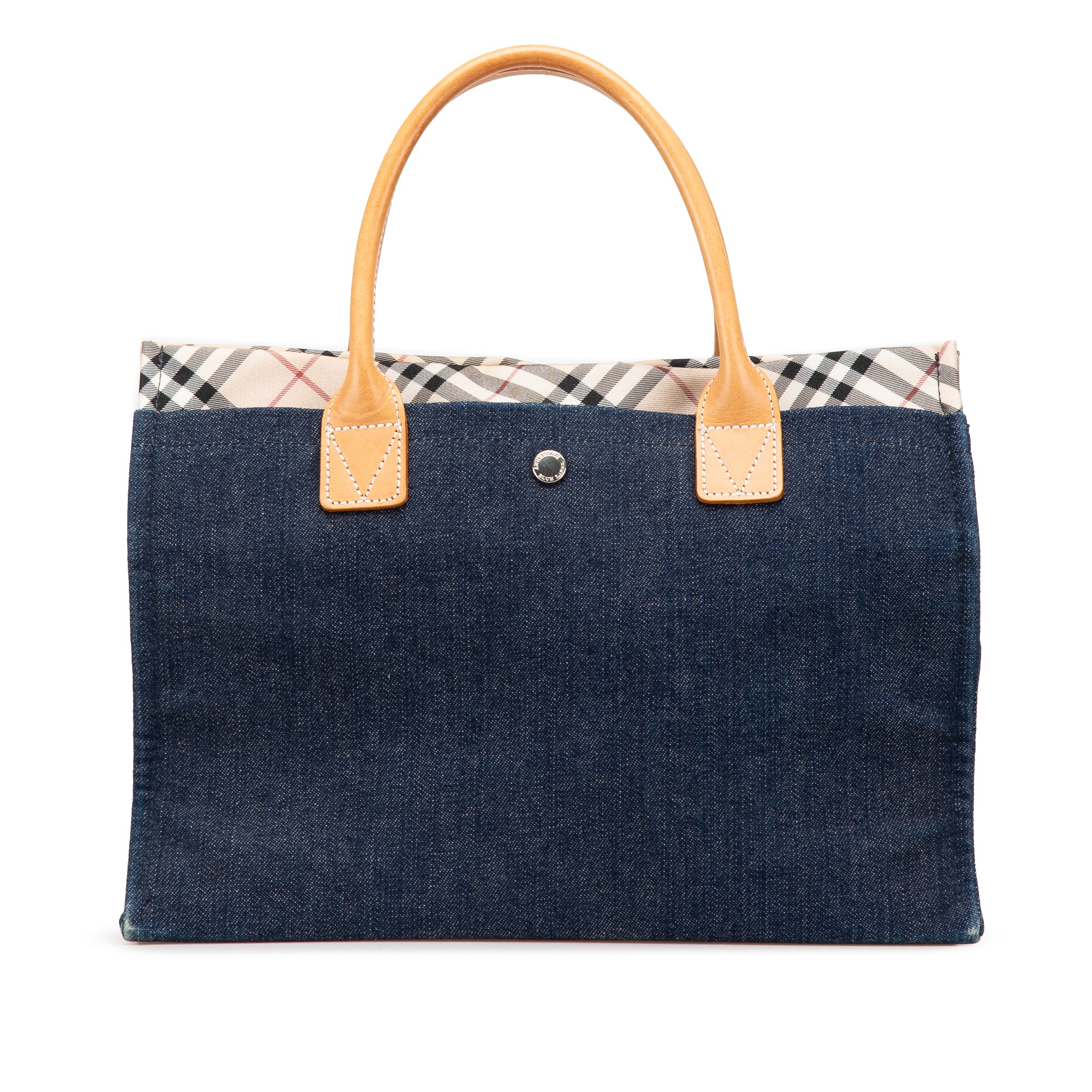 This tote bag features a denim body with nova check canvas trim, rolled leather handles, an open top with snap button closure, and interior zip and slip pockets. Retail Price: 695.00