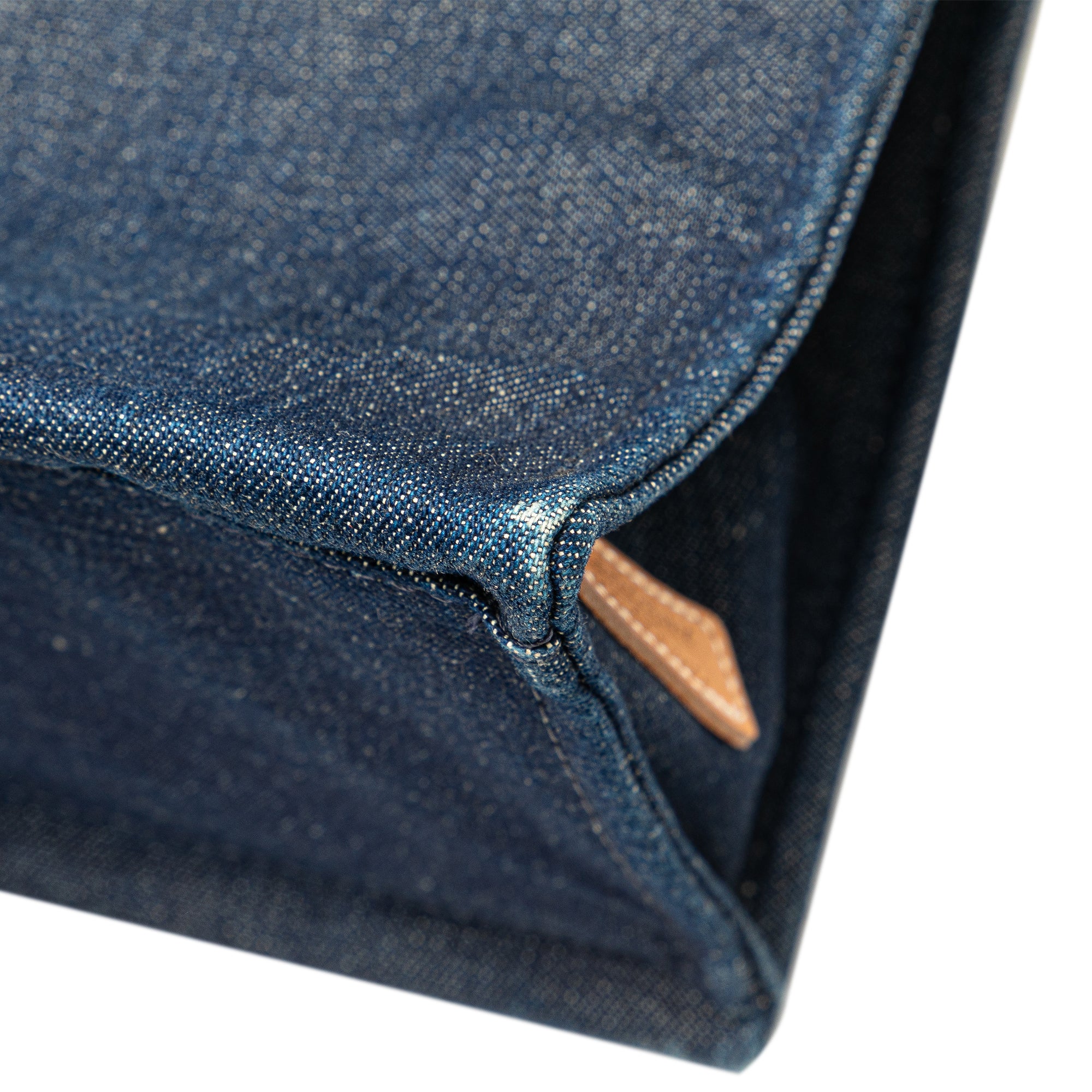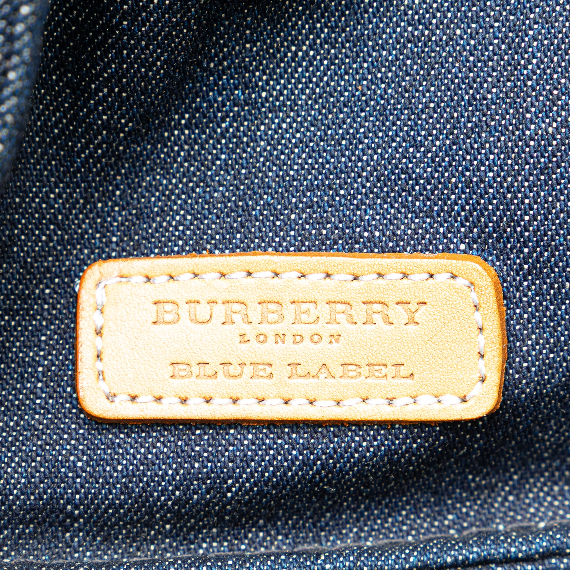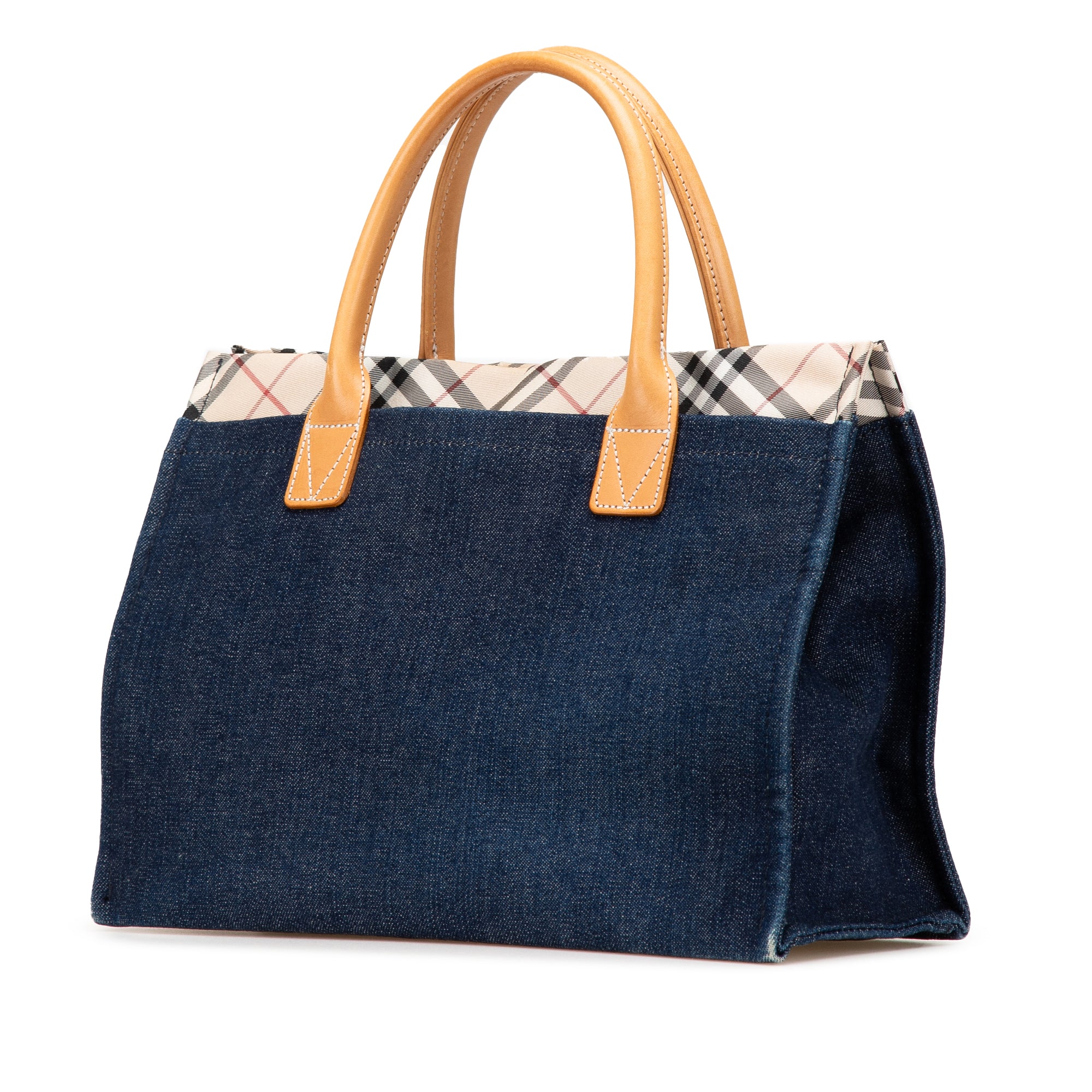 This tote bag features a denim body with nova check canvas trim, rolled leather handles, an open top with snap button closure, and interior zip and slip pockets. Retail Price: 695.00