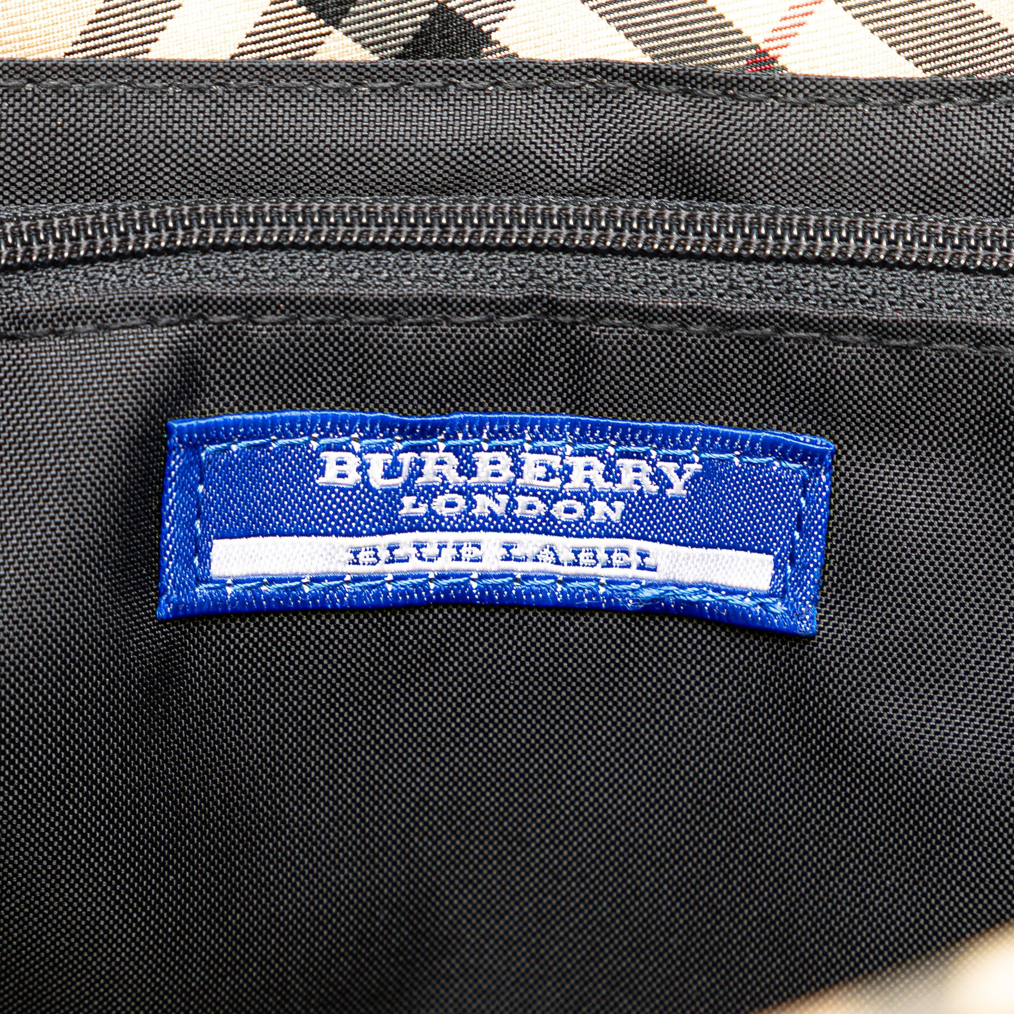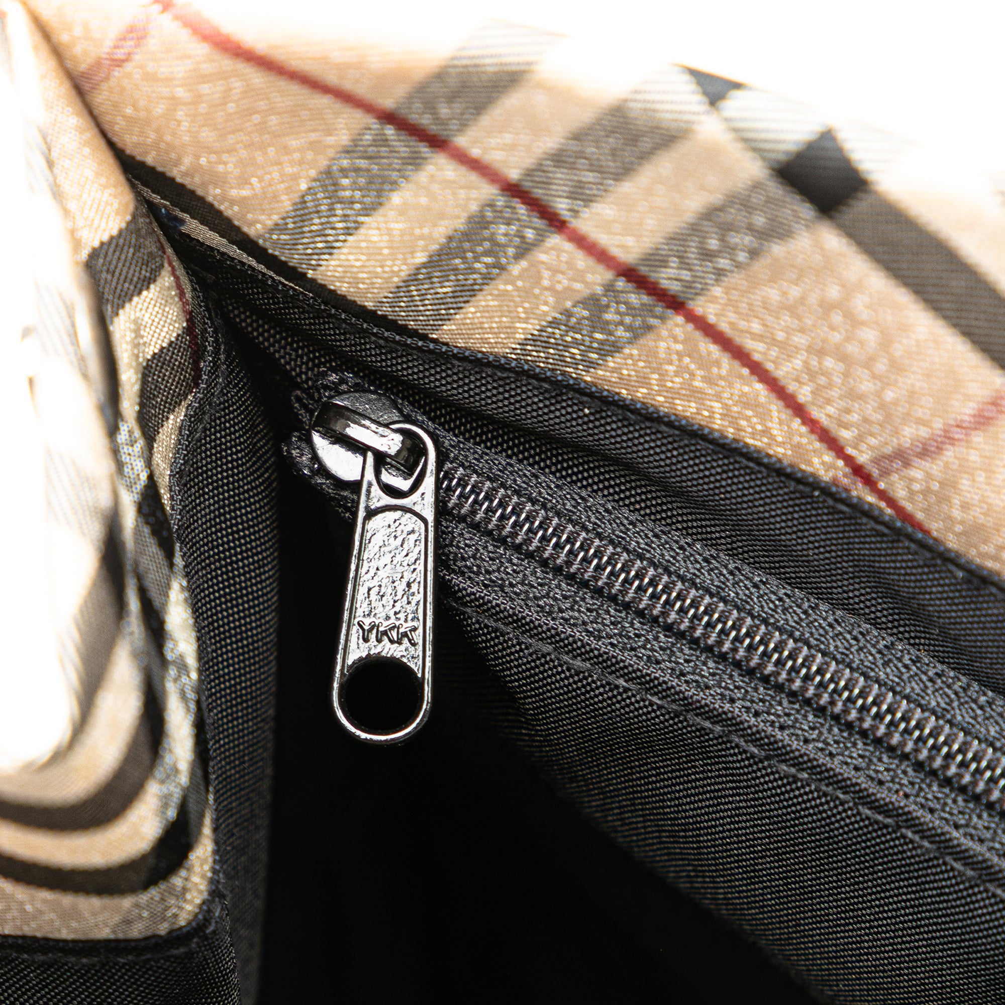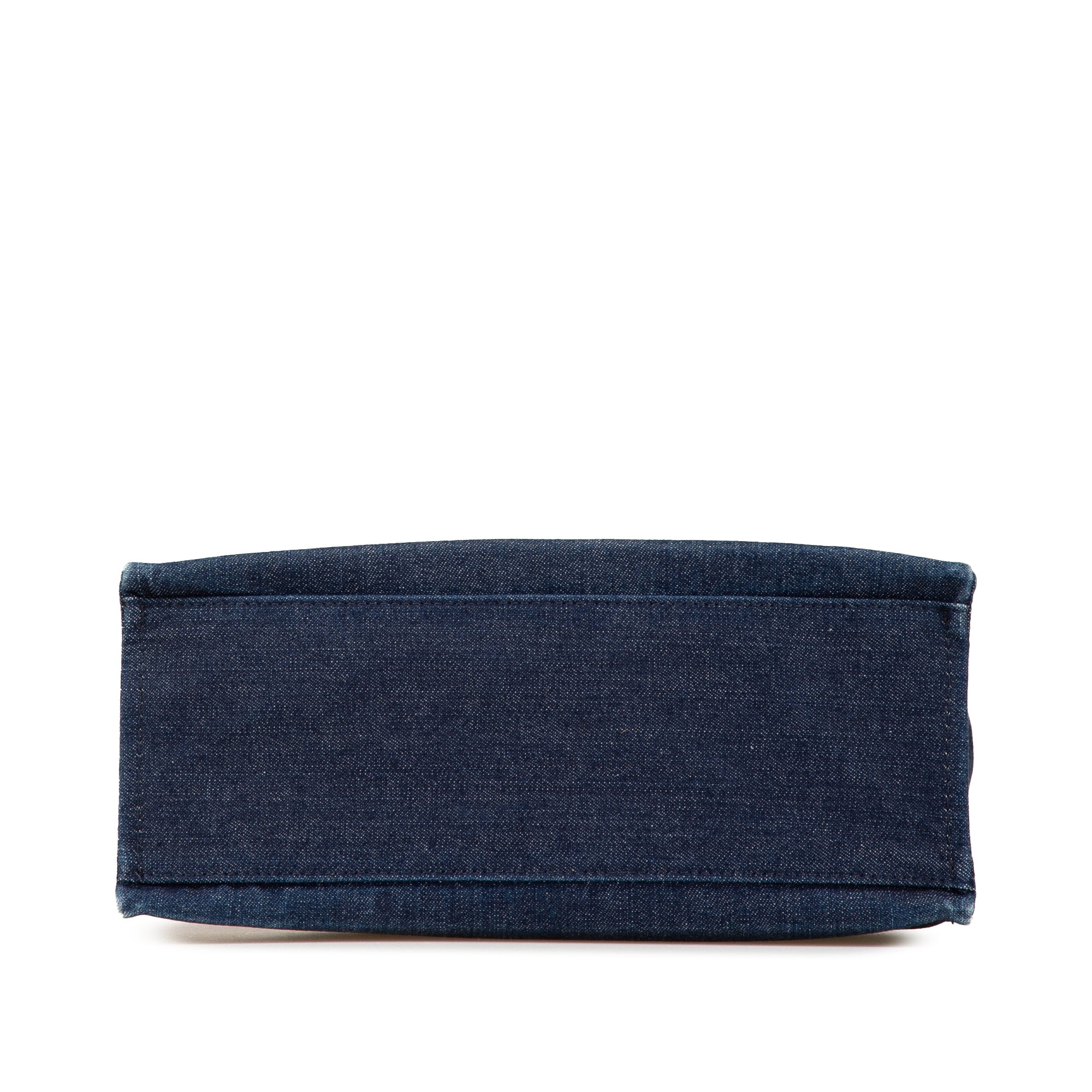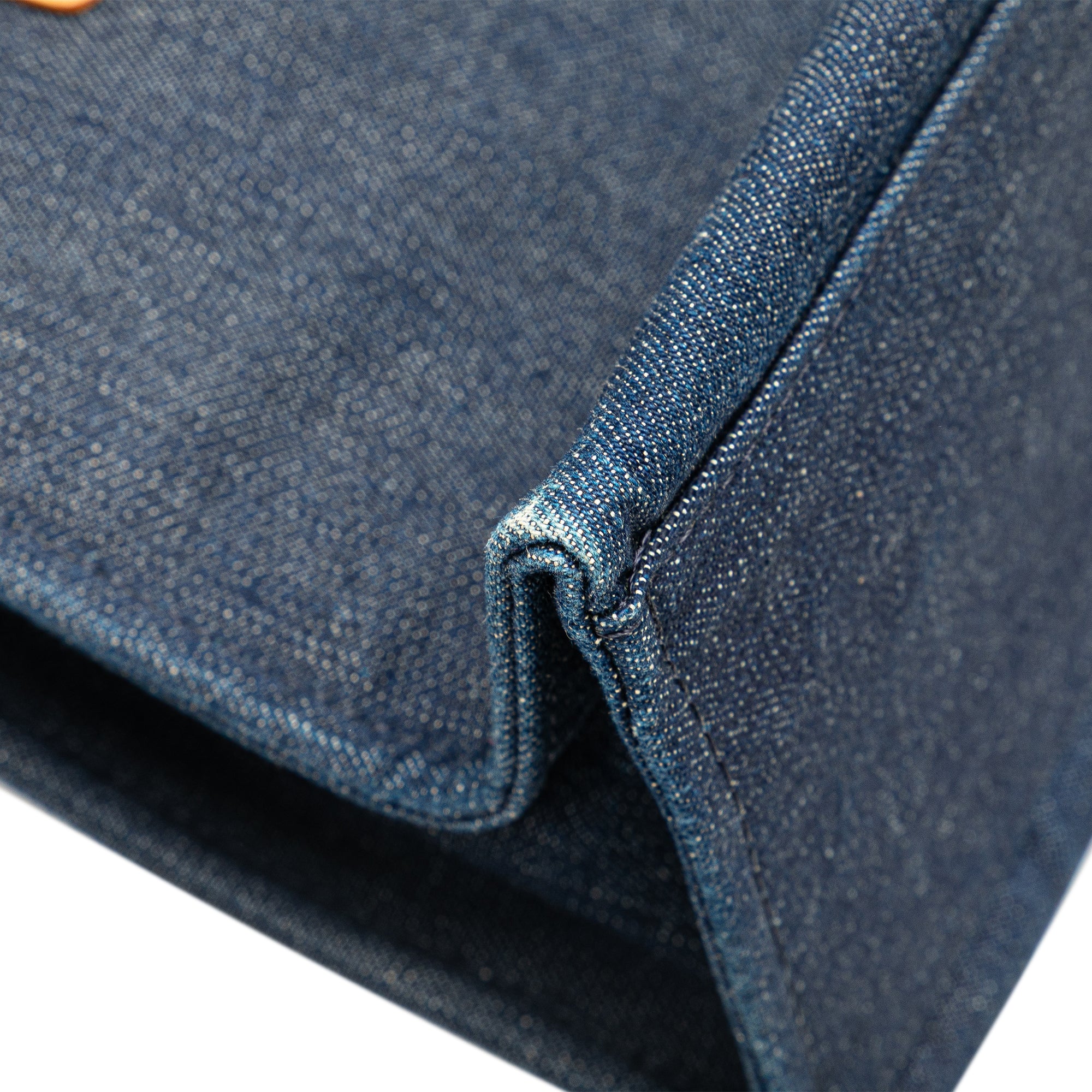 This tote bag features a denim body with nova check canvas trim, rolled leather handles, an open top with snap button closure, and interior zip and slip pockets. Retail Price: 695.00