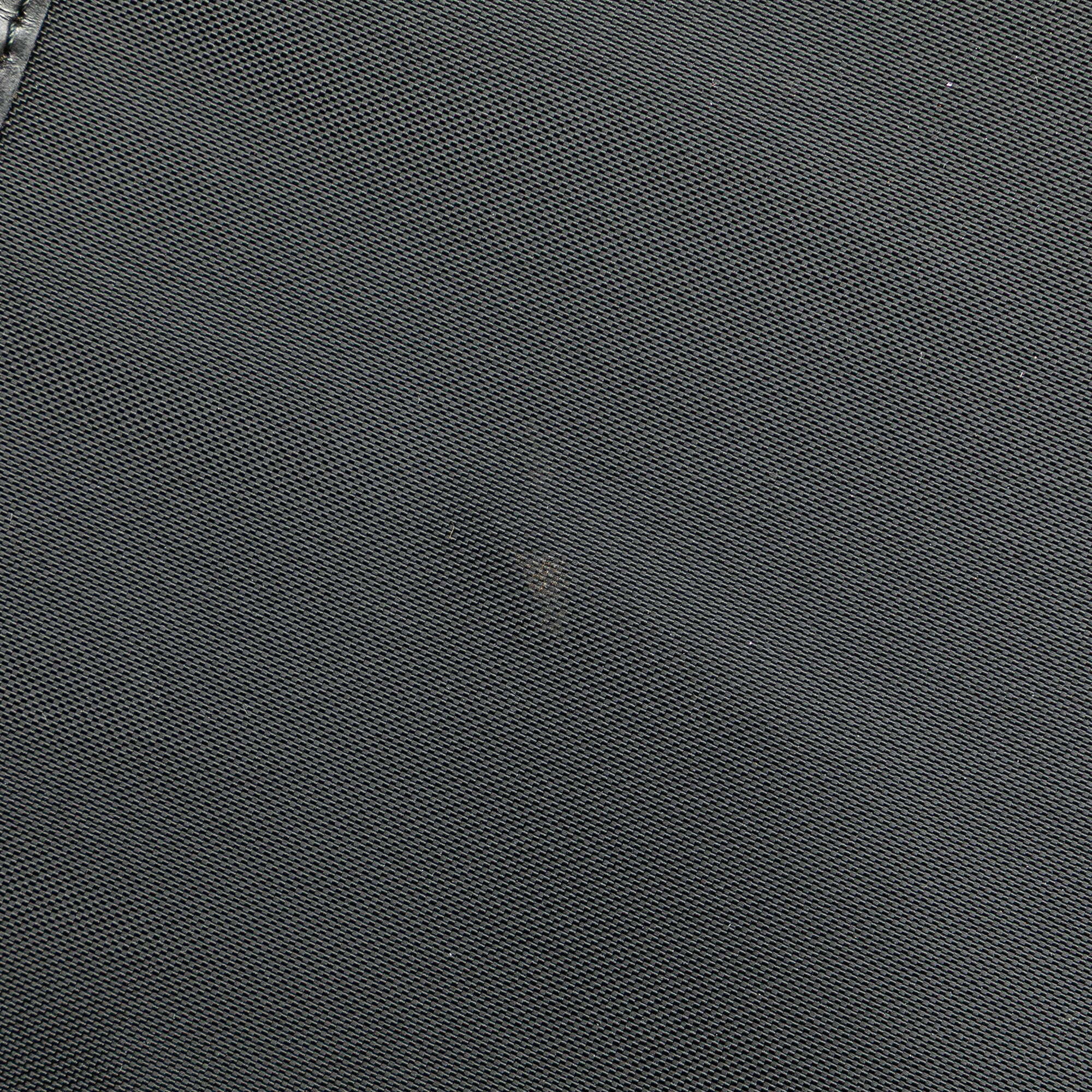 This tote bag features a nylon body with leather trim and nova check canvas side panels, flat leather straps, an open top with magnetic snap closure, and an interior zip pocket. Retail Price: 550.00
