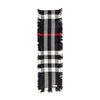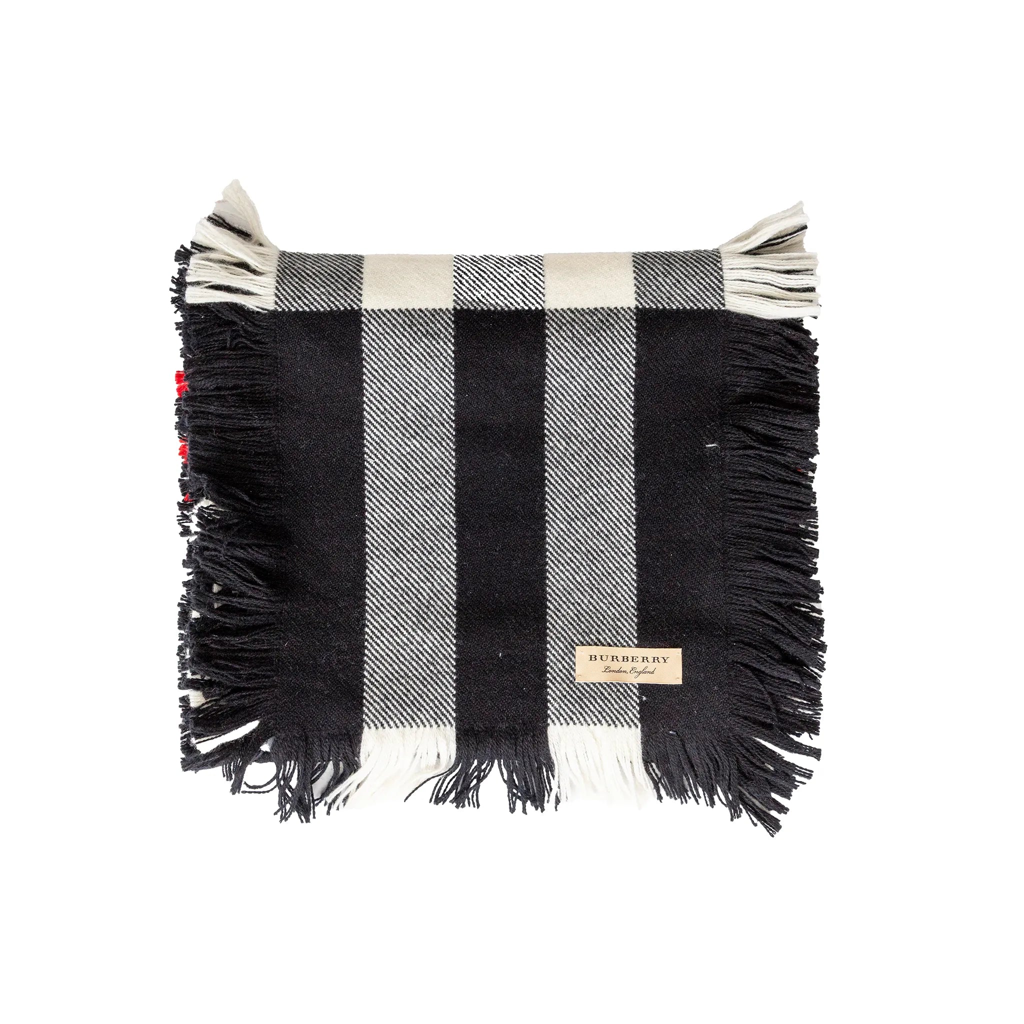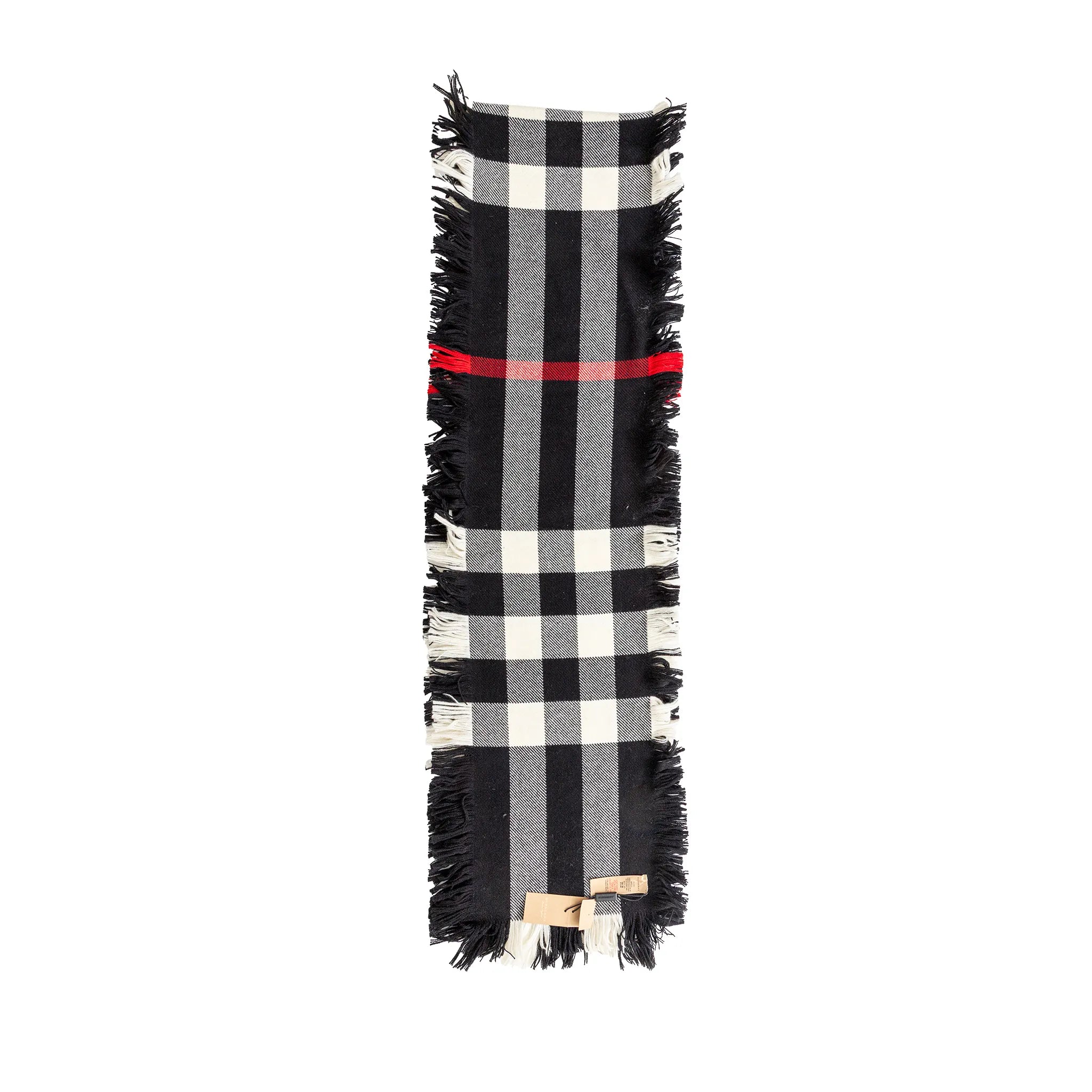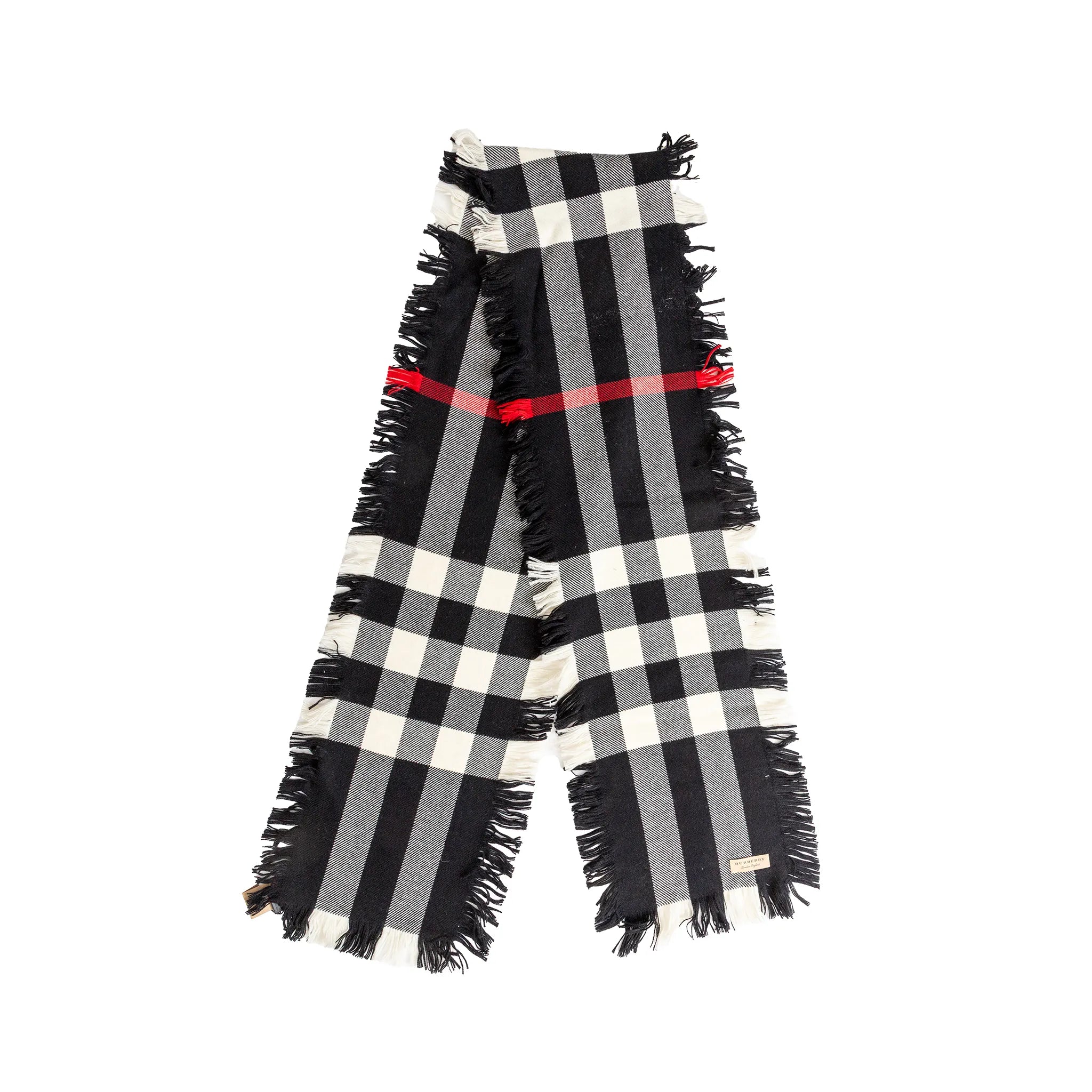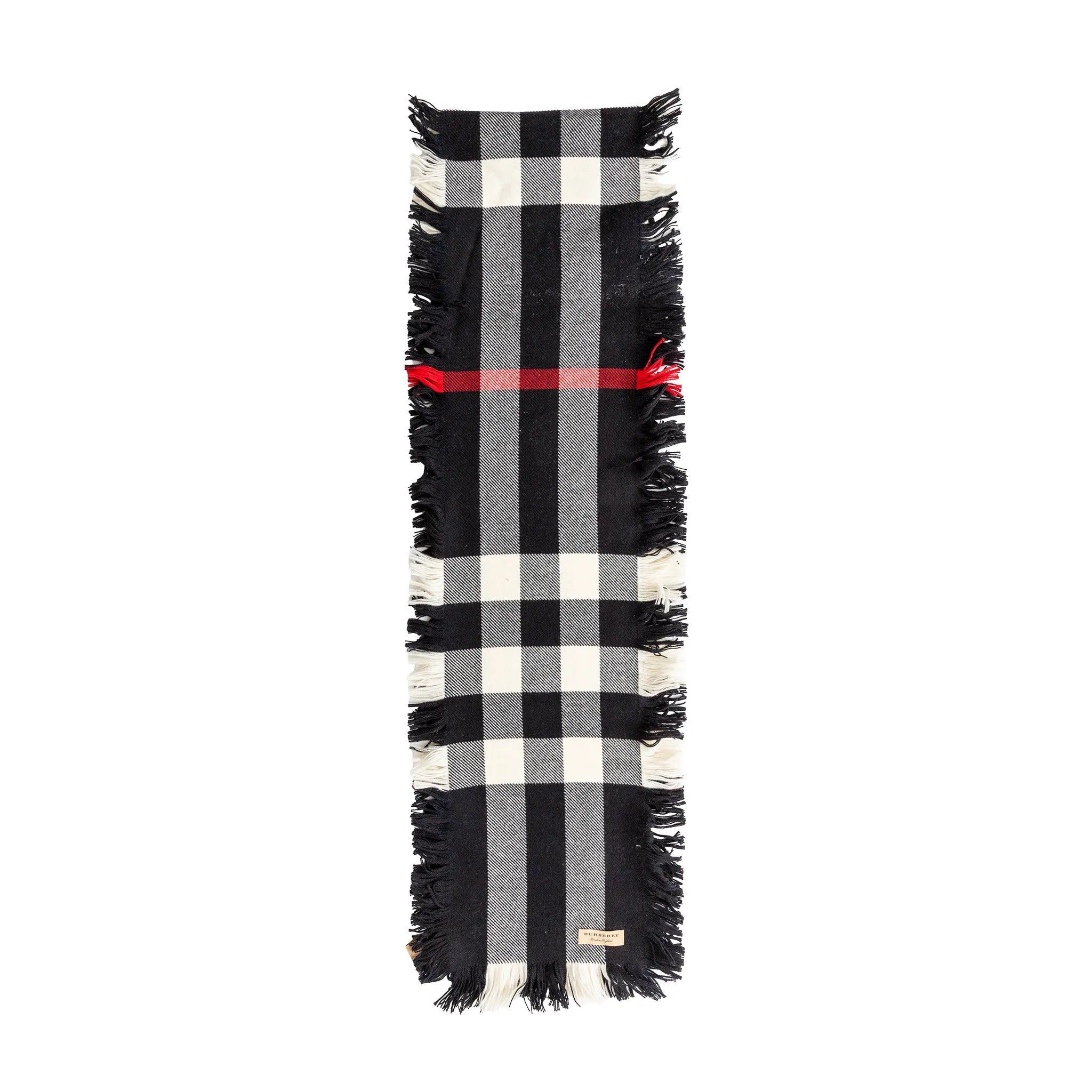 Classic Burberry plaid scarf in 100% soft wool, featuring bold black, white, and red checks with chic fringed edges.